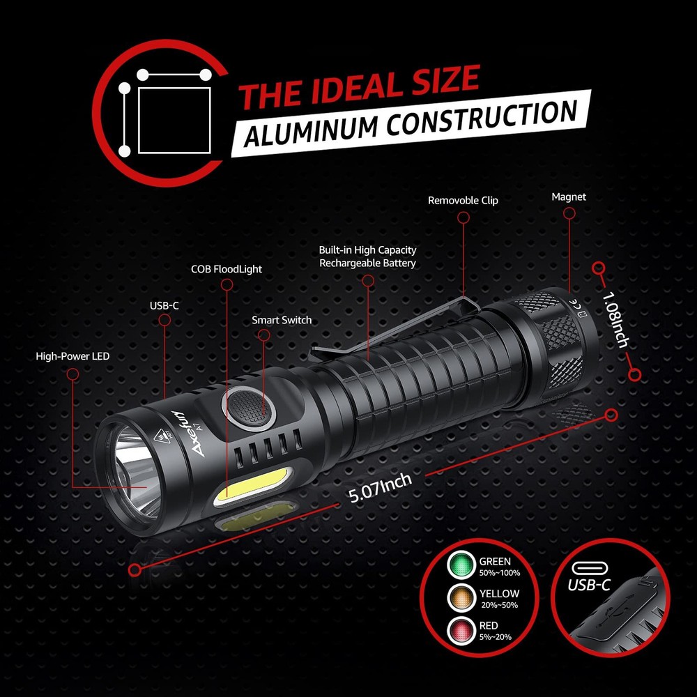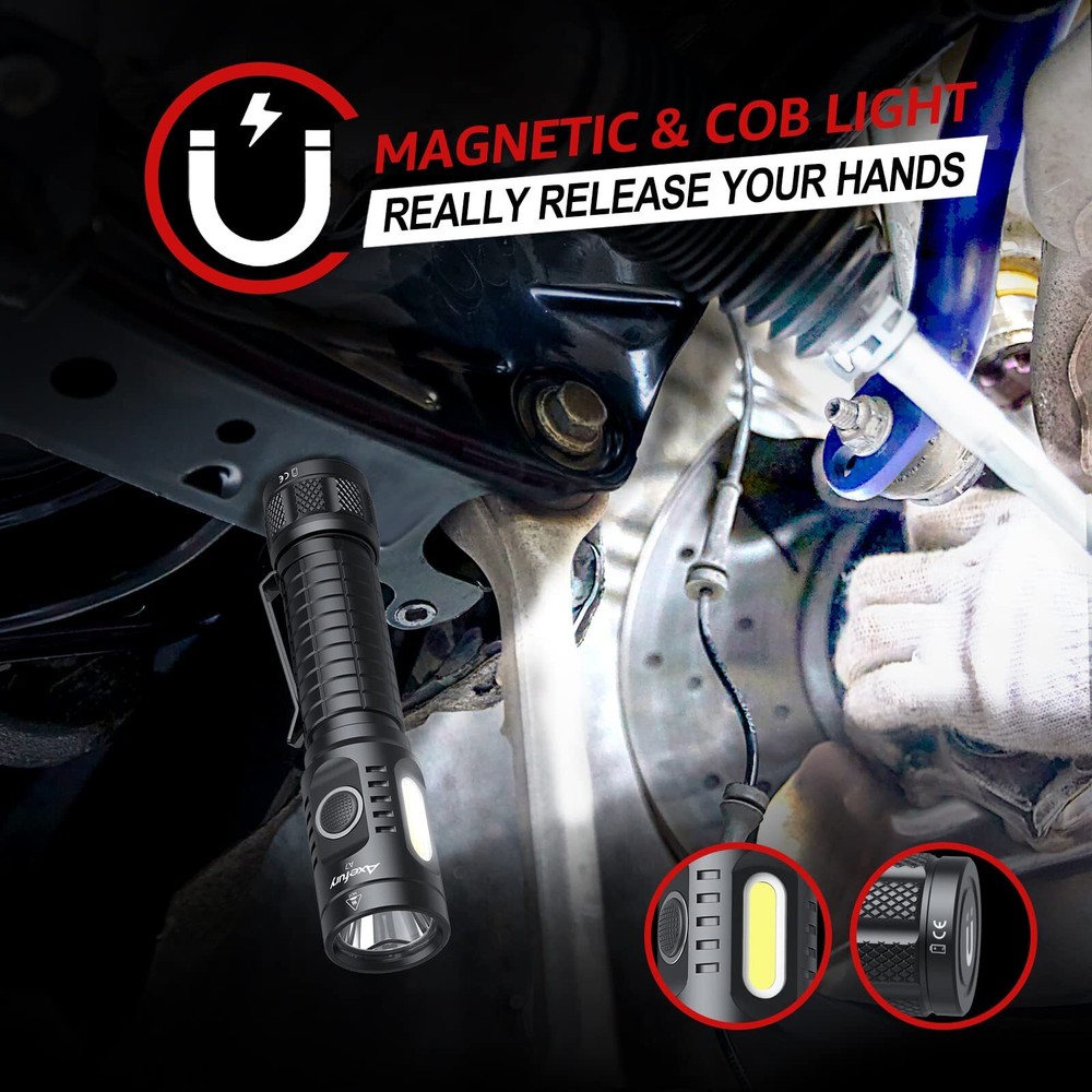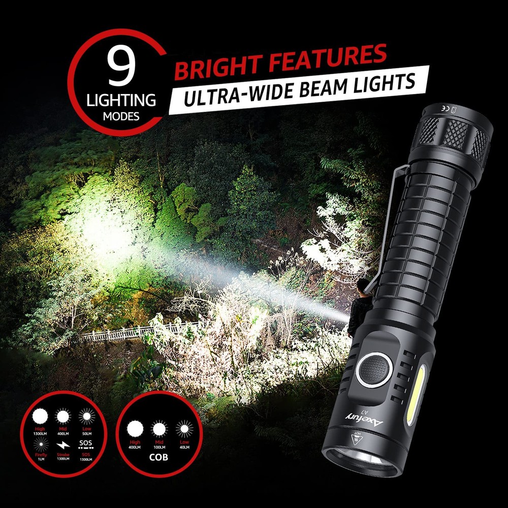 LONG-LASTING & USB CHARGING: A7 Rechargeable flashlight has built in charging port, which has more compatibility and faster charging speed, It has 240 hours runtime on the energy saving mode. MAGNETIC TAIL & COB SIDE LIGHT: A7 High Powered Magnetic LED Flashlight has 1300 lumens maximum output, it is up to 200 meters (656 ft). It also gives you a COB working light on the side which is up to 400 lumens max. A very strong magnetic base built in which allowed you to put the torch on any iron surface. 9 DIFFERENT MODE SELECTIONS & MODE MEMORY FUNCTION: A7 Led flashlight has 9 different light settings:With the main torch it has High 1300 lumens/ Mid 400 lumens/ Low 100 lumens/ Eco 1 lumen/Turbo / Strobe With the COB Work light it has High 400 lumens/ Mid 100 lumens / Low 40 lumens. It has a memory function as well. It will turn on as your last using mode automatically. DURABLE&PORTABLE: This Rechargeable flashlight is Pocket-friendly design, IP67 waterproof and dustproof, made of hard anodizing aircraft grade aluminum alloy,Stainless steel clip is perfect for a backpack or belt, also Contains a sports hand strap to prevent the flashlight from slipping off when running outdoors, this flashlight is the best choice for Maintaining, Camping, Emergency, Hiking. Excellent After-Sales Service- We offer a worry-free 12-month and friendly customer service. If you don't absolutely love the A7 Flashlight or if there are any issues with it.Please kindly apply for replace or refund.please feel free to contact us. We'll reply to you within 24 hours.