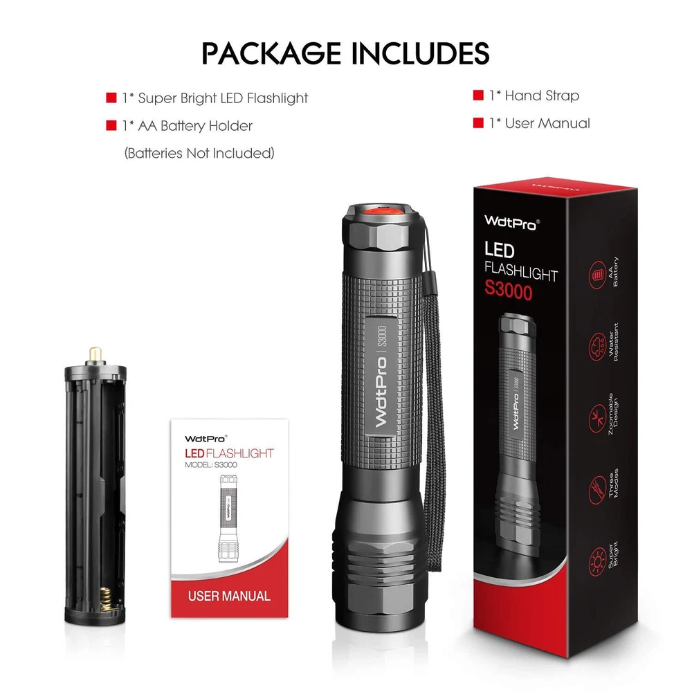 High Lumen LED Flashlight This powerful and durable, mid-size general purpose flashlight is the perfect gift for a father or husband, for any occasion. It is high on power but still compact enough to fit well in your hands, backpack, survival kit, or glove compartment, perfect for camping, hiking, exploring, or even when taking the kids out trick-or-treating. TACTICAL FLASHLIGHT FEATURES Heavy and Solid Construction, promising long-time durability Use OSRAM P8 LED to ensure excellent brightness and over 50,000 hours of use 3 Modes: High / Low / Strobe, easy to operate Easy to adjust the beam from broad to narrow Powered by 4 Standard AA Batteries (Not Included) The aluminum housing with Type II Military Spec anodizing helps make the flashlight extremely durable and abrasion resistant IP67 waterproof, shines even when in heavy raining or 1m submersible for 30 minutes PACKAGE CONTENTS 1x Tactical Flashlight 1x AA Battery Holder (Batteries are not included) 1x User Manual 1x Warranty Card About is dedicated to manufacturing products that use top quality materials and creative designs. We strive to provide the best lighting experience to customers from all over the world. To ensure maximum satisfaction, all our products are strictly inspected at every step. If you are not 100% satisfied with the purchase for any reason, don't hesitate to contact us to request a refund or replacement. 【BRIGHTEST FLASHLIGHT】 With high power LED, the S3000 provides up to 1600 real lumens(Max) but only need 4 * AA batteries (battery not included). This mid-size flashlight is high on power but still compact enough to fit in your hands, backpack, survival kit, or glove compartment 【LONG-LASTING LIGHTING TIME】 Flashlight feature the PDO technology for extreme brightness, providing up to 30 hours (low light mode) of continuous running time, or 6 hours (powerful high light mode) without overheating. Lighting time is twice that of regular tactical flashlights. Lifespan is up to 50000 hours 【3 MODES & ZOOMABLE】 Simply rotating this flash light in or out for a spot light or as flood light; It features only 3 light modes (High / Low / Strobe) which effectively reduces the trouble of switching 5 modes. All for the best using experience 【WATERPROOF & TOUGH】Led flashlight is built with IP67 waterproof, now you can stop worrying about unexpected weather rain or snow. Its enduring, anodized machined aluminum construction promises long-time durability, no matter where you go, best flash light for camping, hiking, emergency situations 【100% SATISFACTION】 Includes a high lumens flashlight. You’ll be pleasantly surprised at the brightness, quality, durability and performance or we will refund your money no questions asked. 90 days money back & 2 years replacement guarantee. Buy with confidence