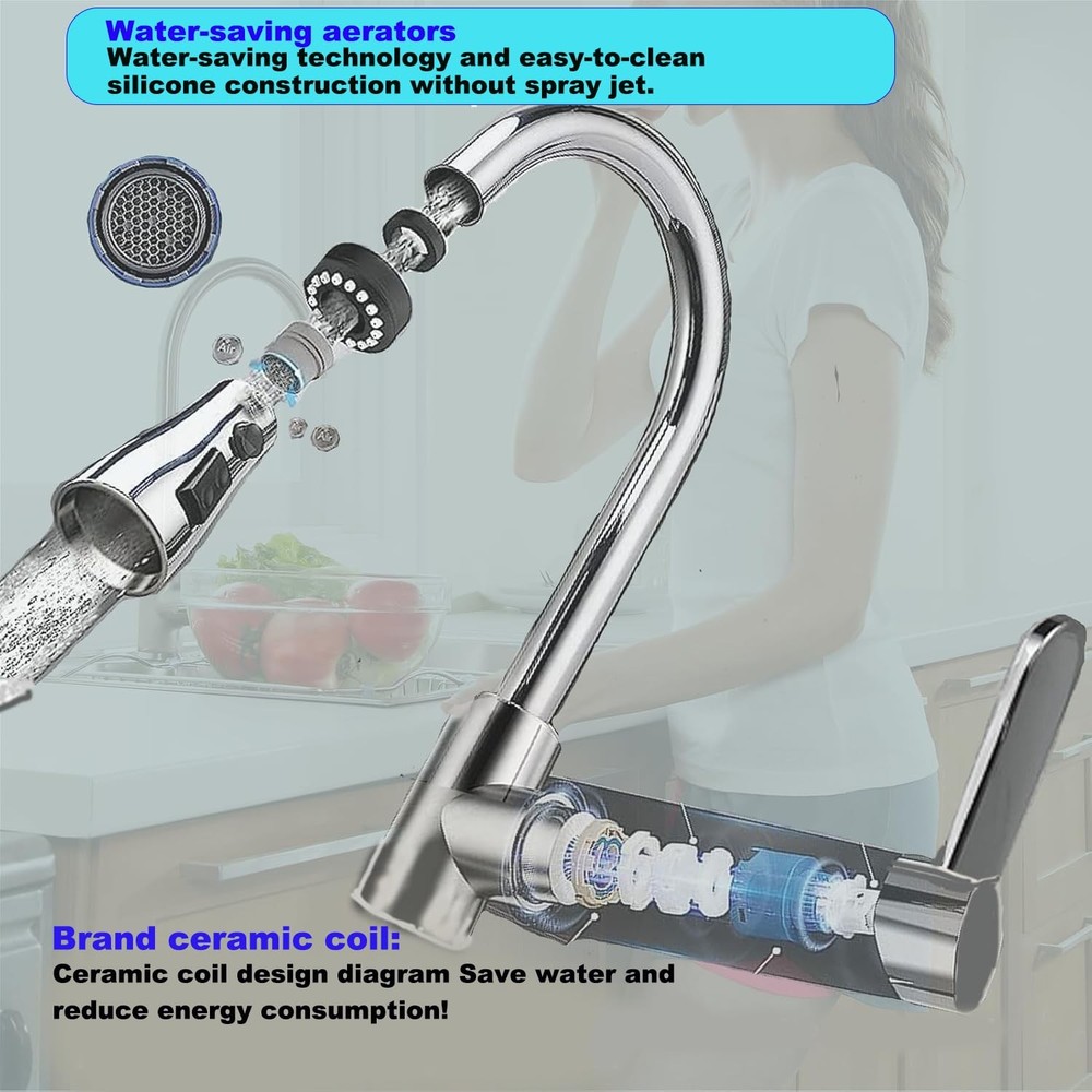 Extendable Pull-out Kitchen Faucet,360° Swivel Kitchen Faucet,High Pressure Kitchen Faucet,3 Function Stainless Steel Kitchen Sink Faucet (Chrome-Plated - Large Head) ▰ [MULTIFUNCTIONAL SPRAY]: this kitchen faucet has 3 mode settings (spray mode, mist mode, pause). Spray Mode - Uniform and splash-free, you can fill pots and pans with water and wash fruits and vegetables. Spray Mode - Powerful cleaning, you can quickly clean dishes and sinks. Pause mode - By pressing the pause button, you can interrupt the jetting process at any time. High pressure design and saves water. Suitable for any type of kitchen and bathroom decor. ▰[Modern Craftsmanship Design]:The kitchen tap is equipped with an extendable high arc spout and the shower head can be swivelled 360°. The total length of 60cm extendable spray head can cover almost all sinks or multiple areas. It can meet the design of two sinks or the operation requirements of large cleaning areas; making washing and cleaning more convenient and efficient. ▰[CLASSIC APPEARANCE DESIGN]:Our pull-out kitchen faucet has a fashionable and simple appearance, which allows you to create different kitchen styles. Kitchen taps with popular design give your kitchen a stylish highlight; Durable; Freestanding kitchen pull-out taps with solid base will make the taps more stable; Various plating colours on the surface are beautiful and moisture-proof, anti-embroidery, so that kitchens, bathrooms, etc. are always clean. ▰[Ceramic Spool & Premium Material]:Made of high quality stainless steel material, lead and nickel free kitchen pull out faucet is safer than regular faucets, so you can use kitchen mixer faucet. High quality stainless steel can prevent the pull out faucet from rusting or corroding, providing a longer service life. Ceramic Spool-3.0 porcelain disc mixer spool technology, durable no leakage, no noise, even longer service life. ▰[EASY INSTALLATION & QUALITY AFTER-SALES]:This pull-out kitchen faucet is suitable for all kitchen sinks. Follow the steps in the instructions to install it in minutes, using kitchen faucet hole diameter: 33-35mm, maximum installation countertop thickness: 40mm, general 9/16 connection. We provide 18 months warranty. You have any questions, please contact us in time, there is a professional team to solve your problems.
