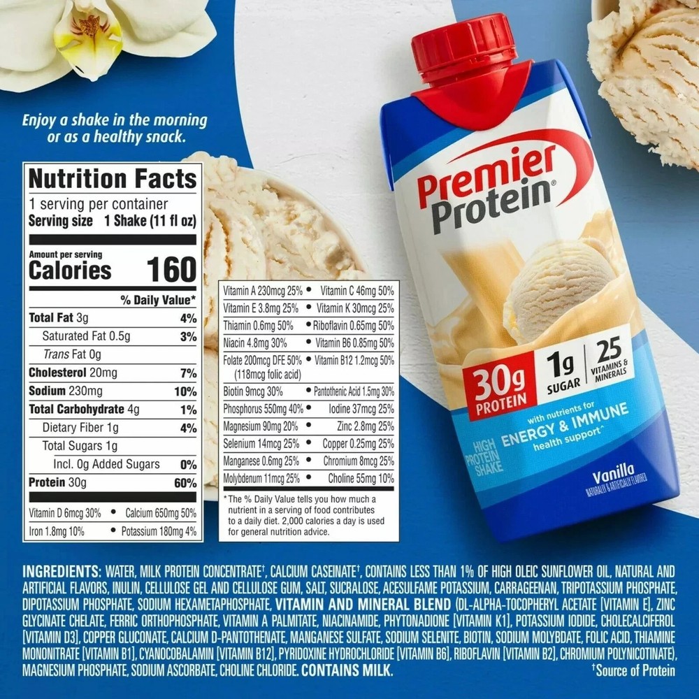 Premier 30g Protein PLUS Energy and Immune Support Shakes, Vanilla, 18-pack.