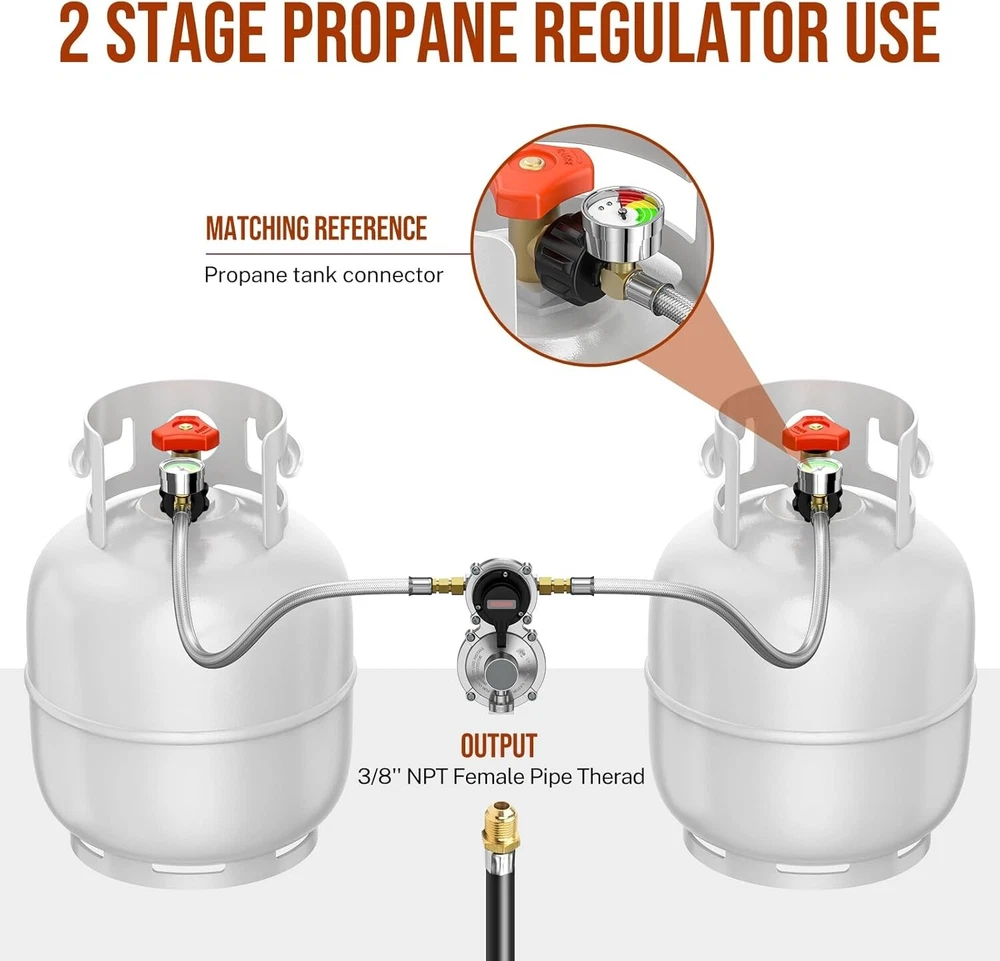 High-Quality 2-Stage Propane Regulator with Dual 18-Inch Pigtail Hoses & Gauge ‹ › ‹ › ‹ › ‹ › ‹ › ‹ › ‹ › ‹ › ‹ › High-Quality 2-Stage Propane Regulator Complete with Dual 18-Inch Pigtail Hoses & Gauge Key Features: Innovative Functionality: Effortlessly connect two propane tanks simultaneously. Automatic Switch: The regulator seamlessly transitions from the primary to the reserve tank when gas is depleted, ensuring uninterrupted service. Color-Coded Indicator: The rotary pointer lets you designate which tank is in use, with a color-changing gauge to signal when a refill is needed. Durability You Can Trust: Superior Materials: Crafted from 100% solid brass and stainless steel braided material for unmatched durability and longevity. CSA Certified: All fittings meet top safety standards, assuring you a secure connection. Specifications: Primary Cylinder Capacity: 210,000 BTU/hr Reserve Cylinder Capacity: 130,000 BTU/hr Inlet: 1/4" SAE Inverted Flare Outlet: 3/8" Female NPT Pigtail Hose: 1/4" Male Inverted Flare with QCC1 Fitting Versatile Applications: Ideal for RVs, campers, and travel trailers with dual propane tank systems. Compatible with 5-40 lb refillable propane tanks or LP gas tanks. Replace any existing automatic changeover regulator in your RV or camper systems to maintain constant gas flow. Packaging Includes: 1 x 2 Stage Auto Changeover RV Propane Regulator 2 x 18'' Stainless Braided QCC1 1/4" Inverted Male Flare RV Pigtail Propane Hoses with Gauge 1 x Roll Sealing Tape 1 x Wrench Customer Satisfaction Guarantee: Enjoy peace of mind with a 2-year satisfaction guarantee. If you are not completely satisfied with your purchase, contact us for a free replacement or refund. Our dedicated customer service team is available within 24 hours to assist with any inquiries. Shipping Free & Fast Shipping - We offer free shipping to most of the USA with a normal delivery time of 3-7 days. However, due to the current situation, additional delivery time (up to 3 weeks) may be required for some items. Alternative Carriers - We may use alternative carriers (e.g. USPS, FedEx, UPS, etc.) to ensure your package arrives safely and on time. Due to the use of multiple carriers, we are unable to provide a tracking number automatically. Handling Time - Orders are processed and shipped within 1-2 business days of receiving cleared payment. Shipping Restrictions - Shipping to Alaska, Hawaii, Puerto Rico, Guam, and other US territories may incur shipping charges or delivery restrictions. Please contact us before ordering, or your order can be refunded/cancelled. State Restrictions - There may be restrictions based on your state of purchase. For example, certain items may not be shipped to California due to state regulations. Contact for Tracking Updates - If you require tracking updates or have any concerns about the delivery of your order, please feel free to contact us, and we will be happy to assist you. Return 30-Day Hassle-Free Returns - We want you to be completely satisfied with your purchase. If you are not, you can return the item within 30 days of receiving it for a full refund or exchange. Easy Return Process - To start a return, simply contact us and we will provide you with a prepaid return shipping label and detailed instructions. Restocking Fee - There are no restocking fees for returns. However, the buyer is responsible for return shipping costs if the return is not due to a seller's error. Refund Processing Time - Refunds will be processed within 5 business days of receiving the returned item in its original condition. Payment We accept all major credit cards, PayPal, and Apple Pay for your convenience. Your payment information is secure and encrypted to ensure a safe and seamless transaction. Please complete your payment within 3 days of purchase to avoid any delays in shipping. Feedback Your feedback is extremely important to us. We strive to provide the best products and customer service possible. If you are satisfied with your purchase, please take a moment to leave us a positive review. If you have any concerns or issues with your order, please contact us before leaving negative feedback. We are committed to resolving any problems and ensuring your satisfaction. Contact Us If you have any questions or concerns, please feel free to reach out to our customer support team. You can contact us through the eBay messaging system. We are available Monday to Friday, 9:00 am to 5:00 pm EST, and we will do our best to respond to your inquiry within 24 hours. Thank you for supporting our small family business! Manufacturer Part Number: RV Propane Regulator and Hose UPC: Not Set MPN: Not Set Unit Quantity: 2 Brand: Unbranded Part Type: Accessories Country/Region of Manufacture: Not Set Warranty: 2 Year Unit Type: lb
