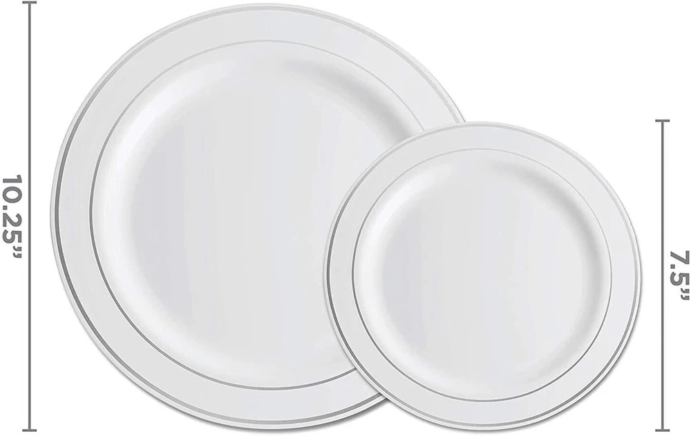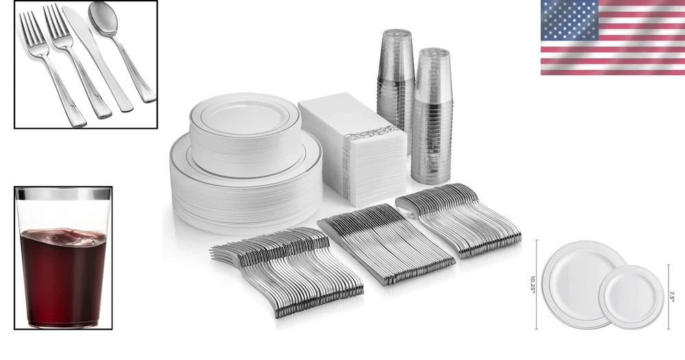 High-Quality 350 Piece Disposable Dinnerware - Silver Plates, Cups & Silverware ‹ › ‹ › ‹ › ‹ › ‹ › ‹ › ‹ › ‹ › ‹ › High-Quality 350 Piece Disposable Dinnerware Elevate your gatherings with this exquisite set of disposable dinnerware, featuring elegant silver plates, cups, and silverware, designed to impress and indulge your guests. Perfect for everything from weddings to casual picnics, this collection is the epitome of sophistication and convenience. What’s Included: 50 Premium Heavy Duty 10.25" Dinner Plates 50 7.5" Salad, Dessert & Appetizer Plates 50 Count 10 Oz Clear Fancy Disposable Silver Rimmed Plastic Party Cups 50 Soft and Absorbent Disposable Linen-Feel Paper Hand Towels Disposable Plastic Silverware Set: 50 Plastic Forks, 50 Plastic Spoons, 50 Plastic Knives Features: Premium quality disposable dinnerware, ensuring both elegance and convenience. Made from durable 100% food grade BPA free, non-toxic heavy duty plastic. Bulk pack of 350 pieces seamlessly accommodates up to 50 guests. Sophisticated silver rim design adds a touch of elegance to any occasion. Benefits: Time-saving: No need for clean-up; simply toss the dinnerware when you’re done. Perfect for a wide array of events: Ideal for weddings, receptions, birthdays, holidays, picnics, catered events, and more. Soft linen-feel hand towels add a touch of luxury and comfort. The combination of quality and elegance ensures that your events will impress your guests. Why Choose Our 350 Piece Disposable Dinnerware Set? If you’re looking for a way to elevate your dining experience without the hassle of traditional clean-up, this high-quality disposable dinnerware set is your answer. Offer your guests an exquisite dining experience that is both practical and stylish. Each piece is crafted for durability, ensuring your special occasions are as memorable as they are effortless. Don’t compromise on elegance—choose our 350 Piece Disposable Dinnerware Set for your next event and make every occasion extraordinary! Shipping Free & Fast Shipping - We offer free shipping to most of the USA with a normal delivery time of 3-7 days. However, due to the current situation, additional delivery time (up to 3 weeks) may be required for some items. Alternative Carriers - We may use alternative carriers (e.g. USPS, FedEx, UPS, etc.) to ensure your package arrives safely and on time. Due to the use of multiple carriers, we are unable to provide a tracking number automatically. Handling Time - Orders are processed and shipped within 1-2 business days of receiving cleared payment. Shipping Restrictions - Shipping to Alaska, Hawaii, Puerto Rico, Guam, and other US territories may incur shipping charges or delivery restrictions. Please contact us before ordering, or your order can be refunded/cancelled. State Restrictions - There may be restrictions based on your state of purchase. For example, certain items may not be shipped to California due to state regulations. Contact for Tracking Updates - If you require tracking updates or have any concerns about the delivery of your order, please feel free to contact us, and we will be happy to assist you. Return 30-Day Hassle-Free Returns - We want you to be completely satisfied with your purchase. If you are not, you can return the item within 30 days of receiving it for a full refund or exchange. Easy Return Process - To start a return, simply contact us and we will provide you with a prepaid return shipping label and detailed instructions. Restocking Fee - There are no restocking fees for returns. However, the buyer is responsible for return shipping costs if the return is not due to a seller's error. Refund Processing Time - Refunds will be processed within 5 business days of receiving the returned item in its original condition. Payment We accept all major credit cards, PayPal, and Apple Pay for your convenience. Your payment information is secure and encrypted to ensure a safe and seamless transaction. Please complete your payment within 3 days of purchase to avoid any delays in shipping. Feedback Your feedback is extremely important to us. We strive to provide the best products and customer service possible. If you are satisfied with your purchase, please take a moment to leave us a positive review. If you have any concerns or issues with your order, please contact us before leaving negative feedback. We are committed to resolving any problems and ensuring your satisfaction. Contact Us If you have any questions or concerns, please feel free to reach out to our customer support team. You can contact us through the eBay messaging system. We are available Monday to Friday, 9:00 am to 5:00 pm EST, and we will do our best to respond to your inquiry within 24 hours. Buy it now and enjoy a pleasant shopping experience! UPC: 739992999008 Unit Quantity: 350 Material: Plastic Theme: Not Set Occasion: All Occasions,Weddings,Receptions,Birthday Parties,Holidays,Picnics,Catered Events Set Includes: Complete,Dinner Plates,Salad Plates,Plastic Cups,Napkins,Plastic Spoons,Plastic Forks,Plastic Knives Features: Not Dishwasher Safe,Not Microwaveable,Hand Wash Only Character: Not Set Department: Kids,Adults,Unisex Brand: Unbranded Type: Dinnerware Set Color: Silver Number of Place Settings: 50 Number of Compartments: Not Set Shape: Round Pattern: Solid Style: Not Set MPN: Not Set Country/Region of Manufacture: Not Set Character Family: Not Set Year Manufactured: Not Set Finish: Glossy Number of Items in Set: 350-Piece Plate Diameter: 10.25 in Manufacturer Warranty: Not Set Model: Not Set Unit Type: Not Set Original/Reproduction: Not Set