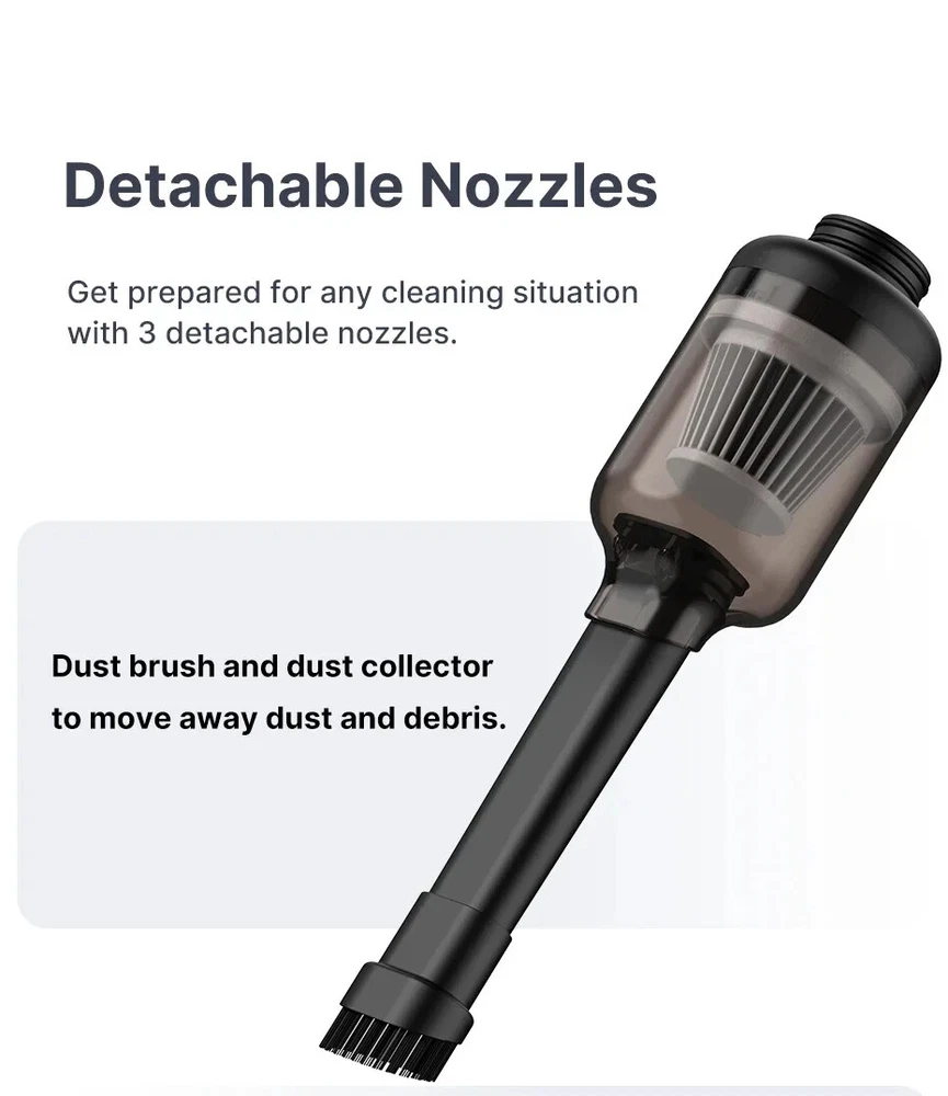 The Electric Air Duster Kit is the perfect companion for the Powerful Electric Air Duster . It includes 5 essential accessories: a dust brush, dust collector, 6mm nozzle, 8mm nozzle, and 16mm nozzle. This kit is ideal for cleaning cameras, computer keyboards, pet houses, car interiors, window tracks, and more. Specifications: Dust Collector Dimensions: Φ53.2*112mm Net Weight: 55.8g Dust Brush Dimensions: 31.5*26.2*140.2mm Net Weight: 17.9g 6mm Nozzle Dimensions: 6.6*33.6*55.3mm Net Weight: 3.5g 8mm Nozzle: Dimensions: 8.2*33.8*55.1mm Net Weight: 3.9g 16mm Nozzle: Dimensions:16.7*33.6*51.1mm Net Weight: 6.2g
