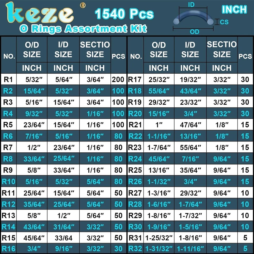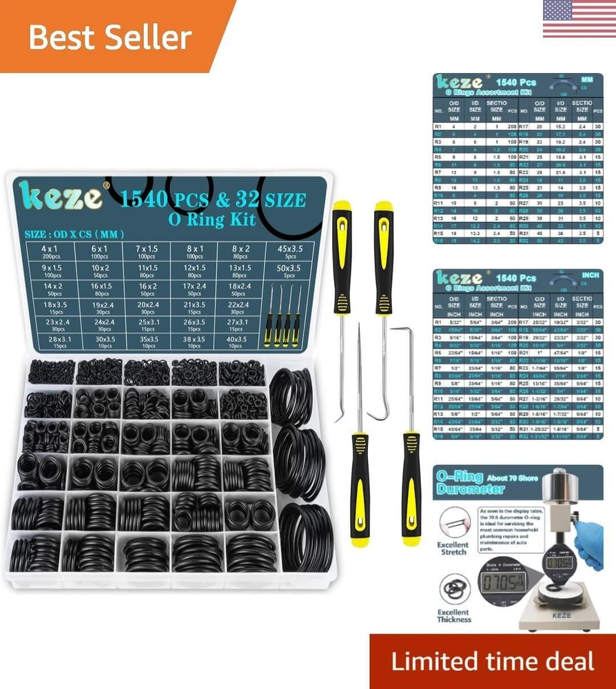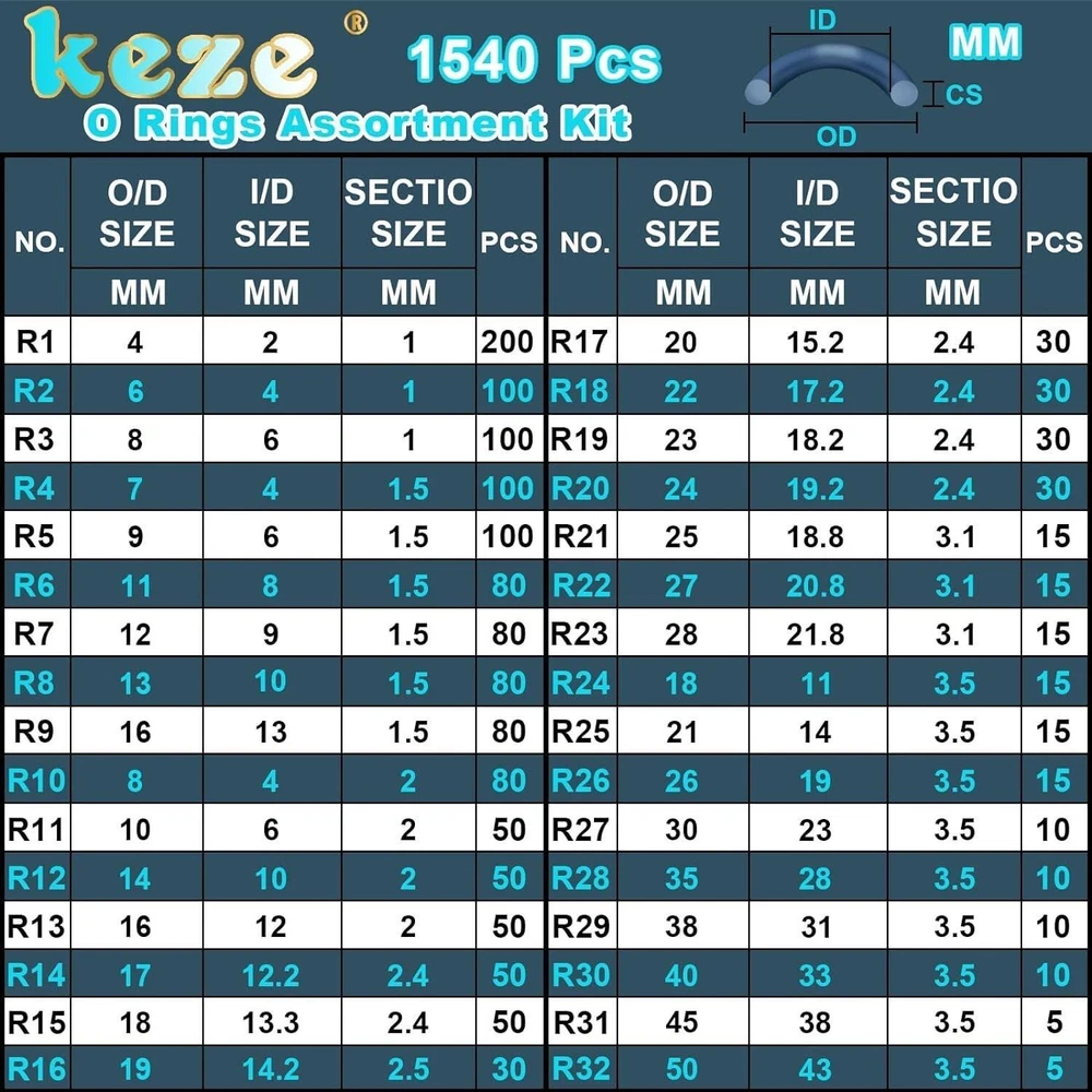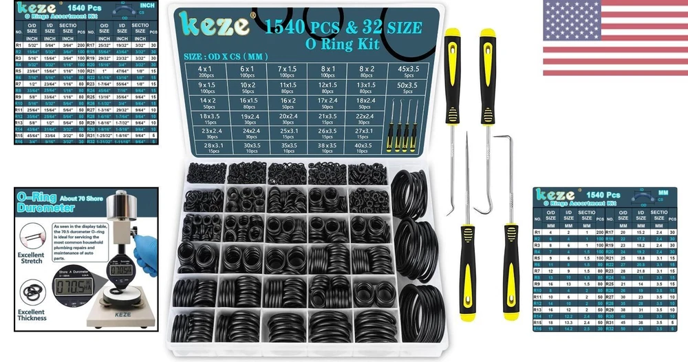 32 Size 1540 Pcs Rubber O Rings Assortment Kit with Pick and Hook Set for Assorted Faucet Plumbing Pressure Washer Automotive Repair,Air or Gas Sealing Connections O ring OD:4mm-50mm - OD 32 Size Metric O Rings MULTI SIZE:O ring set contains 32 metric size:OD X Thk=4x1mm/ 6x1mm/ 7x1.5mm / 8x1mm/ 8x2mm/ 9x1.5mm/10x2mm/ 11x1.5mm/ 12x1.5mm/ 13x1.5mm/ 14x2mm/ 16x1.5mm/16x2mm/17x2.4mm/ 18x2.4mm/ 18x3.5mm/ 19x2.4mm/ 20x2.4mm/ 21x3.5mm/ 22x2.4mm/ 23x2.4mm/ 24x2.4mm/ 25x3.1mm/ 26x3.5mm/ 27x3.1mm/ 28x3.1mm/ 30x3.5mm/ 35x3.5mm/ 38x3.5mm/ 40x3.5mm/ 45x3.5mm/ 50x3.5mm O RING PICK SET:O rings assortment kits comes with 4-piece precision pick and hook set,includes 1 pc full hook;1 pc 45-degree pick;1 pc 90-degree pick;1 pc straight pick,each is designed with high torque acetate handles and precision tips for use on car auto oil seal/O-ring seal gasket pick clips,wire,o-rings,gaskets and other precision fasteners and components WIDE APPLICATION:Assorted O-ring kit for faucets plumbing, pressure washer,hose nozzles,sinks,auto engines,machinery bearings, pumps,boats,oils,gas control valve,spray,air,kitchen bathroom water fitting seal leak repair HIGH-QUALITY MATERIAL:Black o'ring made of high-quality commercial grade nitrile rubber (NBR) material,it has excellent high temperature and low temperature resistance,the working temperature range is from -40℉ (-40℃) to +248℉ (+120℃),maintains good elasticity,has It has the advantages of ozone resistance and weather resistance PACKAGING FEATURES:Small O-rings rubber kit the 32 sizes are placed in a sturdy plastic storage box in order,and each size is attached with detailed label paper,which is very convenient to use,o rings are stored in order of small to large for easy retrieval