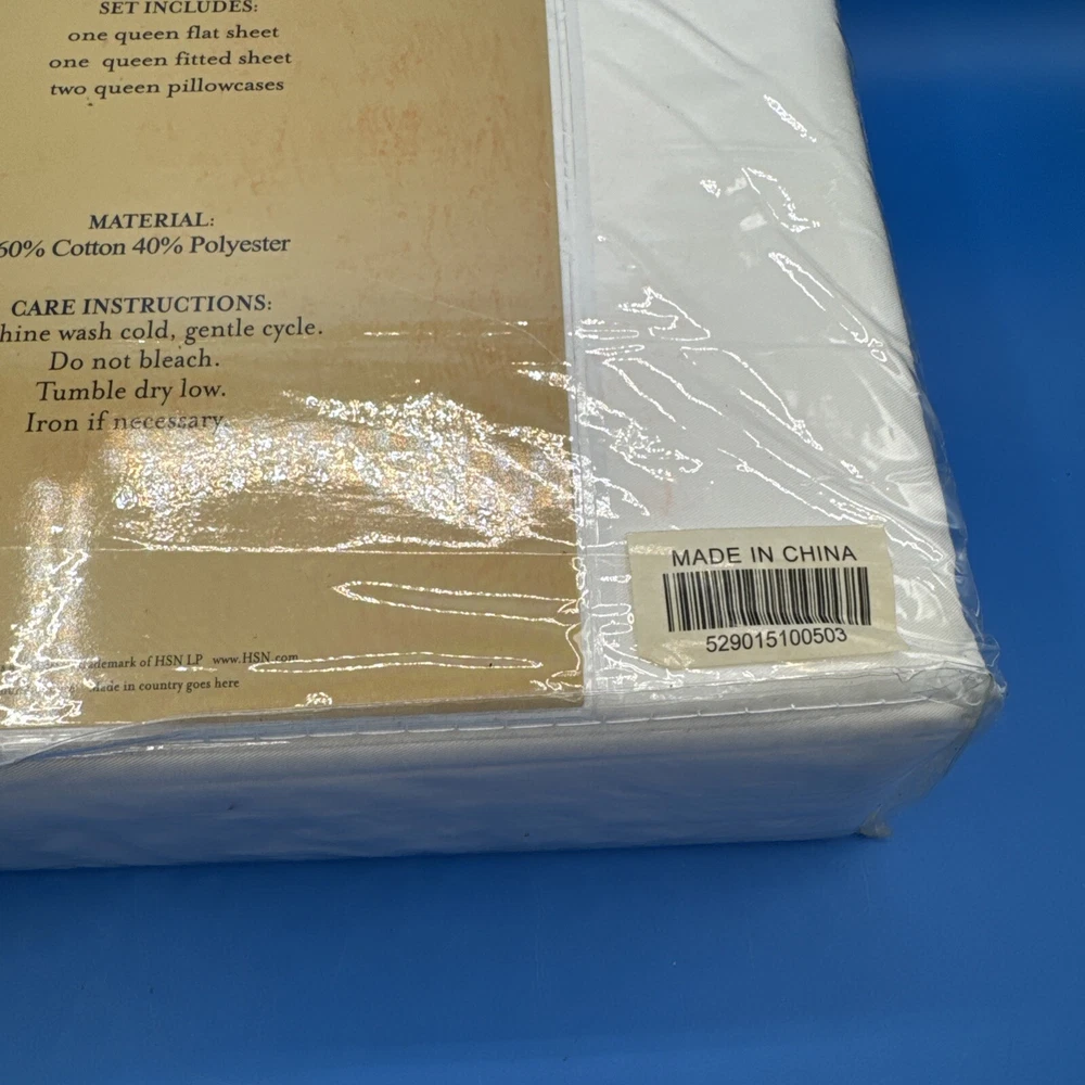 This is a luxurious Highgate Manor Queen Sheet Set in Ivory, featuring a solid color design with majestic crewel embroidery. Made from a blend of 60% Cotton and 40% Polyester, this sheet set has a thread count of 600. Perfect for the bedroom, this set is both elegant and comfortable. Made in China. New in original packaging. Never been removed from the packaging. Excellent condition. Machine wash cold, gentle cycle. No bleach. Size queen. Set includes 1 flat sheet, 1 fitted sheet, and 2 pillowcases. Please check the pictures carefully as part of the description. Feel free to ask questions if you need more information before you buy it. Thank you for your interest B-11