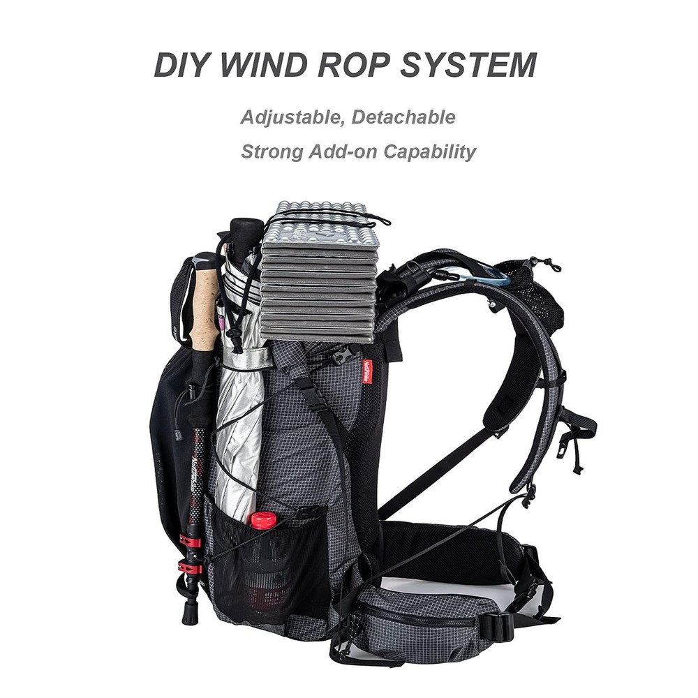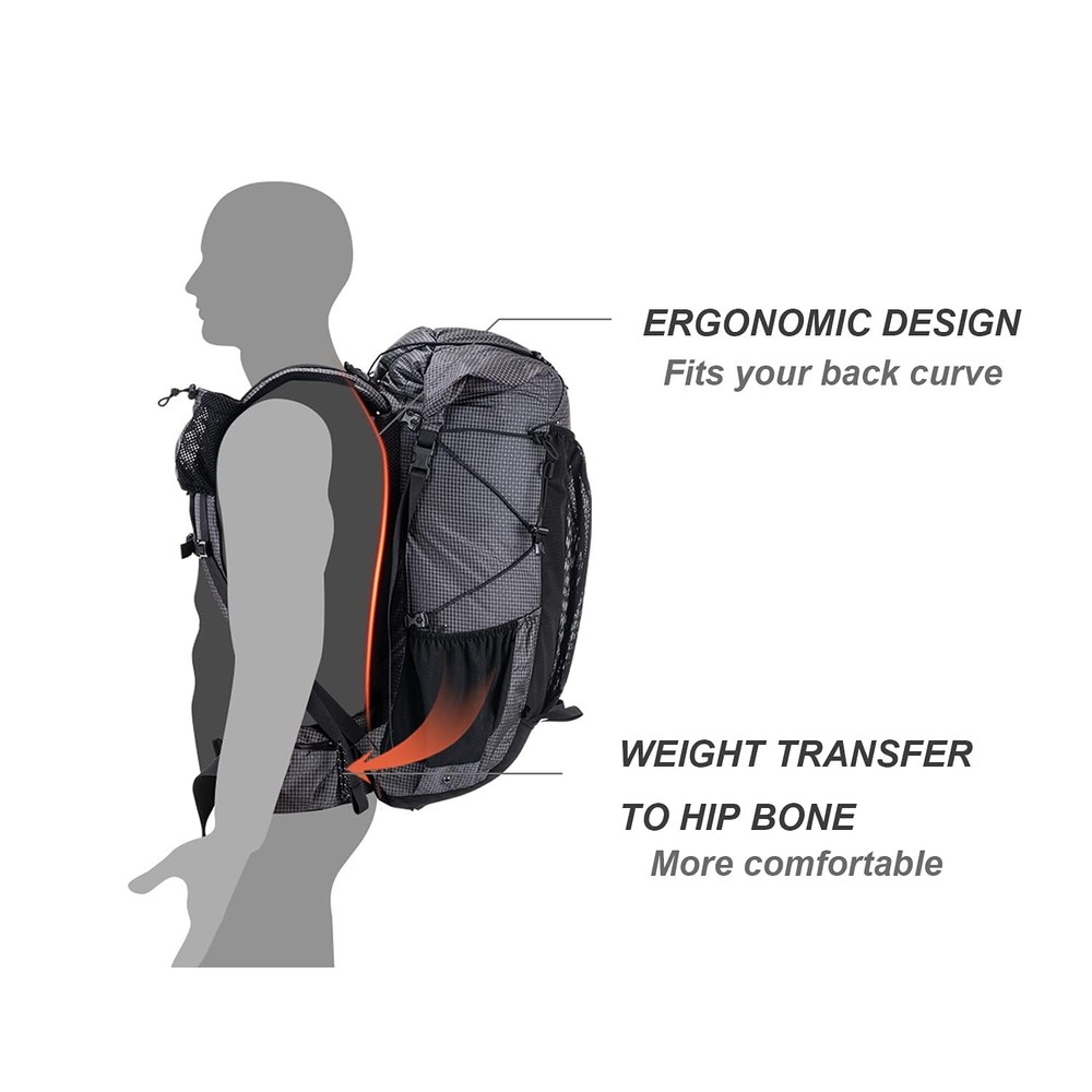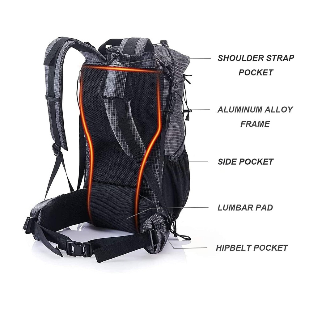 Hiking Camping Backpack 45L/65L Lightweight Internal Frame with Rain Cover for Backpacking Outdoor Sports LARGE CAPACITY & LIGHTWEIGHT: The Rock Series Backpacks have two capacities available: 40+5L and 60+5L, which meet most people's needs. For every hiker, every gram counts so we focus on providing lightweight camping gear. Our 40+5L backpack is only 2.73lbs, 60+5L backpack is only 2.93lbs, making your hiking trips more enjoyable. HIGH-QUALITY FABRIC: These mountaineering rucksacks are made of high-quality 420D nylon for durability and scratch resistance. They are water repellent, which means not completely waterproof, so we have a rain cover inside the bottom pocket in case you catch a sudden rain while hiking. ERGONOMIC DESIGN: Ergonomically designed back pad and thick shoulder pad scientifically reduce back pressure. The back pad has a mesh structure breathable and comfortable even if you carry a backpack for a long time you will not feel tired. MULTI-POCKETS & DIY WINDROPE SYSTEM: Our backpacks have multiple pockets to store lots of camping gear. A large open mesh pocket on the back of the backpack allows you to quickly access and store stuff. If you need extra space, you can also bind things such as trekking poles or sleeping bags firmly with compression straps on the top and both sides of the backpack. 100% SATISFACTORY: Reach out to our amazing product support team by email if you have any questions or concerns. We will respond to you within 24 hours.