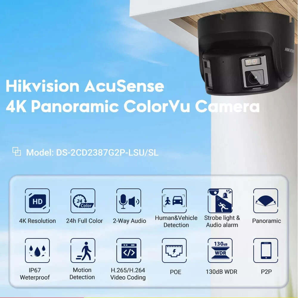 Hikvision 4K 180° DS-2CD2387G2P-LSU/SL ColorVu Panoramic 8MP IP Camera Dual lens