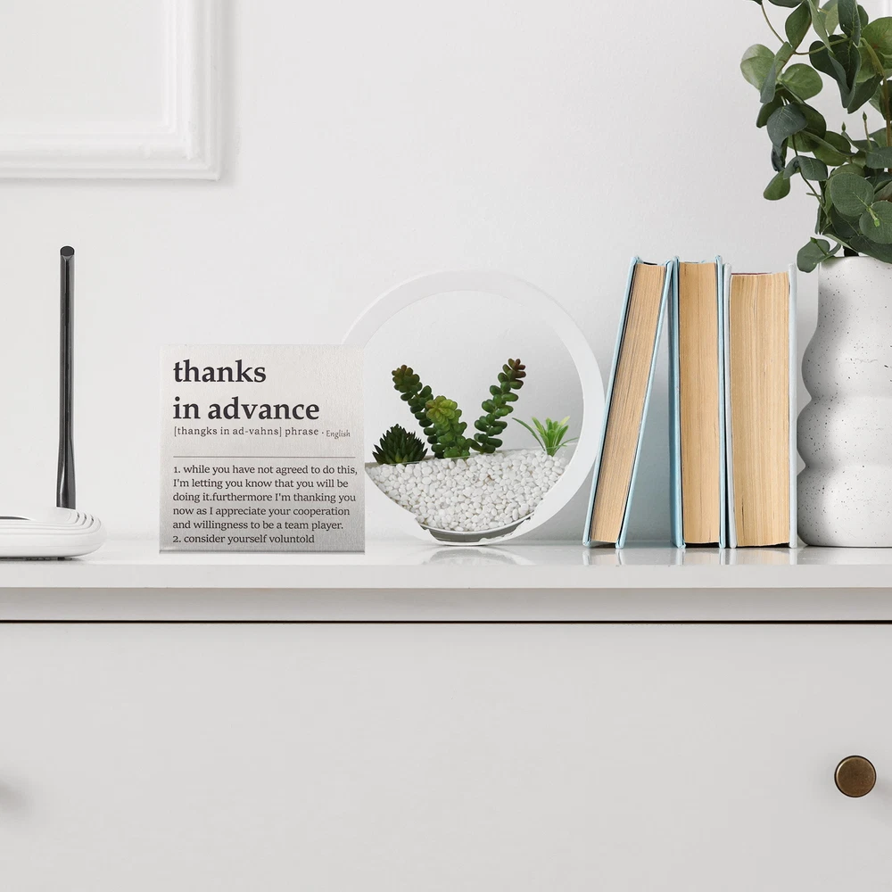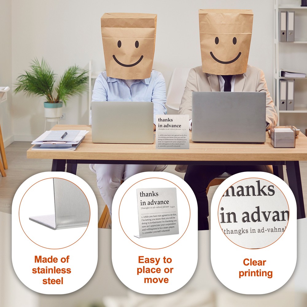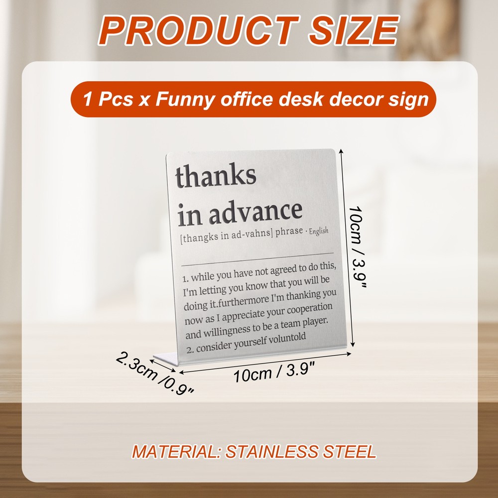 Document MULTIPURPOSE - Funny desk decoration signs use humorous sentences to inspire smile and liven up the office atmosphere, bringing personality and fun to any workspace. Perfect for birthdays, events, home, and office decorationWHAT YOU GET - 1 x Funny office desk decor sign. And their sizes are: 10cm x 2.3cm x 10cm / 3.9inch x 0.9inch x 3.9inch(L*W*H); Material: Stainless steel; Color: Silver; Style: thanks in advanceRELIABLE MATERIAL - The funny desk decoration sign is made of stainless steel, which is strong and not easy to deform, waterproof and rust-proof, and durable. It is small in size and easy to place or move on the desk, and it does not take up too much space. The interesting title content has both decorative effects and brings fun.WIDELY USED - Funny office desk decor sign has a wide range of applications. It can be placed on the desk to decorate and bring fun to busy coworkers. It can be placed on bookshelves and wall cabinets to decorate the corners of the home. It can also be given to friends, colleague as interesting gifts.KINDLY NOTE - Please pay attention to the style and size of the title before purchasing Funny Desk Sign, Funny Nameplate, Silver (thanks in Advance) MULTIPURPOSE - Funny desk decoration signs use humorous sentences to inspire smile and liven up the office atmosphere, bringing personality and fun to any workspace. Perfect for birthdays, events, home, and office decoration WHAT YOU GET - 1 x Funny office desk decor sign. And their sizes are: 10cm x 2.3cm x 10cm / 3.9inch x 0.9inch x 3.9inch(L*W*H); Material: Stainless steel; Color: Silver; Style: thanks in advance RELIABLE MATERIAL - The funny desk decoration sign is made of stainless steel, which is strong and not easy to deform, waterproof and rust-proof, and durable. It is small in size and easy to place or move on the desk, and it does not take up too much space. The interesting title content has both decorative effects and brings fun. WIDELY USED - Funny office desk decor sign has a wide range of applications. It can be placed on the desk to decorate and bring fun to busy coworkers. It can be placed on bookshelves and wall cabinets to decorate the corners of the home. It can also be given to friends, colleague as interesting gifts. KINDLY NOTE - Please pay attention to the style and size of the title before purchasing Hot Item Payment 1.We accept eBay payment . 2.Payment must be received within 7 business days of auction closing. Shipping 1.We ship to your eBay or Paypal address. Please make sure your eBay and Paypal address is correct before you pay. 2.Items will be shipped within 1-3 business day when we received payment. 3.Delivery time depends on destination and other factors. Description Policy Funny Desk Sign, Funny Nameplate, Silver (thanks in Advance) MULTIPURPOSE - Funny desk decoration signs use humorous sentences to inspire smile and liven up the office atmosphere, bringing personality and fun to any workspace. Perfect for birthdays, events, home, and office decoration WHAT YOU GET - 1 x Funny office desk decor sign. And their sizes are: 10cm x 2.3cm x 10cm / 3.9inch x 0.9inch x 3.9inch(L*W*H); Material: Stainless steel; Color: Silver; Style: thanks in advance RELIABLE MATERIAL - The funny desk decoration sign is made of stainless steel, which is strong and not easy to deform, waterproof and rust-proof, and durable. It is small in size and easy to place or move on the desk, and it does not take up too much space. The interesting title content has both decorative effects and brings fun. WIDELY USED - Funny office desk decor sign has a wide range of applications. It can be placed on the desk to decorate and bring fun to busy coworkers. It can be placed on bookshelves and wall cabinets to decorate the corners of the home. It can also be given to friends, colleague as interesting gifts. KINDLY NOTE - Please pay attention to the style and size of the title before purchasing Hot Item Payment 1.We accept eBay payment . 2.Payment must be received within 7 business days of auction closing. Shipping 1.We ship to your eBay or Paypal address. Please make sure your eBay and Paypal address is correct before you pay. 2.Items will be shipped within 1-3 business day when we received payment. 3.Delivery time depends on destination and other factors.