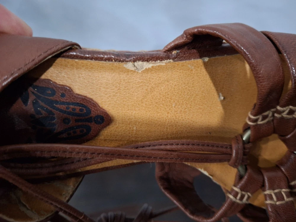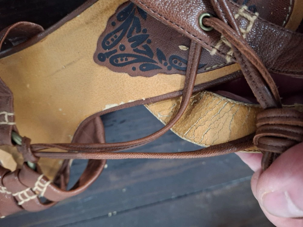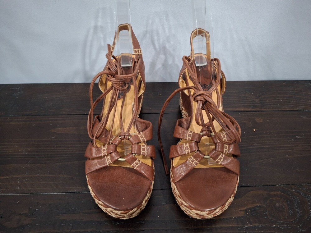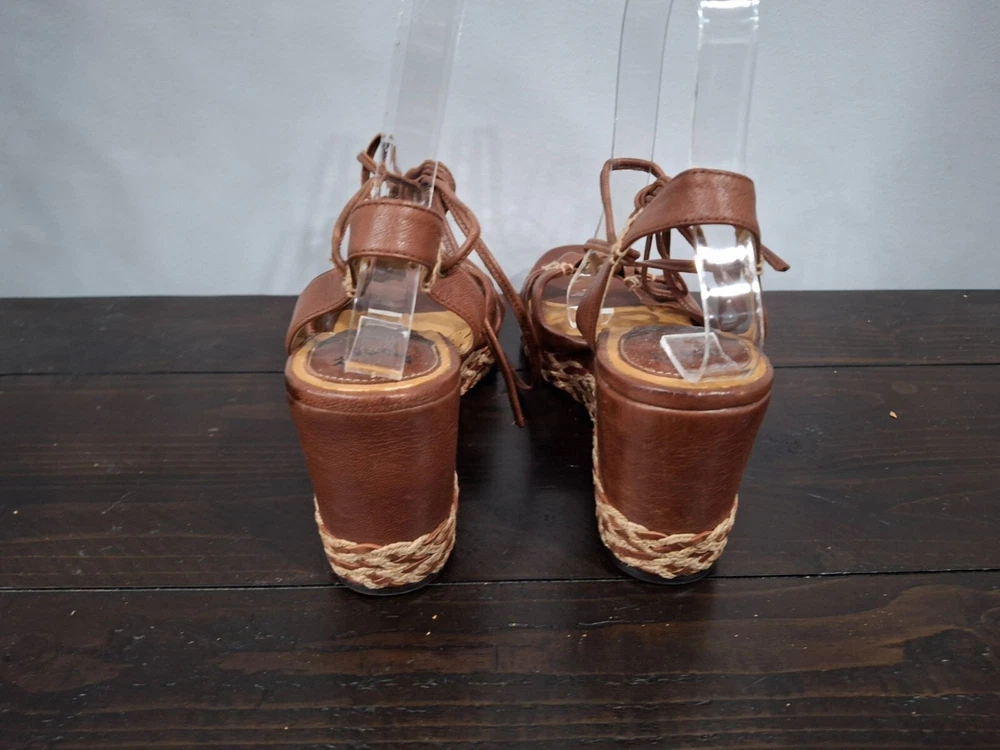 Pre-owned, in good condition. ***The inner lining of the sandals are cracking/peeling. Please note this in pictures. Size 7M These brown leather wedge sandals are highlighted by a basket weave wedge heel and has gladiator laces. 3.5" heel