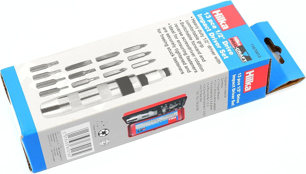 Hilka 11670013 1/2-Inch Pro Craft Impact Driver Set 13-Piece 13 piece heavy duty 1/2-Inch driver set with comfortable grip Contains 5 6 8 mm slotted No 1 2 3 POZI and Philips T12 T20 T30 T 40 Torx This impact drive set is supplied in a handy storage case