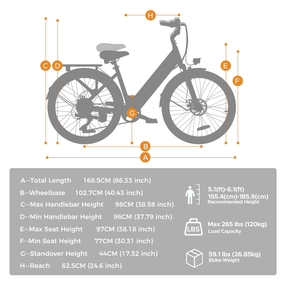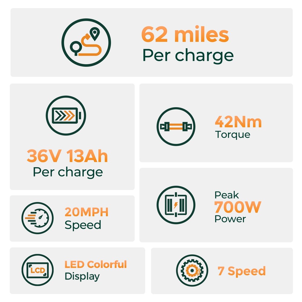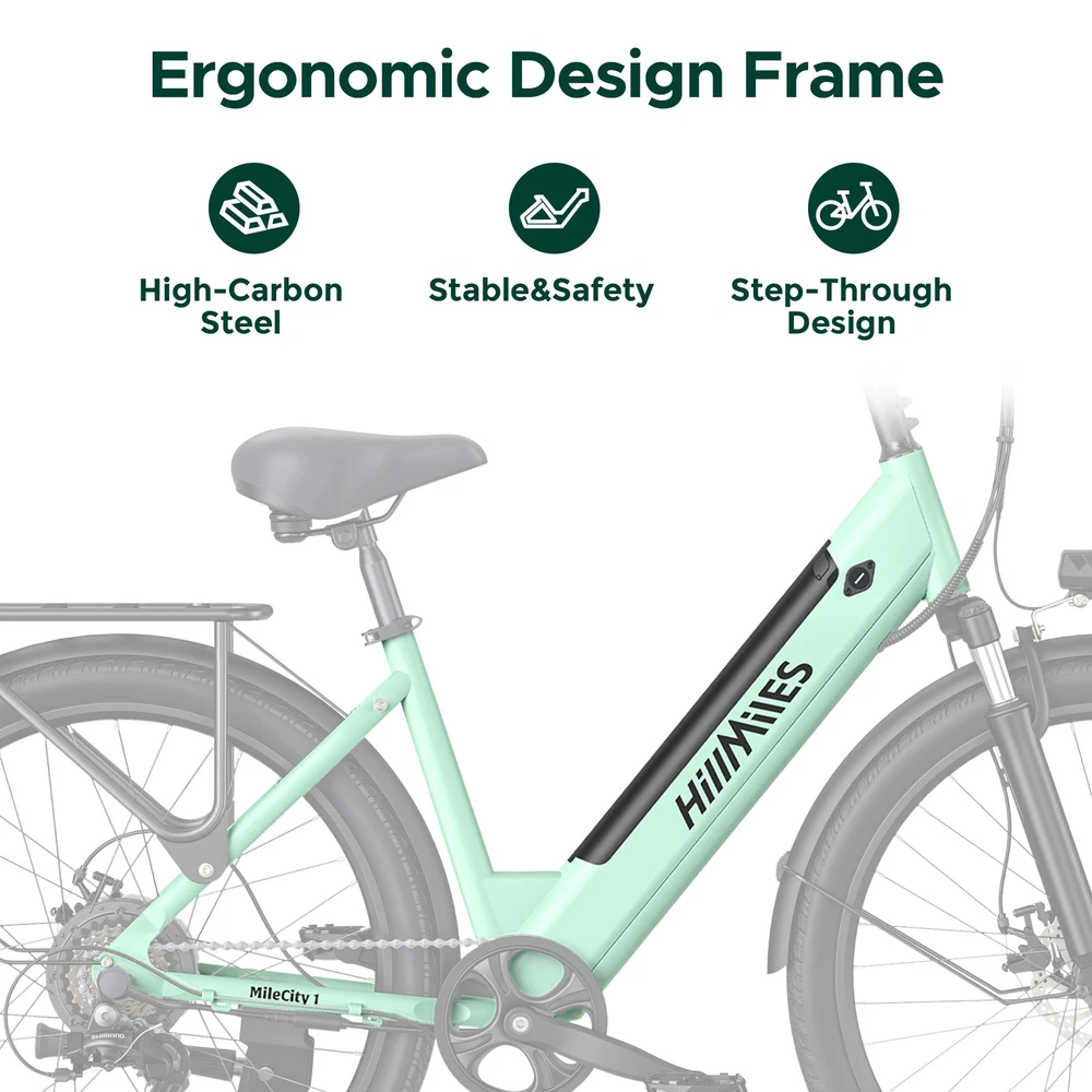 HillMiles MileCity 350W Motor 36V 13Ah Battery 70KM Range City E-Bike 350W Silent Motor Electrifying on-road performance with 350W motor support. and 42 N.m torque, you can confidently ride a 12° slope. 36V 13Ah Large Battery 36V 13Ah lithium-ion battery with a 5-hour quick charge time can power your ride for up to 100km on pedal-assist mode and 50km on pure electric mode on a single charge. The removable design allows you to easily take it home for charging or storage. Torque Sensor High sensitivity and accuracy in sensing capable of detecting static and dynamic torque and ensuring stable driving performance of electric bicycles with zero start during cycling. Chaoyang 26*1.95" Tires Designed for low ground pressure to allow riding on soft or unstable terrain, the 26*1.95" tires can conform to the shape of the terrain and provide a better grip on rough and irregular surfaces such as loose gravel, mud, snow, and sand. Brand HillMiles Model MileCity 1 Battery Capacity 13AH Motor Power 350W Torque 42NM Meter Display LED Max. Speed 32KM/H Sensor Torque Riding Model Human/Assisted/Pure power Max range for pure power 50KM Max range for assisted mode 100KM Frame Material High-carbon steel Max climbing grade 12° Wheel & Tire Chaoyang 26*1.95 Tires Braking System Mechanical disc brake Gears/Variable Speed Shimano 7S Suspension Front fork Input voltage 100-240V Charger voltage 42V 2A Charging Time 4-5H Max load 120KG Handlebar Height 96-98CM Saddle height 77-97CM Suitable Height 155-185CM Lights LED Mudguard Front and rear Waterproof IP65 Battery Weight 3KG Net Weight 26.85KG Gross Weight 33.17KG Full Size 168.5*62*97CM Package Size 132*23*70CM Package Includes 1 x MileCity 1 electric bike 1 x 36V 13AH Battery 1 x Battery charger 1 x Tool kit 1 x User manual Note: Our products have been certified under UL2849 safety standards.