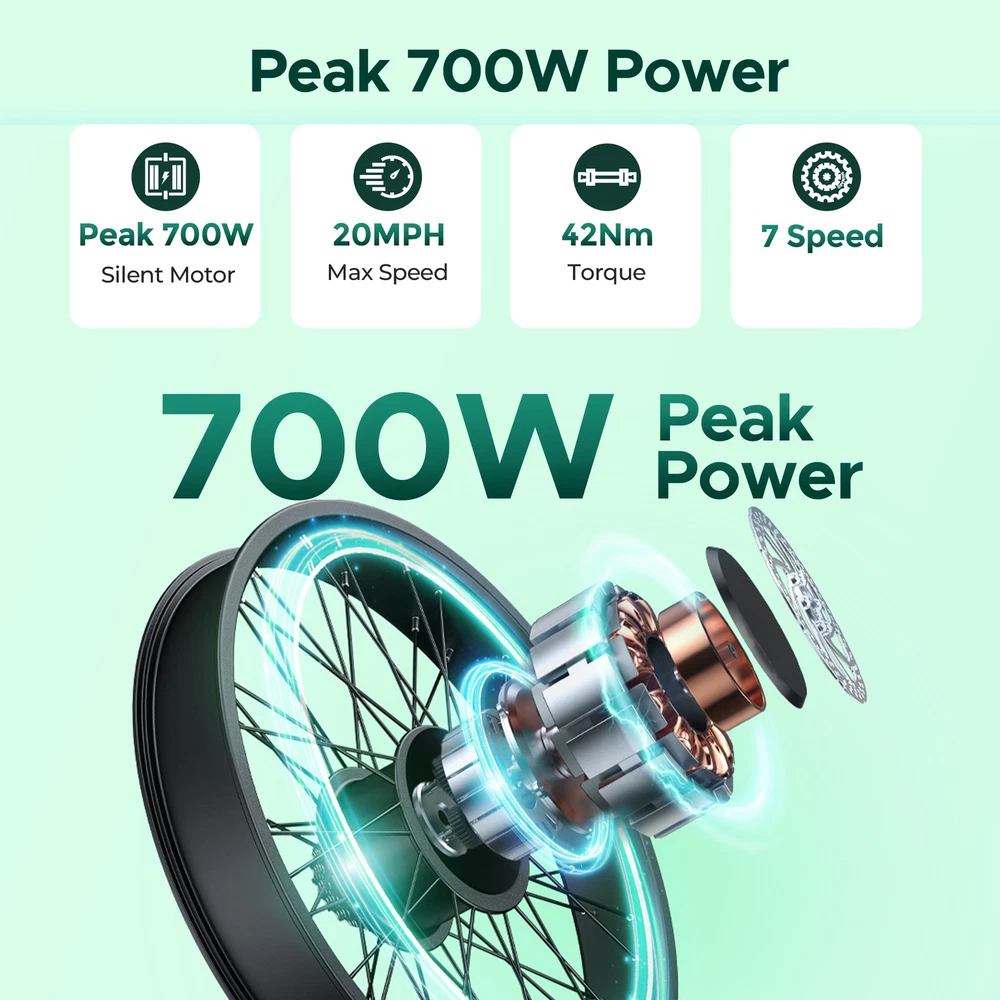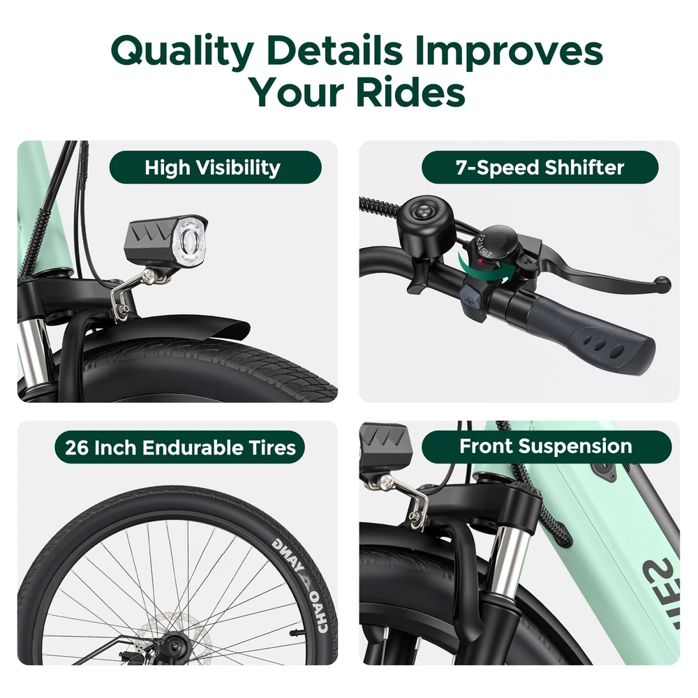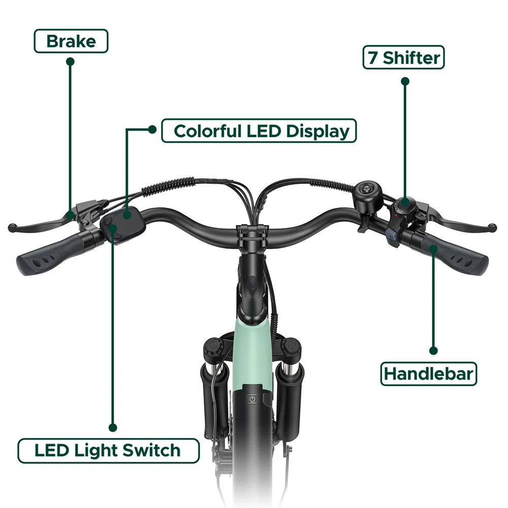Brand: HillMiles MileCity Gear Change Mechanism: Automatic Gear Box Charging Time: More Than 5 Hours Maximum Speed: 20 mph Maximum Range: Up to 60 mi Tire Type: Winter Tires Suspension Type: Front Shifter Style: Grip Shifter Department: Unisex Adults Brake Type: Disc Brake - Hydraulic Model: HillMiles MileCity Material: Aluminum Alloy Voltage: 36 V MPN: Does not apply Wheel Size: 26 in Motor Power: 350 W Motor Type: Direct Drive Motor Handlebar Type: Riser Bar Color: Green Features: Fenders, Front Light Bike Type: E-Mountain Bike Frame Size: Medium Number of Speeds: 7 Speed Manufacturer Warranty: 1 Year