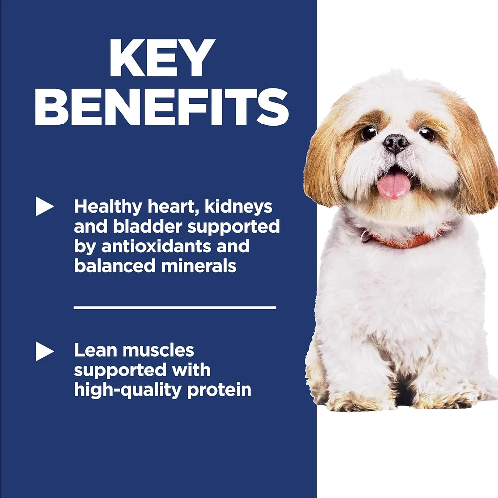 Hill's Science Diet Adult 7+ Small Bites dry dog food is formulated for specific aging needs. Provides easy-to-digest nutrition with a synergistic blend of ingredients to help support energy & activity level. Delicious chicken flavor in a small bite size for those that prefer variety. Balanced minerals for heart & kidney health Omega-6s & Vitamin E for beautiful skin & coat High-quality protein for lean muscles Recommended for: Adult dogs 7+ years of age. Not recommended for: Puppies and pregnant or nursing dogs. During pregnancy or nursing, dogs should be switched to Hill’s Science Diet Puppy, Hill’s Science Diet Puppy Small Bites or Hill’s Science Diet Puppy Small Paws dry dog food.