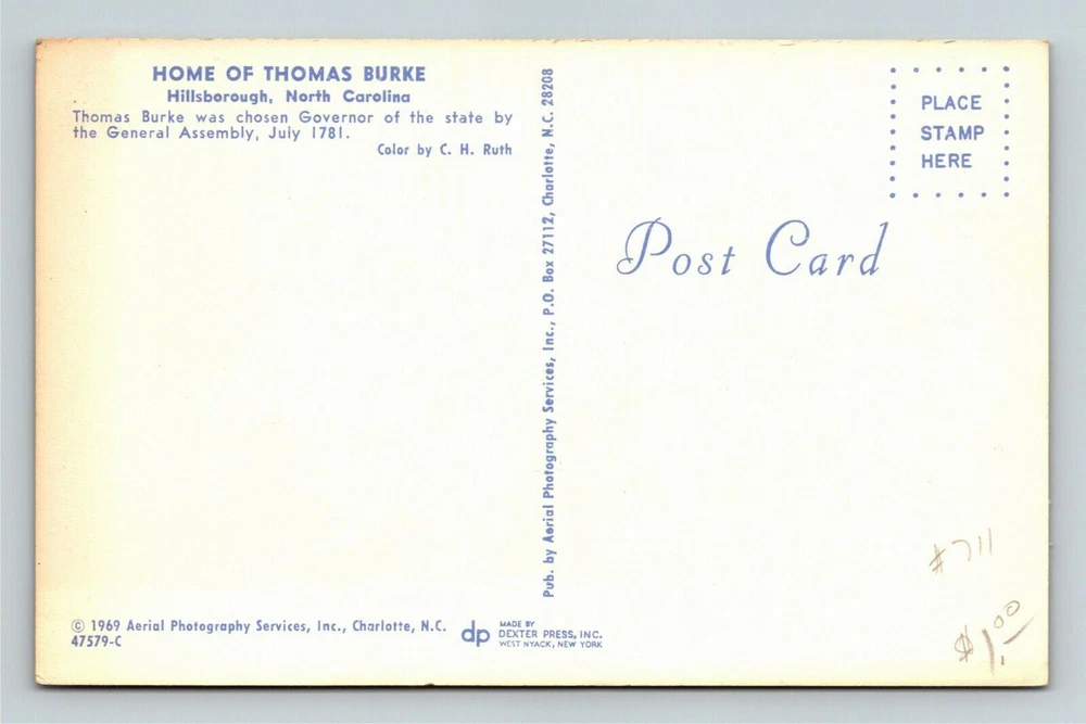 Hillsborough NC-North Carolina Home Thomas Burke Governor Vintage Postcard