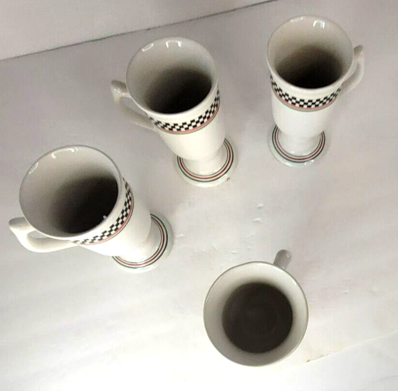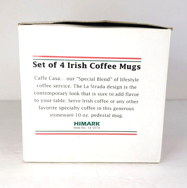 Add a touch of contemporary style to your coffee time with the Himark Caffe Casa La Strada Irish/cappuccino stemmed coffee mugs. Made of high-quality ceramic and porcelain, these mugs come in a set of four and can hold up to 10 ounces of your favorite hot or cold beverage. Featuring a geometric pattern in white, these mugs have a unique pedestal design that makes them stand out. The Himark Caffe Casa La Strada model is perfect for those who love to enjoy their coffee in style. Made in China, these mugs are a must-have addition to your dinnerware collection.