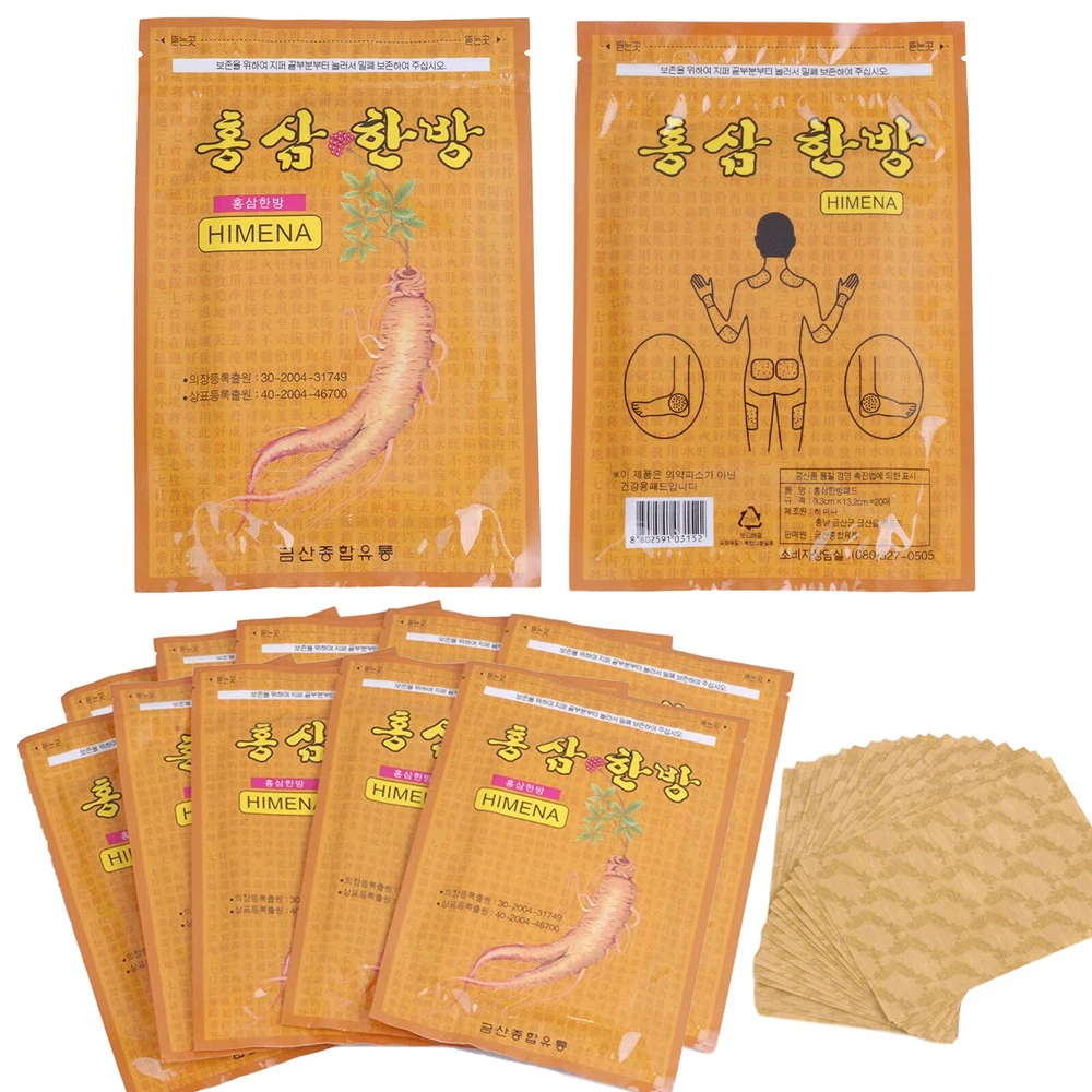 Himena Korean Red Ginseng Pad Pain Relief Health Patch 20Pack 400pcs Brand: Himena Model: Korean Red Ginseng Pad Capacity: 20 Pack / 400 Pcs (1Pack = 20 Pcs) Function: Korean Ginseng Health Pads Color: Skin Size Type: 3.5 x 5.2 Inch Made in Korea Application for Chairman Registration: 30-2004-31749 Trademark registration application: 40-2004-46700 Ziploc packaging for easy storage. Large capacity for long-lasting use. Thin and lightweight material is comfortable to wear. The square pads can be cut and stuck as many times as you want to cover your favorite areas. It's a great gift for gym goers, people who do a lot of physical labor, and parents.