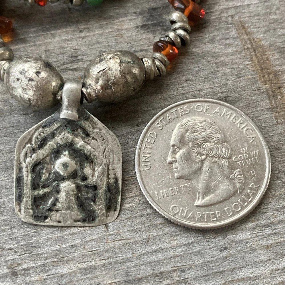 IGNORE THE PRICE STICKER ON THE PENDANT IN THE PHOTOS, THAT WAS FROM A DIFFERENT TIME A DIFFERENT ERROR AND A DIFFERENT GALAXY. NOW I’M SELLING MY JEWELRY PARTS . Yes up for sale is this 20” inch necklace but the main selling point is the silver pendant of the Hindu Goddess … to be honest I don’t know which goddess this is. Dependent is pretty worn, but that’s the charm.. Also on the necklace if you care to know, are some African trade beads, including two nice lemon, beads, and some seed beads, and some brass Heishi from Nigeria. I know that the pendant came from India, probably the state of Rajasthan. It’s about 100 years old, although I don’t have providence on any of these beads. I did work in a bead store here in my hometown Oberlin for a decade, and I spent a lot of my paycheck on beads… Now I’m liquidating my collection .
