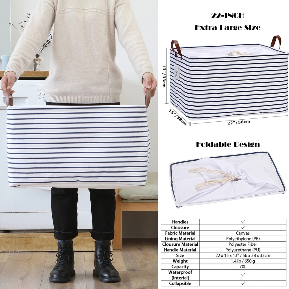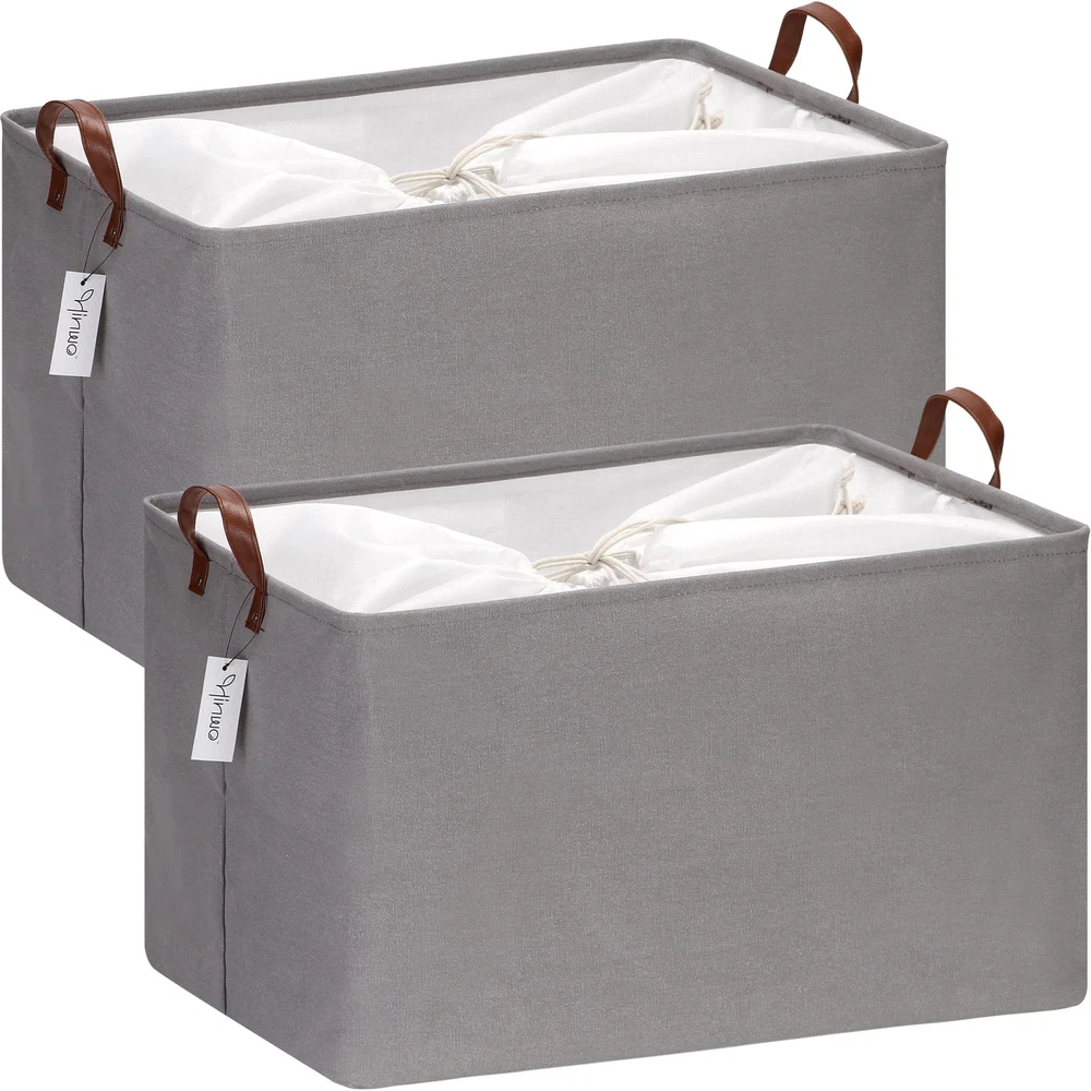 Hinwo 70L Extra Large Storage Bins, 2-Pack Closet Organizers and Storage, Foldable Clothes Storage Baskets with Handles, Containers for Clothing, Blanket, Comforters, Toys, Bedding (Gray) Spacious Storage Capacity – The rectangle large storage bin measures 22 x 15 x 13” to fit most of closets and shelfs, and provides 70L spacious space for storing a variety of items such as blankets, comforters, clothes, toys and other daily odds and ends Easy to Carry – Equipped with a pair of side handles, the storage basket can be easily moved, carried up and down stairs when filled with items, which is perfect for daily use, changing season and moving house Sturdy & Waterproof Material – Made of thickened canvas fabric with a layer of PE coating lining, the basket provides high tear resistance while the lining is waterproof which allows you to store wet clothes or other moist items Lidded & Collapsible Design – Made of soft fabric and equipped with a drawstring cover, the storage bin can keep items clean, allows you simply fold it down flat to 1 inch in height for space-saving storage when not in use and more flexible to fit diverse space than those baskets made of hard materials like plastic, wicker, and metal Serves many usage scenarios – The storage bin provides an efficient storage solution in home and office, under the bed, on the shelf, at the corner, and in the closet / wardrobe, to keep the space tidy and well-sorted, simultaneously offers stylish aesthetics for seamless coordinating with home décor Shipping We offer FREE shipping on all orders! We use a selection of shipping services such as UPS, FedEx, USPS etc. We only ship to the lower 48 states, no APO/FPO addresses or PO Boxes allowed. Local pickups and combined shipping options are not provided at this time. Return You can return a product for up to 30 days from the date you purchased it. Any product you return must be in the same condition you received it and in the original packaging. Please keep the receipt. Payment We accept payment by any of the following methods: PayPal Please pay as soon as possible after winning an auction, as that will allow us to post your item to you sooner! Feedback Customer satisfaction is very important to us. If you have any problem with your order, please contact us and we will do our best to make you satisfied. Contact Us If you have any queries, please contact us via ebay. We usually respond within 24 hours on weekdays. Please visit our eBay store to check out other items for sale! Thank you for shopping at our store.