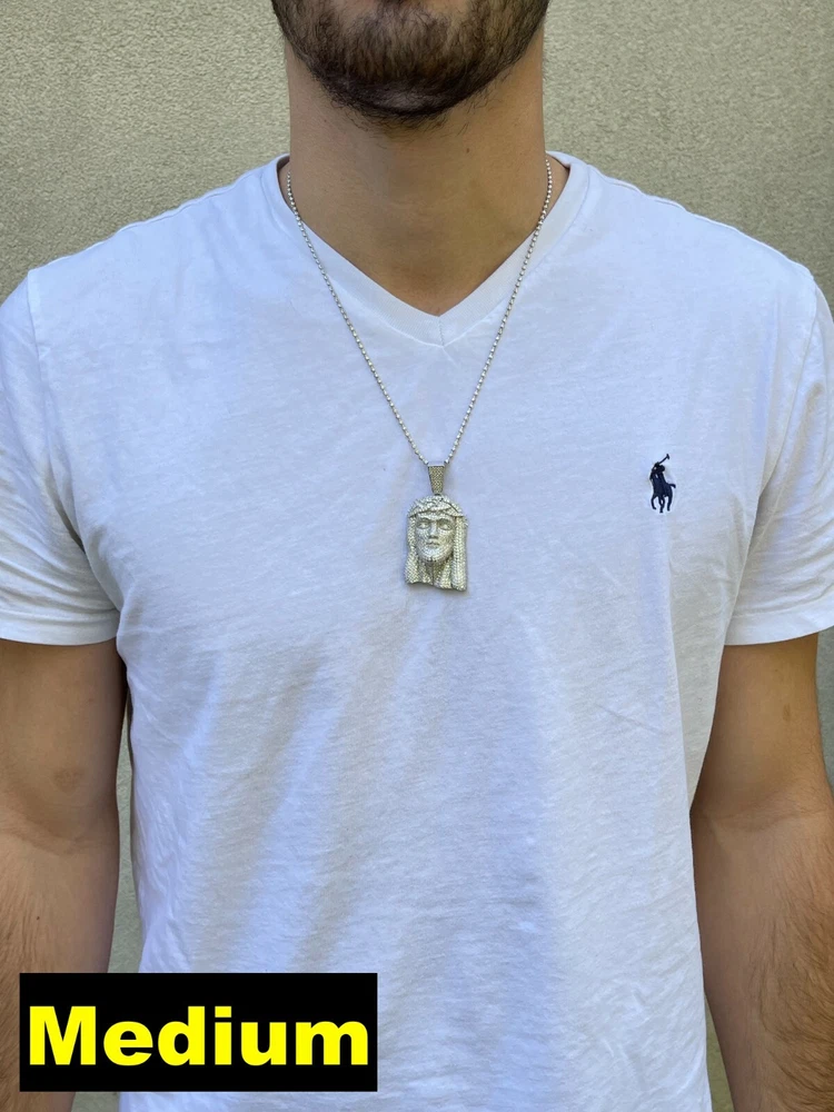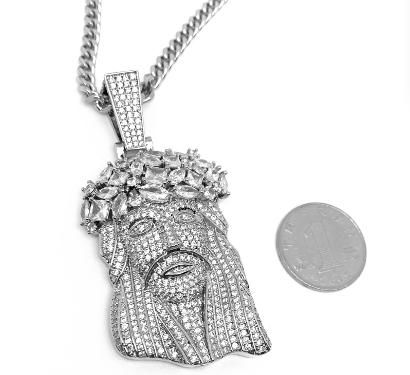 Rap JESVS necklace This avatar necklace has been worn by a large number of rap artists since the 1990s Tupac Kanye 50 Cent Jay-Z loves to wear big Jesvs necklaces The unique feature of this necklace is that its face is covered in white zircon stones Filled with 328 zircon stones, 5A grade white zircon stones, particularly shiny and non shedding, not cheap rhinestones. Free delivery of 70mm long 5mm thick titanium steel Cuban chain, non rusting and non fading Look just like real diamonds and cant tell difference without a microscope SO ICY IT WILL BLIND YOU!