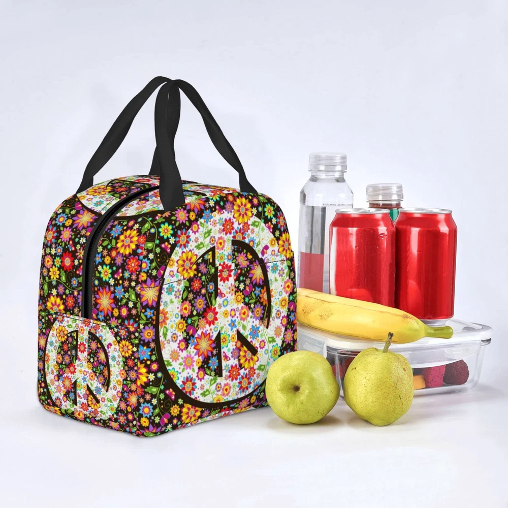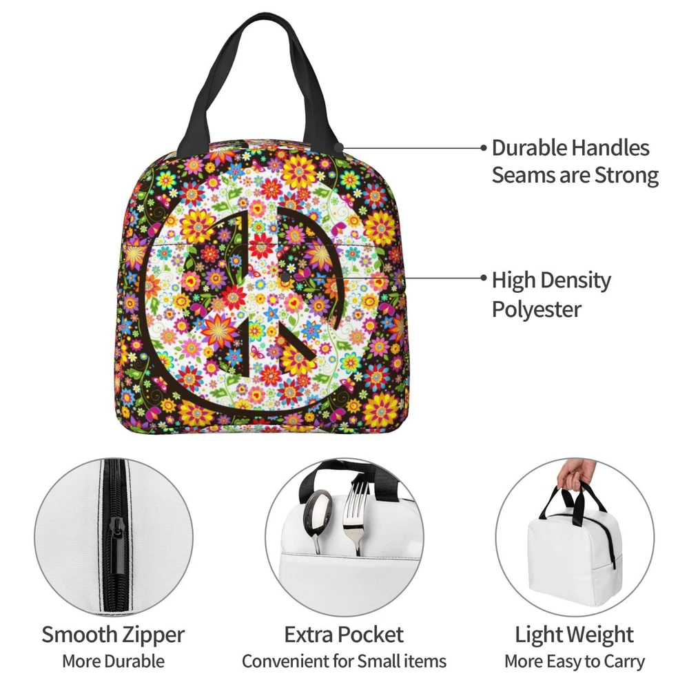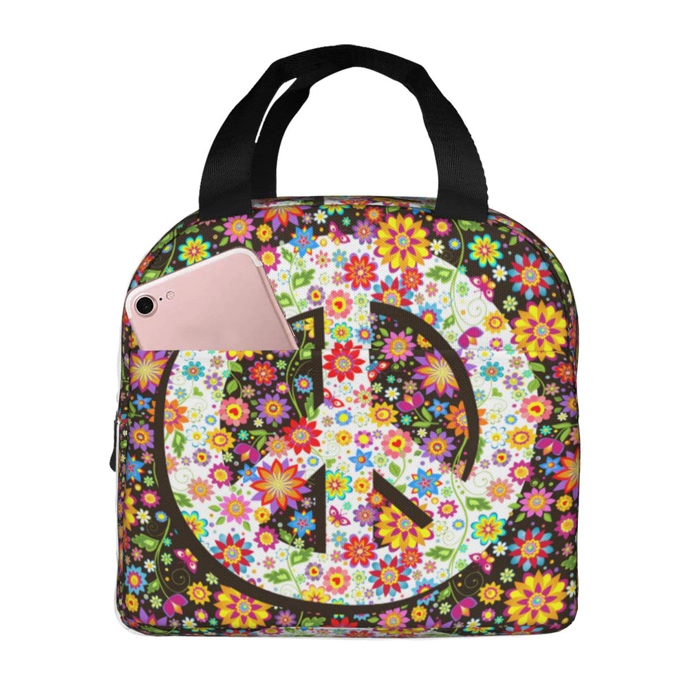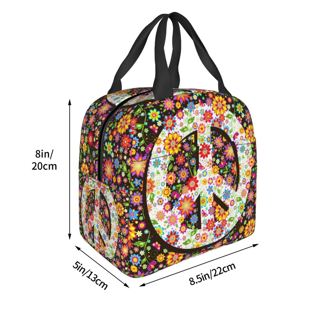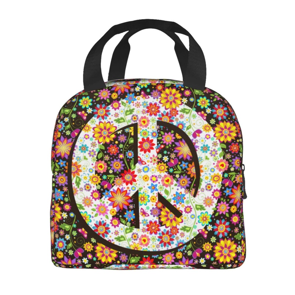 Hippie Flowers Fashion Peace Insulated Lunch Bag For Women Men Reusable Lunch...