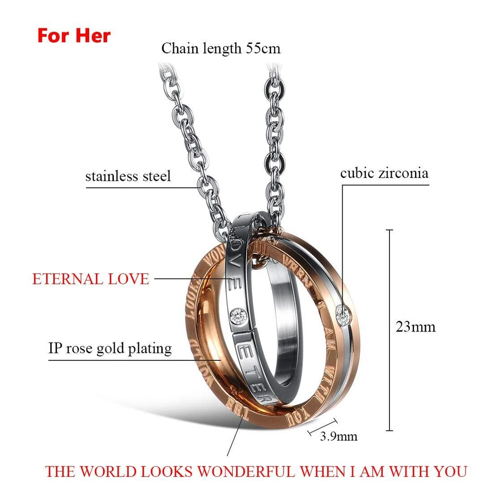 His & Hers Matching Sets Titanium Stainless Steel Couple Pendant Necklace for Men Women Interlocking Double Rings Cubic Zirconia CZ Charms Pendant Promise Friendship Jewelry, Eternal Love, 2Pcs ETERNAL LOVE – Both carved "ETERNAL LOVE", and engrave "THE WORLD LOOKS WONDERFUL WHEN I AM WITH YOU" on the side of the ring, it is a symbolic statement you'll love to admire and wear. Couples steel personalized necklace for men women, expressing love for a friend, lover, mom, father etc. It will be a unique personalized and meaningful gift to him or her. LOVE COUPLE NECKLACE – "ETERNAL LOVE", "THE WORLD LOOKS WONDERFUL WHEN I AM WITH YOU" are the meaningful words to show that how important he/she is in your heart. Maybe you are not good at speaking, try to use your actions to express your love, "SAY" you are my King/Queen, I willing to surrender to you. SIZE DETAIL – Female style ring size 0.91" x 0.15"(23mm x 3.9mm), rose gold plated, with 22"(55cm) link chain; Male style ring size 0.98" x 0.2"(24.8mm x 4.9mm), black gun plated, with 24"(60cm) link chain. Come with 2pcs, black for him, rose for her. MATERIALS – Made of superior 316l titanium stainless steel with small cubic zirconia stone, crafted of anti-tarnishing, scratch-resistant stainless steel, exquisite workmanship and polishing technique, the necklace features silver and black finish, which can last longer time, never turn your skin green as cheap jewelry, eye-catching and easy matching. PERFECT GIFT FOR COUPLES – Comes in velvet bag with MMTTAO brand logo. Circles ring pendant, engrave with lovely words "ETERNAL LOVE", vividly explain how much you love him or her, and how sepcially him/her means to you. This is a special couples gift. Perfect gift for valentine's day, wedding, engagement, birthday, anniversary and other occasions. Devoting a meaningful necklace that belongs to him or her so that your love will be witnessed by more people. Shipping We offer FREE shipping on all orders! We ship within Three business days of payment, usually sooner. We use a selection of shipping services such as UPS, FedEx, USPS etc. We only ship to the lower 48 states, no APO/FPO addresses or PO Boxes allowed. Local pickups and combined shipping options are not provided at this time. Return You can return a product for up to 30 days from the date you purchased it. Any product you return must be in the same condition you received it and in the original packaging. Please keep the receipt. Feedback Customer satisfaction is very important to us. If you have any problem with your order, please contact us and we will do our best to make you satisfied. Contact Us If you have any queries, please contact us via ebay. We usually respond within 24 hours on weekdays. Please visit our eBay store to check out other items for sale! Thank you for shopping at our store.
