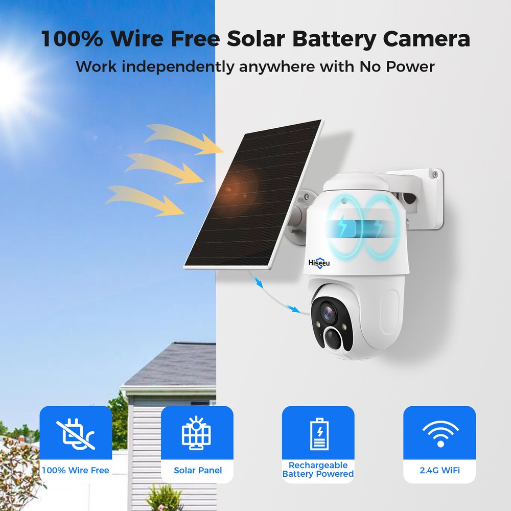 >>>Solar Powerd and Full 355° Coverage >>>2K 3MP and ColorNight Vision >>>IP65 Waterproof and Enhanced WiFi Antenna >>>PIR Sensing and Two-Way Talk >>>Smart Sharing and Privacy Protection Hiseeu Solar Battery Powered Wireless Security Camera System Outdoor Wifi Audio Item Features : >>> Solar Powerd and Full 355° Coverage : The solar security camera has a built-in 9000mah rechargeable battery and is fully charged through the solar panel or USB cable, to achieve a 100% wireless and uninterrupted power supply. Never need to disassemble the camera to charge, At the same time, the APP can control the horizontal 355° and vertical 90° rotation angles, and easily cover the 355° field of view. It can bring you 365 days of uninterrupted protection, and ensure your home's safety. >>> 2K 3MP and ColorNight Vision : The wireless outdoor camera uses the most advanced 1/3CMOS color sensor and advanced 2K 3MP optical lens. Provides detailed and clear graphics and video even in low light conditions, while the upgraded high-power white light and built-in infrared LED array can help you capture colorful pictures and videos at night with a night vision range of 7-10 Meters, and can capture more things in the dark, can see any corner you want to monitor, let you sleep peacefully. >>> IP 65 Waterproof and Enhanced WiFi Antenna : The wireless outdoor security WiFi camera is made of enhanced IP65 material, which can be used safely regardless of rain, sunlight, high temperature, and severe cold. At the same time, it is equipped with a high-gain 4dbi WiFi antenna and 2.4G WiFI transmission, which can receive your data in a wider range. The network signal has good wall penetration, and strong anti-interference ability, and realizes the security protection for the whole year. >>> PIR Sensing and Two-Way Talk : The solar security camera chooses a more complete PIR sensing technology, intelligently distinguishes people, cars, pets, passing, staying, leaving, etc., pushes them to the APP''Vicohome''in real-time, and can draw customized monitoring areas at the same time, through the built-in microphone and speaker, Remote warnings can be used in emergency situations to prevent losses. Also, chat with family and friends in real time. Let you know the dynamic anytime, anywhere. >>> Smart Sharing and Privacy Protection :Solar Outdoor Security Camera supports multi-user connectivity and device sharing with 8-128GB micro SD card (not included) and free 3-day trial cloud storage, Out and about or busy at work, you may ignore the notification, but family members can scan your code to access the camera and protect your home together, while we focus on customer security and privacy protection, all images are encrypted, and no one can access the information without your consent. Applied to Multiple Occasions it can work without any cables thanks to the rechargeable batteries and WiFi connection. Mount it anywhere to have an ultra wide viewing angle with its 355° pan and 90° tilt. Set it up in seconds and enjoys peace of mind. Advanced Cloud AI technology Analysis AI recognition and analysis algorithms intelligently distinguish humans, vehicles, pets with detailed analysis results of passing, staying or leaving, etc.Notifications are pushed to the app instantly, keeping you informed of what's happening wherever you are. PIR Human Detection Camera will send alarm information to user's phone via APP when someone invades the warning area. Vehicle Identification Through Cloud AI calculation, the camera can identify the vehicle and send an alert through the APP. Package Inspection Through Cloud AI calculation,when the camera detects the behavior of picking up and placing packages in the warning area, it will automatically send an alarm. Pet Identification Through the AI algorithm, the camera will recognize the pet and capture it, leaving the cute moment of the pet. Activity Zone Accurately draw customized activity zones in the mobile app.Irrelevant information outside the area would be filtered. The key area, the key focus. 2 months long standby time Record 20 10-second videos every day and the gimbal does not rotate. Solar Panel Charging Use with a dedicated solar panel to ensure that the camera is online for a long time. Dual Light Source with Color Night Vision Full Color Mode : Upgraded high power white-light source. It's able to take color pictures at night. Normal Mode: Built in with IR LED array. Night vision range is up to 20 m. Pan/Tilt 360° All-Round Protection It allows you to remotely control the left right up down rotation via the app.Offers a 90° vertical and 355° horizontal rotation range.Protect your home from 360°. Alternative Methods of Storage Cloud Storage Cloud Storage: Up to 60 days of cloud storage intelligent backup to prevent lost. 7-days free cloud recording recycling. (After the free trial period ends, the feature requires a paid trial.) Local Storage: Micro-SD card storage up to 128GB.(not include the sd card) Intelligent and flexible Notification push Set targeted category in the app, and the cloud Al system will only push notifications when the targets are detected. No more redundant pushes. Two-way audio for live communication With the built-in waterproof and dust-proof microphone and Hi-Fi speaker, you can warn remotely to stop the loss in case of an emergency. For family and friends, live chat to experience intimate interactions, regardless of time and location. More Stable 4DBi WiFi Connection (2.4GHz Only) High-gain antenna, stable transmission App Control View what's happening around your house through the app. Easy live stream and video playback. No matter where you are, you can remotely access this IP camera to see live streaming and stay connected.Remotely view the outdoor surveillance camera via Vicohome App on your mobile device and Vicohome App is free to download and update. How To Connect Camera Easy to share access with family and friends. Access can be shared through the mobile