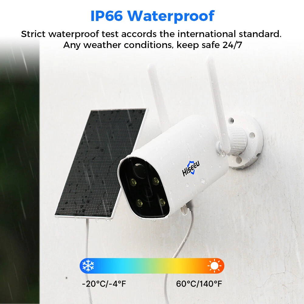 【100% Wire-Free Weatherproof Battery Powered Cameras】Wireless security camera system including 100% Wire-Free smart home battery powered security camera. 2K cameras, no monthly fee recorded in HDD.( Before installation, please connect camera to DC5V adapter for 13 hours to fully charge the battery.) NVR still need work with DC12V power cable. 【PIR Motion Detection & Floodlights】Only warm human body or mammal will be detected by PIR sensor, and it will push alarm to the App. Once the PIR sensor outputs a pulse signal, the camera will be activated and enter the recording state. If it has entered the night and the light around the camera is dim, the light sensor will activate the floodlight. 【Ultra Long Standby Time & Wireless Compact Design】 2 rechargeable batteries 9000mAh with solar panels Hiseeu 3MP Wireless Wifi Spotlight Battery Solar Camera CCTV System Kit Audio Item Features : 【100% Wire-Free Weatherproof Battery Powered Cameras】Wireless security camera system including 100% Wire-Free smart home battery powered security camera. 2K cameras, no monthly fee recorded in HDD.( Before installation, please connect camera to DC5V adapter for 13 hours to fully charge the battery .) NVR still need work with DC12V power cable. 【PIR Motion Detection & Floodlights】Only warm human body or mammal will be detected by PIR sensor, and it will push alarm to the App. Once the PIR sensor outputs a pulse signal, the camera will be activated and enter the recording state. If it has entered the night and the light around the camera is dim, the light sensor will activate the floodlight. 【Ultra Long Standby Time & Wireless Compact Design】 2 rechargeable batteries 9000mAh with solar panels are large enough for supporting a long time camera work few months(when triggered within 10 times/day). Wireless Connection and Invisible small size is easy to install it on outside or indoor for monitoring any unfriendly intruders and animals 【Preinstalled 1TB HDD Storage】System preinstalled with 1TB HDD, the camera will store the motion detection record in real time, not support 24/7 days continuous recording. Connect with network, allow to check those record on phone app "Eseecloud" or Computer software"Eseecloud". 【Two Way Audio & 8 Channel System】This is 8Channel dual WiFi 3MP network video recorder + 3Pcs 2K/3MP(2304 by 1296) IP66 waterproof 2-Way audio battery powered camera system, even on the other side of the globe, you can also hear and talk to people in front of the camera through the "Eseecloud" App.You can also add other model hiseeu cameras to meet your needs to monitor more areas. Cameras and NVR are paired before shipping. 【How to Record】Battery operated system only record in motion detection, not support 24/7 days continuous recording due to camera need save power. Motion detection recording will save more capacity of hard drive. 【How to Connect the System】The system needs connect with the TV monitor or computer monitor to show live stream(resolution need more than 1024*768), doesn't support connect to laptop(because both are video output) Item Specification : Smart Motion Detection -- PIR technology reduce false alarm, accurately sends you meaningful alerts in real time. IP66 Waterproof -- Strict waterproof test accords the international standard. Any weather conditions, keep safe 24/7. Stunning 3MP Resolution -- Hiseeu 3MP camera with 2304*1296 resolution, provide clearly image at anytime, wide angle than 1080P cameras. Clear Two-way Audio -- With the built-in waterproof microphone and speaker, live chat to experience intimate interactions. Work with Alexa -- Pair the camera with Alexa echo show, use a simple voice command to ask Alexa to view live stream. Remote Access Anytime and Anywhere -- Live view anywhere and share with families/friends simultaneously via the free "EseeCloud" App. Package list : Option 1: only 1pcs camera with power supply Option 2 : 3*cameras +NVR (installed 1TB HDD )+power supply Payment Delivery details Terms of sales About us Contact us Payment 1. All payments must be prepaid. 2. We only accept payment via Paypal. Please kindly check if you can pay via PayPal before placing order. Delivery details 1. packages will be sent out within the same day or 1 working days after the payment is received. 2. Orders place on the weekends will be shipped out on next Monday or Tuesday (holidays excluded). 3. Local pickup is not available. 4. We regret that we can not be responsible for any wrong or undeliverable addresses. 5. We'll pay for export custom tax,Buyer should pay for import custom tax if needed. Terms of sales 1. We automatically submit positive feedback to our buyers once the order is finished. 2. If you are satisfied with our product, please leave Positive Feedback , which means a lot to us, thanks in advance. 3. PleaseDo not leave Negative or Neutral Feedback before Contacting us, leave negative feedback can not solve any problem, but we will work with you to resolve those problems. 4. Please feel free to contact us viaEbay Message or E-mail.We generally reply messageswithin one business day, butexcept holidays. About us 1. We guarantee against any defective products. 2. We provide 30 days money back on non-defective, undamaged, unused and resalable products. Restocking fee and other fee may apply upon the condition of returned products. Shipping and handling fees are non-refundable. Product is not eligible for refund after the 14-day refund period is expired. 3. For any returned product, please contact us through ebay message firstly, we will work on resolving your particular case ASAP. Contact us If you have any question please feel free to contact us, we will respond within 1 business day or less, except holidays.