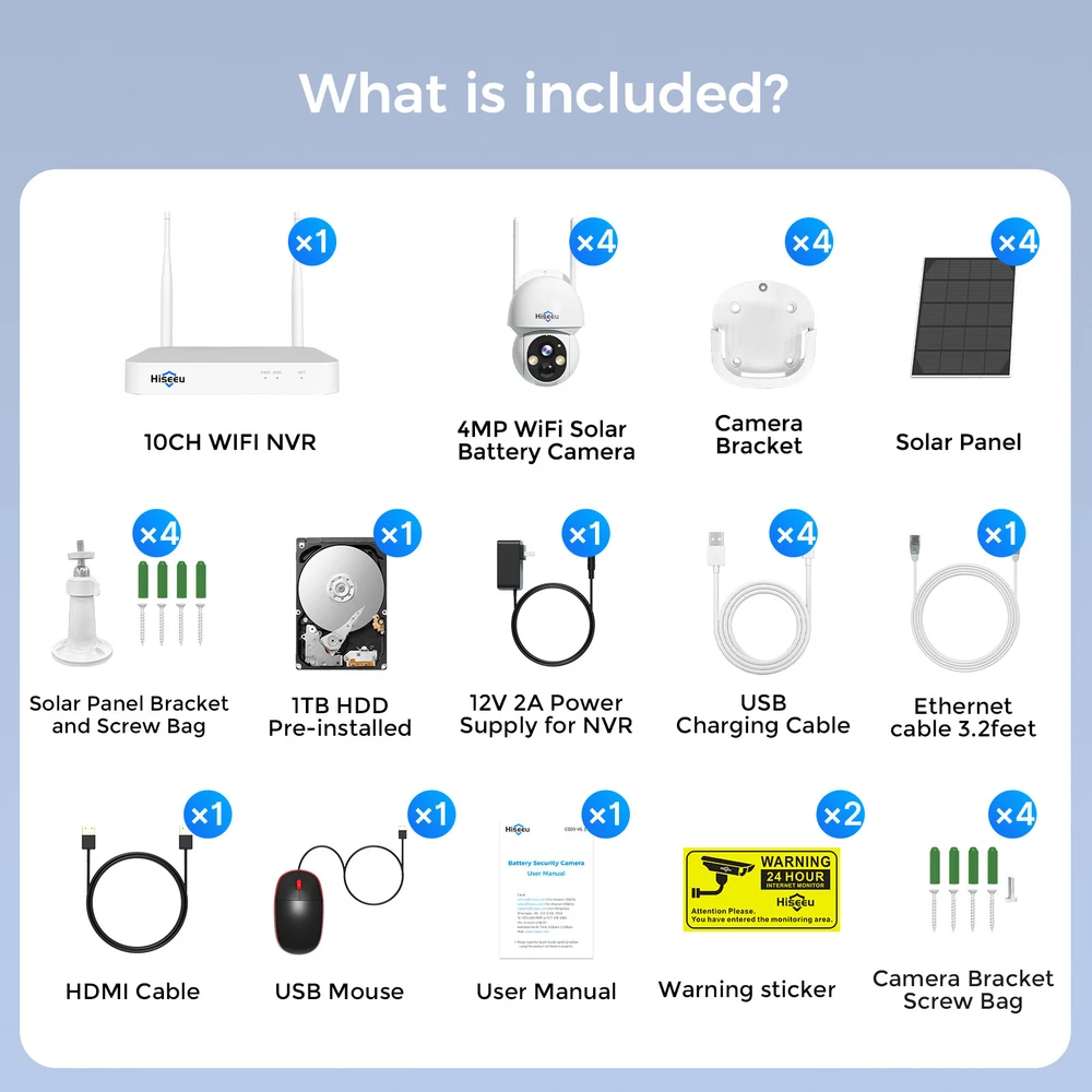Number of Cameras Included: 4 Smart Home Protocol: Wi-Fi EAN: Does not apply Manufacturer Warranty: 1 Year Model: WK-4TD504-AT Smart Home Compatibility: Hiseeu UPC: Does not apply Maximum Resolution: 4MP Storage Capacity: 1TB Operating Range: 7m Color Mode: Color Day, B&W Night APP: EseeCloud Power Source: Wall Plug-In Surveillance Technology: IP/Network Items Included: Camera Hard Drive Capacity: 1TB Hard Drive Pre-installed Country/Region of Manufacture: China NVR Channels: 10 channel Color: White Voltage: 5 V Camera Type: Dome gtin13: Does not apply Note: Only work with 2.4G wifi Features: 2 way audio, Motion/PIR Activated, battery solar powered, Night Vision, Rechargeable, Wi-Fi Operating Sound Rating: 90 dB Item Weight: 9.79 lbs Camera Connectivity: wireless/wifi Remote View Setup: Scan QR Code to Remote access in seconds Product Dimensions: 12 x 11 x 7 inches Brand: Hiseeu Type: Solar Powered Wireless Security Camera System Connectivity: Wireless MPN: Does not apply Year Manufactured: 2024 Lens Size: 2.8mm