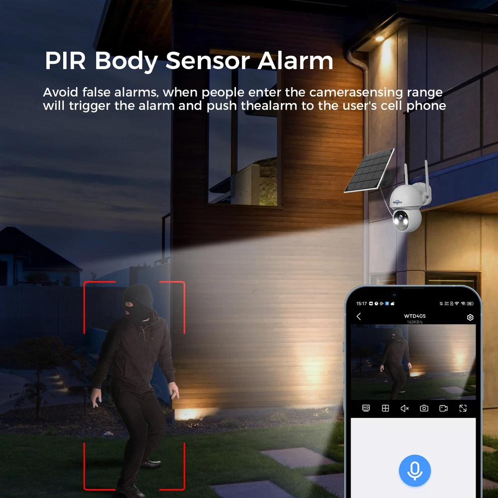 please note ,this wireless cctv system work with 2.4G wifi . this camera not 24h recording .it is PIR motion detect recording . Please note : 1.When the camera detects an animal or person entering the detection area, it will be awakened and enter recording mode. If there are no people triggering it in the environment,the camera will enter sleep mode. 4MP HD Picture Quality Day and Night You won't miss any event around your house with CMOS image sensor, the camera provides you with clearer and smoother video, two modes of night vision system lets you see all the details within 65 feet clearly even at night. PIR Detection Technology PIR sensing technology, don't worry about receiving false positives caused by flying insects etc, it will push an alarm notification to you when detect humans' movement. When the camera detects people, the camera will enter the recording mode, when no people are detected, the camera will enter the sleep mode to store power, the working mode of this camera is not 24H recording. Two-Way Audio Function This camera built in mic and speaker,you can chat with Neighbors or visitors, also can scare off unwelcome people through light alarm and sound alarm . 100% Wire-Free and Solar Powered The solar security camera comes with a built-in high-capacity rechargeable battery, fully charged through the solar panel or USB cable.The camera will be in a sleepy mode until detect motion, it will work for about 30 days after fully charged. APP Remote & 360° View The Wireless WiFi camera can work with NVR box, phone APP, computer, Alexa. 120-degree field of view and PTZ feature provide you with no blind spot surveillance, real-time viewing monitoring no matter wherever you are. Smart Playback & Share with Family The camera kit comes with a 1T HDD, all recording will be stored in it, you can view the playback anytime. Share the camera to you family through "Eseecloud" APP. All images are encrypted, no one can access the information without your consent. IP66 Waterproof Professional out battery camera work even in storm .