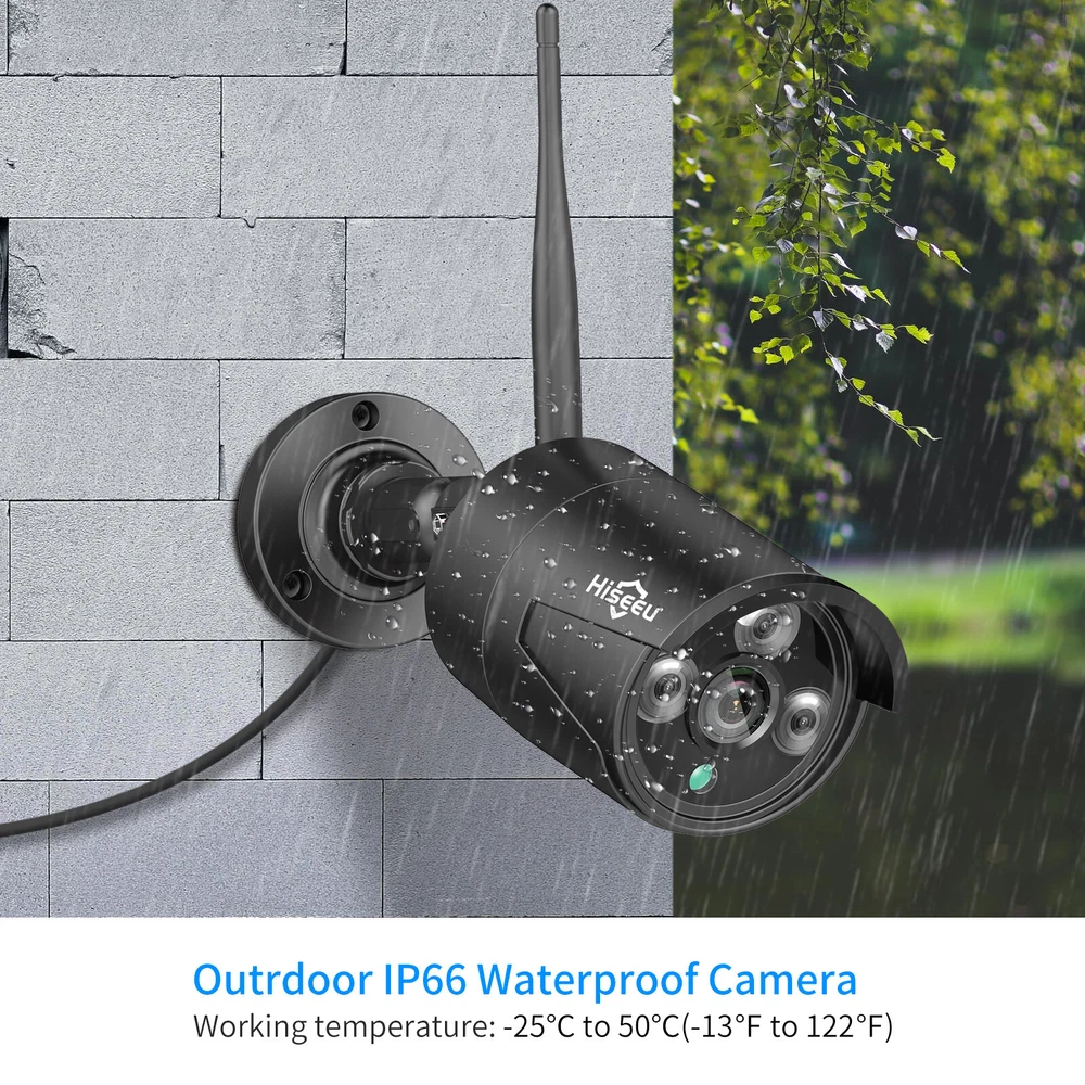 【10inch Monitor, Need Plug Power Supply】Wireless video security system wireless CCTV camera system features a 10" full HD 4K monitor (Not Touch Screen) with built in NVR. It is easy to setup and DIY installation. True plug and play. The wireless cameras and NVR monitor are auto-paired during the factory setting. You just plug all the power supply and connect TV monitor to NVR with a VGA/HDMI Cable. (NOTE: They all need to plug in the power adapter) Please note : 1.Wireless means wireless Internet connection, but also need to be plugged in the power supply/outlet for 24/7 recording 2.this camera have black and white ,pls choose the color that you need . About this item 【10inch Monitor, Need Plug Power Supply】 Wireless video security system wireless CCTV camera system features a 10" full HD 4K monitor (Not Touch Screen) with built in NVR. It is easy to setup and DIY installation. True plug and play. The wireless cameras and NVR monitor are auto-paired during the factory setting. You just plug all the power supply and connect TV monitor to NVR with a VGA/HDMI Cable. (NOTE: They all need to plug in the power adapter) 【Expandable 10 Channel Cameras】 Please search: B07K1CZN1L to order the extra camera to add to your camera system, This system includes 1x 10-channel 8MP (4096*2160) 10.1" LCD Monitor NVR and 4 x 5MP (2560*1920) wireless IP66 waterproof cameras. Connect the NVR and cameras with power adapter, cameras coming with 10ft cable power supply, it is more convenient to install. 【Waterproof& HD Video】 Records in 5MP Full HD to capture sharp and crisp images, provide crystal-clear HD live video, in order to crisp smooth footage day and night the bullet cameras build in 3 array IR cut filter with auto switch. Up to 15m Night Vision, The IP 66 weatherproof aluminum housing material to keep Indoors & Outdoors recording. 【Remotely Anytime and Anywhere】 Wireless surveillance camera system allows you to view the live video remotely anytime and anywhere by Phone and Pad (available for Android & IOS system). Download free APP “EseeCloud” from Android Google Play or Apple APP Store. Register a New Account, then add by device ID. You can view the Video by WiFi or 4G/5G Network. Supporting Windows and MAC OS system computer download Eseecloud software to remotely check. 【Dual WIFI NVR 】 Dual WIFI NVR support 2 ways to connect with network: connect with network by Ethernet cable or connect with 2.4Ghz or 5Ghz WIFI network. 【Preinstalled 1TB HDD & Cloud Storage】 H.265+ compression will save the HDD storage, 4Pcs cameras can store 30 days 24/7 days time recording, also provide cloud storage on cellphone app, but it is not free to use, each channel need buy cloud storage one by one. Please Note: camera can be wirelessly connected to the network, but it must be powered by power supply. if you miss power adapter, please tell us to get a replacement one. Wireless Surveillance NVR Kit: This All-in-One 10 Channel 8MP (4096*2160) 10.1" LCD Monitor NVR and 4 x 5MP wireless IP66 waterproof Camera. Cameras and NVR connect and set up in few minutes. There is no exposed lines anymore between camera with NVR box , more beautiful, more hidden, more safely. (Warm Note: all the cameras and NVR box need connect power supply) View the video on the mobile App from anytime and anywhere, remotely check the system on phone or computer, please connect the NVR with router by Ethernet cable or wireless connection (support 5G wifi connection) Strong anti-interference and 65ft night vision, 2304 *1296 image sensor shows more clear and stunning picture and video. Supports multi-alarm triggered (Video Loss, Motion Detection) and alarm Sound, Email, Phone, etc). Suitable for home and small project which help you record, playback, and remote. Item Feature IP66 Weatherproof IP66 super waterproof grade and dustproof, durable outdoor weatherproof casing no matter windy or raining. Install the cameras outdoor or indoor, keep your home or business safe. Note:Power adapter is not waterproof. Day/Night Camera 3MP image sensor makes clear and stunning high-def video. All cameras are equipped with infrared night vision. They can capture clear footage up to 65ft away in pitch-black darkness. Motion Detection This motion-activated email alert function allows you to always stay connected to all the unexpected movements happened in your house. An alarming email will be sent to your inbox. Expandable 10 Channel System The camera system is one-way audio, you can add other wireless cameras from heseeu brand to the NVR. Additionalcamera models to suit your different scenarios. We currently have Bullet 2-Way Audio Cameras, Dome Cameras, PTZ Cameras, Battery/Solar Cameras, looking for a suitable extra camera, please check my shop or contact us. One-way Audio Function Built-in the microphone,so you could not only view the video,but also clearly hear the people on phone app or monitor. Notice:There is no speaker in the camera, so you can't make conversation with people. 24 hours 30 days Reliable Video Recording 1TB Hard Drive Pre-installed in the WiFi NVR enables 30 days video recording (up to 6TB supported) This system allows all cameras recording at the same time. Video Playback at Any Time Replay significant evidence or funny video records. Quick search for any event video. Playback any video on different days, hours, or minutes by controlling the timer axis under the split screen. True Plug and Play The easiest wireless NVR security camera system ever! Power on and all is done! It releases you from messy cablings.No configuration and no need to hire an installation company! A real plug and play security camera system! True Wireless WIFI Connection No ethernet cable is needed to link between the NVR and the router any more, true wireless wifi connection.Freely move the 3MP NVR close to camera, camera will receive stronger wifi signal. Audio Record Sound IP Camera Built-in a integrated microphone let you hear the sound a