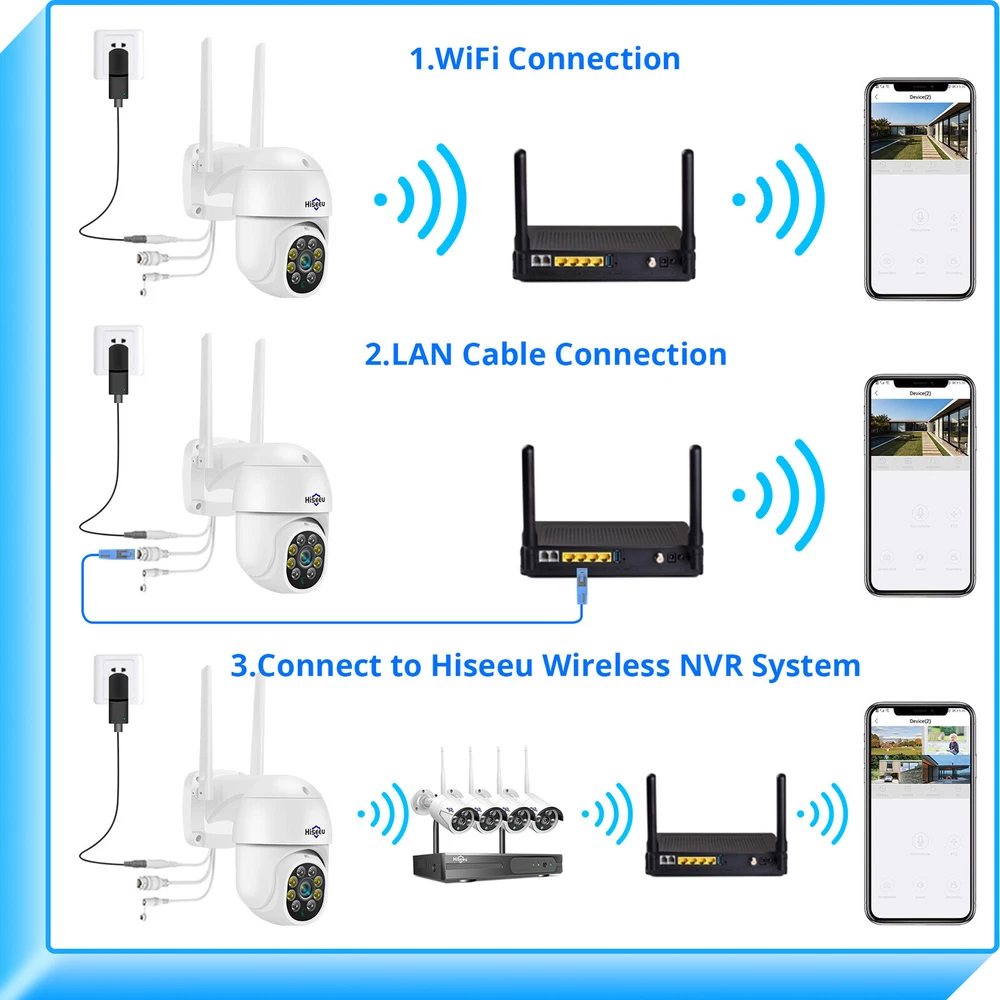 [COMPATIBLE WITH HISEEU WIRELESS SYSTEM] 5MP WiFi camera not only use independently on mobile phone, but also work with wireless camera system. [PAN TILT 360° VIEW & IP66 WATERPROOF] Vertical 90 °, horizontal rotation 320 ° and 5x DIGITAL zoom enables you monitor your property on the App at any time, any where, no blind spots. IP66 waterproof and dustproof, use high-quality materials, easily withstand the bad weather. The best choice for outdoor monitoring. please note the camera need using power adapter to supply, it isn't battery camera. [SMART DETECTION & TRACK,ALARM] Hiseeu outdoor camera support motion and humanoid detection, You can set the detection sensitivity (low/meduim/high) and detection area according to the scene. You can also customize the alarm sound. Push alerts to your Item Feature : [COMPATIBLE WITH HISEEU WIRELESS SYSTEM] 5MP WiFi camera not only use independently on mobile phone, but also work with wireless camera system. [PAN TILT 360° VIEW & IP66 WATERPROOF] Vertical 90 °, horizontal rotation 320 ° and 5x DIGITAL zoom enables you monitor your property on the App at any time, any where, no blind spots. IP66 waterproof and dustproof, use high-quality materials, easily withstand the bad weather. The best choice for outdoor monitoring. please note the camera need using power adapter to supply, it isn't battery camera. [SMART DETECTION & TRACK,ALARM] Hiseeu outdoor camera support motion and humanoid detection, You can set the detection sensitivity (low/meduim/high) and detection area according to the scene. You can also customize the alarm sound. Push alerts to your mobile app in real time when detects movement. At the same time, the camera will automatically track and record every move of the intruder. You won't miss any important moment. [5MP HD IMAGE & FULL COLOR NIGHT VISION] 5MP (2560*1920) resolution camera, super HD image, let you see the every details of the monitoring clearly. wireless camera with bright built-in floodlights, even in extremely dark environments, it can display very clear images, extending your night vision by at least 65 feet. [TWO WAY AUDIO & REMOTE VIEW] Wifi security camera enables you talk with you family or visitors on your mobile phone, what's more, you can warn and drive away the suspicious person to leave your home. Wireless ptz camera support live view on your mobile phone and windows pc through download Free APP "EseeCloud". [ENCRYPTED LOCAL & CLOUD STORAGE] Built in SD card slot supports up to 128G Micro SD card. (No SD card included). Hiseeu security cameras also support encrypted secure cloud storage, protects recordings against any footage loss that could result from damage such as theft of the camera. Hiseeu WHD305 Only Support 2.4GHz WiFi. Does not Support 5GHz WiFi. It's 5X digital zoom, not optical zoom, when you zoom in and out, the picture will blur. Four infrared lights and four floodlights provide black and white and color night vision modes. With built-in micro SD card slot.The package include a 128GB SD card.(when you insert the SD card, it better disconnect the power port). WHD305 can not only connect directly to Hisee cloud App standy alone, but also be compatible with Hiseeu wireless security camera system. Please Note: PTZ camera can be wirelessly connected to the network, but it must be powered by power supply. if you miss power adapter, please tell us to get a replacement one. How to setting Auto tracking and light alarm? Please add the camera to you mobile phone first, then go to setting, click setting icon on camera live screen--smart detection--humanoid tracking, finally click "save" when you go back. please note: Auto tracking only can setting on the App, can't setting on NVR, so you need to add the camera to you mobile phone first, and then add to NVR. you can setting light alarm on the App or NVR. click Light control on the App, select intelligent model. The floodlights will be on for 30 seconds when someone walking by. and then going off. left click your mouse on nvr, it will show a smart menu, click " light & color" icon, select smart model, then click ok. Motion & Humanoid Detection Hiseeu wireless PTZ camera supports motiont and humanoid detection. As long as someone passes by, the camera will quickly capture the human shape, which can reduce sending wrong alarm information. Customize an area to be monitored, which can make the detection and alarm more accurate. The sensitivity of mobile detection has three levels (medium high and low), so that you can avoid the trouble of frequently receiving alarm information. Auto Tracking & Alarm PTZ camera have auto tracking function, when someone walking on, the camera will follow and record every move of the intruder. The intelligent model can be set. When it is detected, the floodlight will light up and give an alarm sound to scare off intruders. At the same time, the alarm information is sent to the mobile phone immediately. Two Way Audio Mera equipped with noise proof microphone and loud speaker to provide smooth two-way voice, so that you can enjoy fast and convenient communication with your family or pets when you work or vacation outside. You can also warn intruders by two-way voice. The home wifi Full Color Night Vision Equiped with 4 bright floodlight for night vision providing truly colorful nightime surveillance videos to you, so that any intruder's face can not escape the clear night vision of the camera. Wireless security camera can choose infrared / full color / lntelligent. When the environment starts to dim, WiFi camera will automatically switch to night vision mode. IP66 Weatherproof The waterproof protection grade reaches IP66, Extreme weather can also work. which is the best choice for outdoor monitoring, Working environment temperature ranges from -20°C to 50°C, Humidity 10%~90%, non-condensing, sturdy and durable. Provide Two Storage You can choose between the two storage modes. The encrypted cloud storage keeps your recording private an