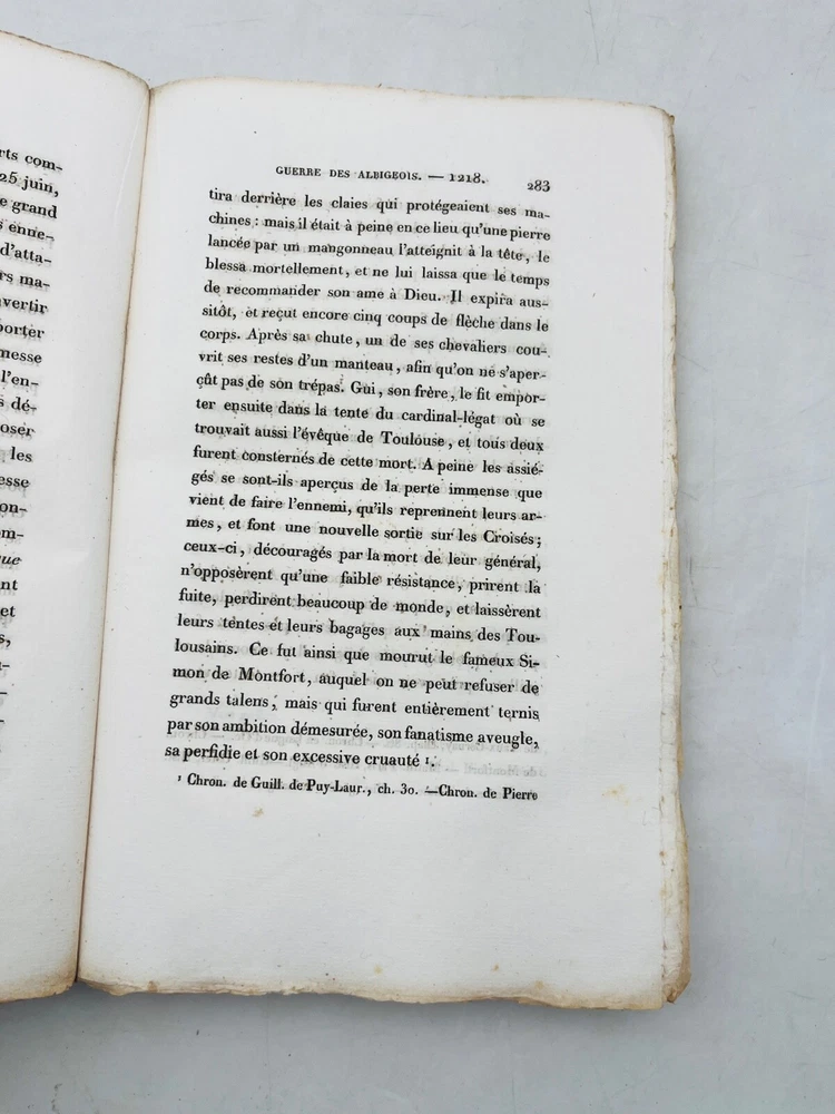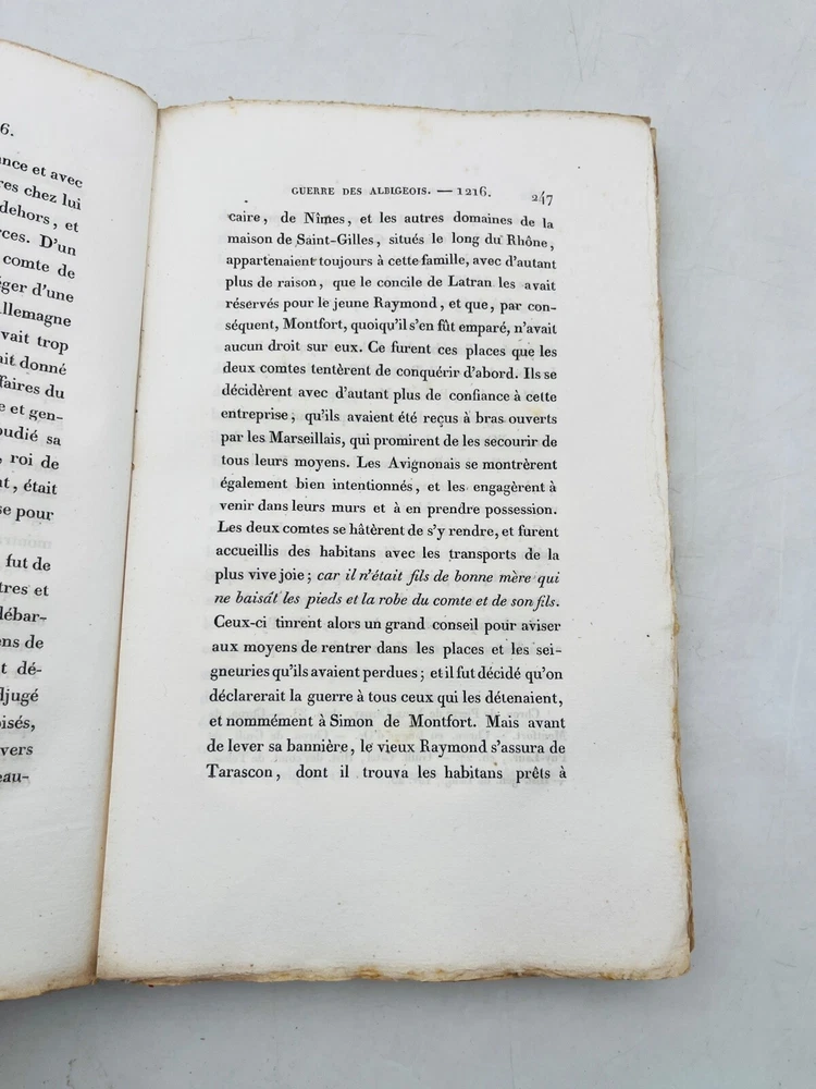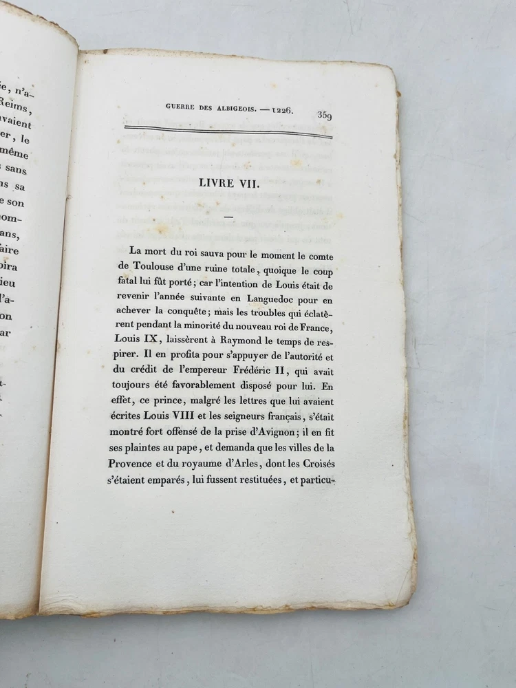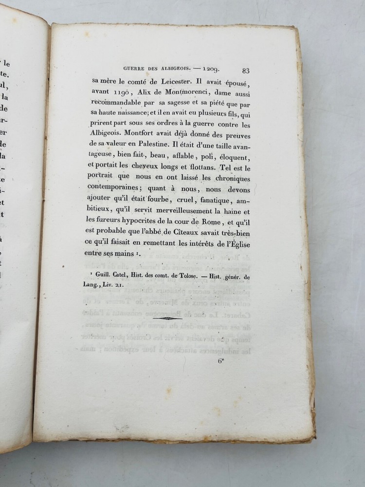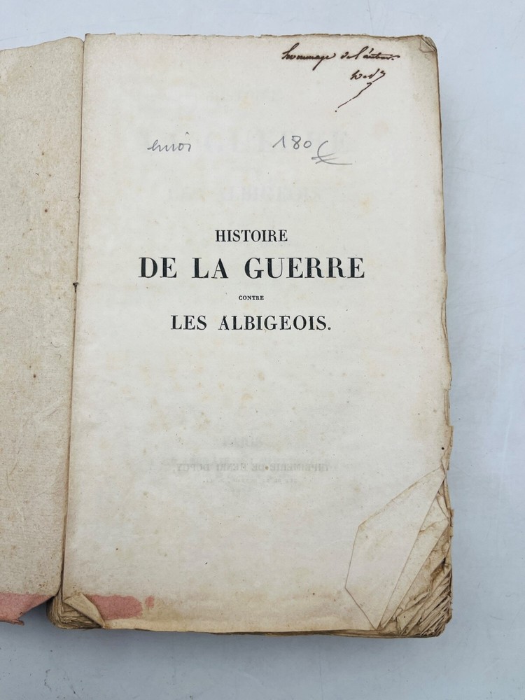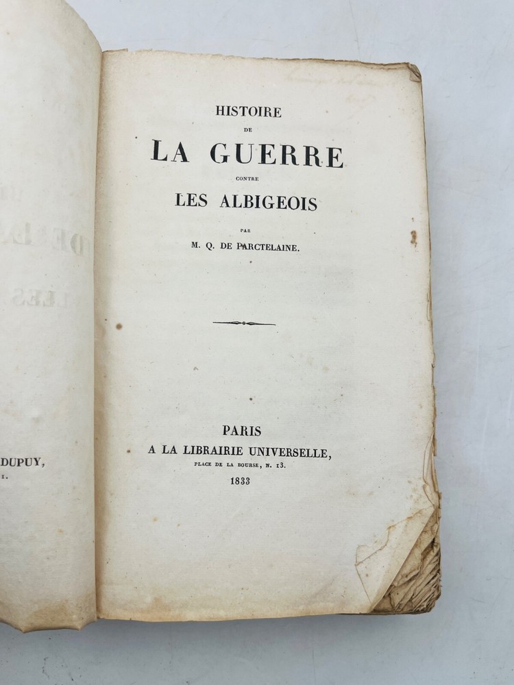 Histoire de la guerre contre les Albigeois Par M. Q. de Parctelaine Paris , à la Librairie Universelle, place de la Bourse, n° 13 1833 Rare édition parisienne de 1833 consacrée à l’un des épisodes les plus dramatiques de l’histoire religieuse médiévale française : la croisade contre les Albigeois. Publiée chez la Librairie Universelle, cette étude due à M. Q. de Parctelaine s’inscrit dans une tradition romantique de redécouverte du Moyen Âge, nourrie de références littéraires et historiques. L’auteur retrace avec verve les événements de la croisade initiée par le pape Innocent III contre les Cathares, évoquant la chute de Béziers, le siège de Montségur et la répression orchestrée par Simon de Montfort. Relié en brochure d’origine, ce volume est un précieux témoignage d’érudition du XIXe siècle, mêlant prose narrative et engagement historiographique. G12