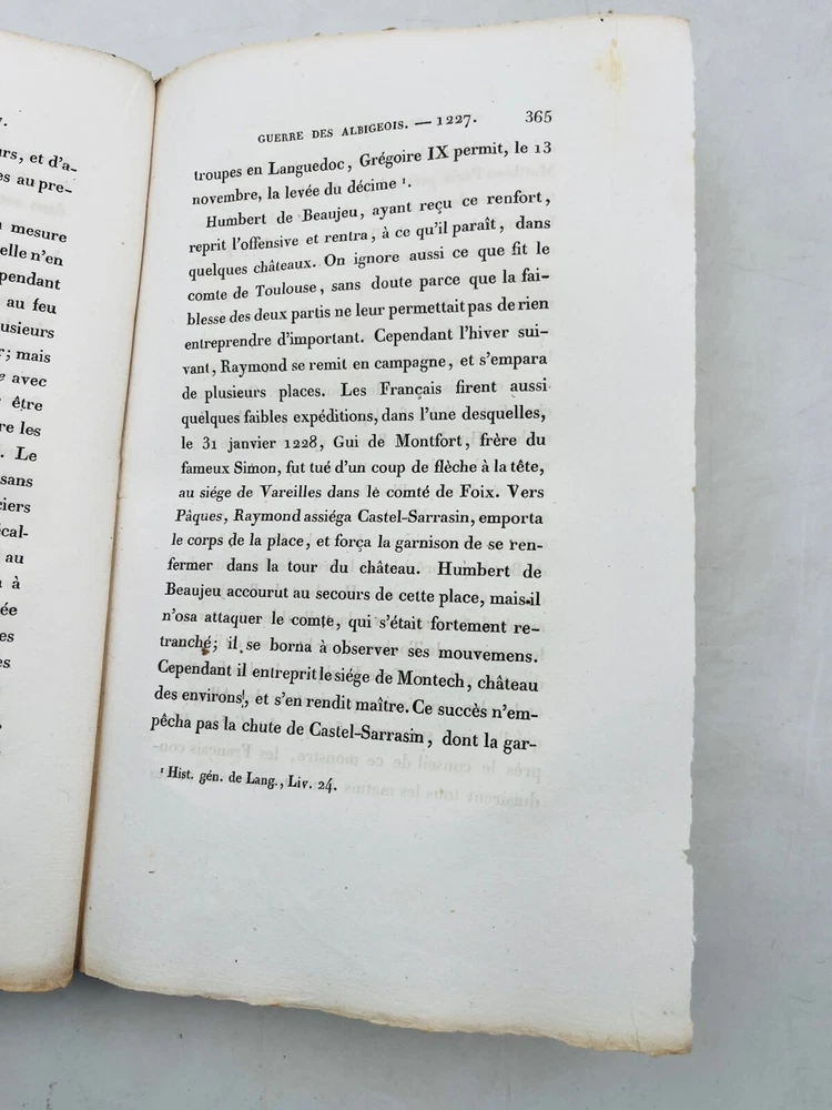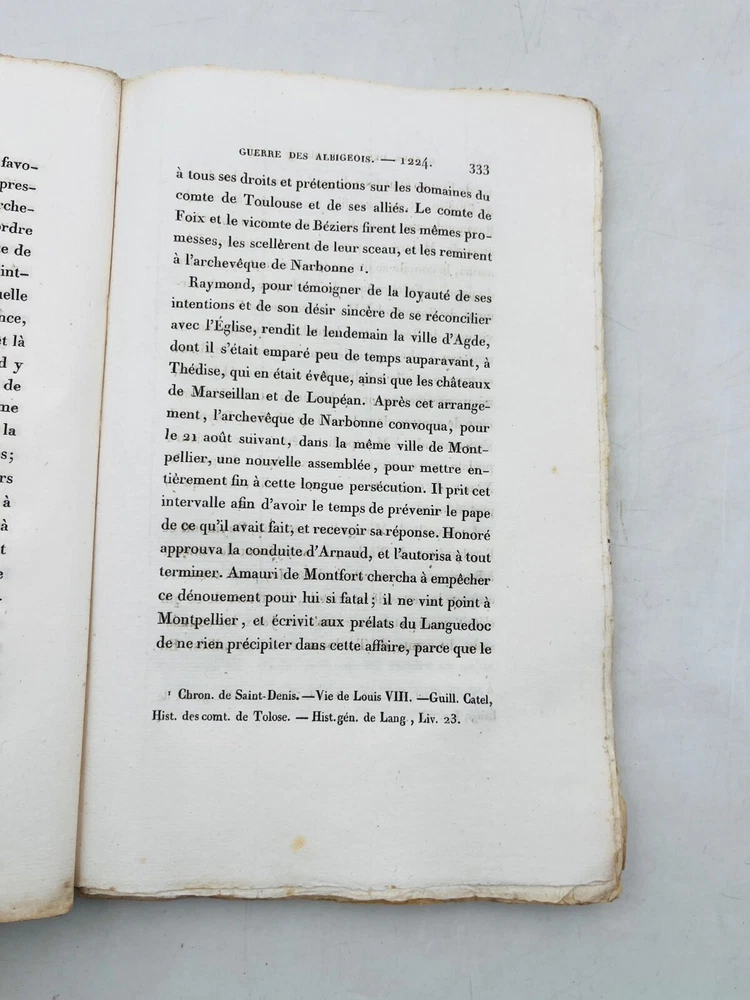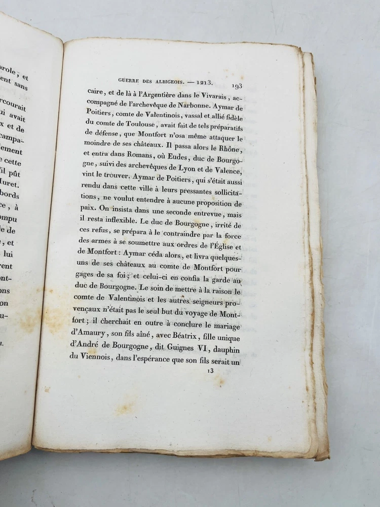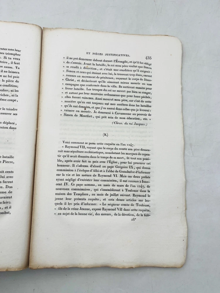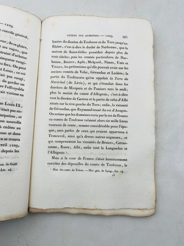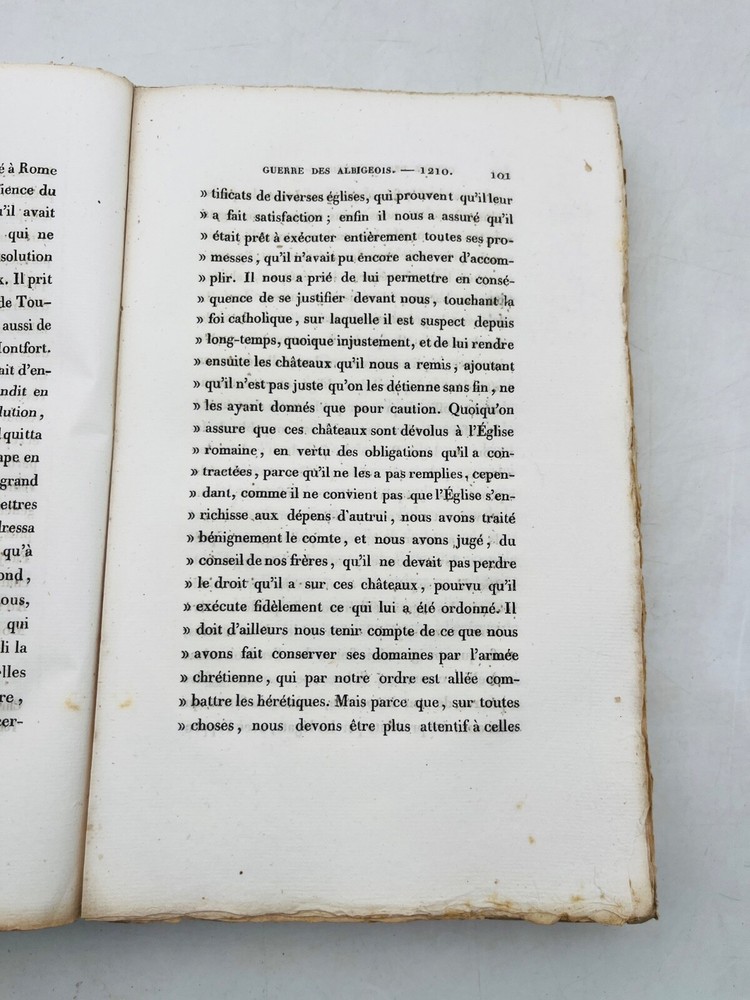 Histoire de la guerre contre les Albigeois Par M. Q. de Parctelaine Paris , à la Librairie Universelle, place de la Bourse, n° 13 1833 Rare édition parisienne de 1833 consacrée à l’un des épisodes les plus dramatiques de l’histoire religieuse médiévale française : la croisade contre les Albigeois. Publiée chez la Librairie Universelle, cette étude due à M. Q. de Parctelaine s’inscrit dans une tradition romantique de redécouverte du Moyen Âge, nourrie de références littéraires et historiques. L’auteur retrace avec verve les événements de la croisade initiée par le pape Innocent III contre les Cathares, évoquant la chute de Béziers, le siège de Montségur et la répression orchestrée par Simon de Montfort. Relié en brochure d’origine, ce volume est un précieux témoignage d’érudition du XIXe siècle, mêlant prose narrative et engagement historiographique. G12