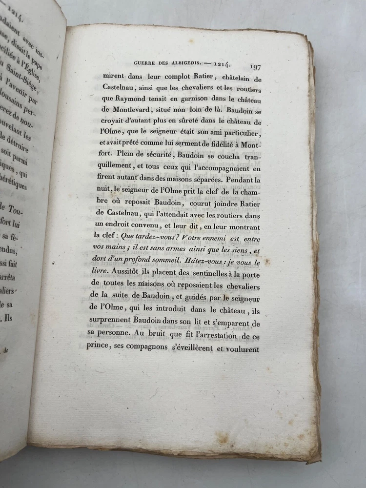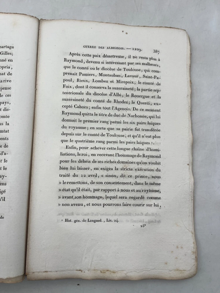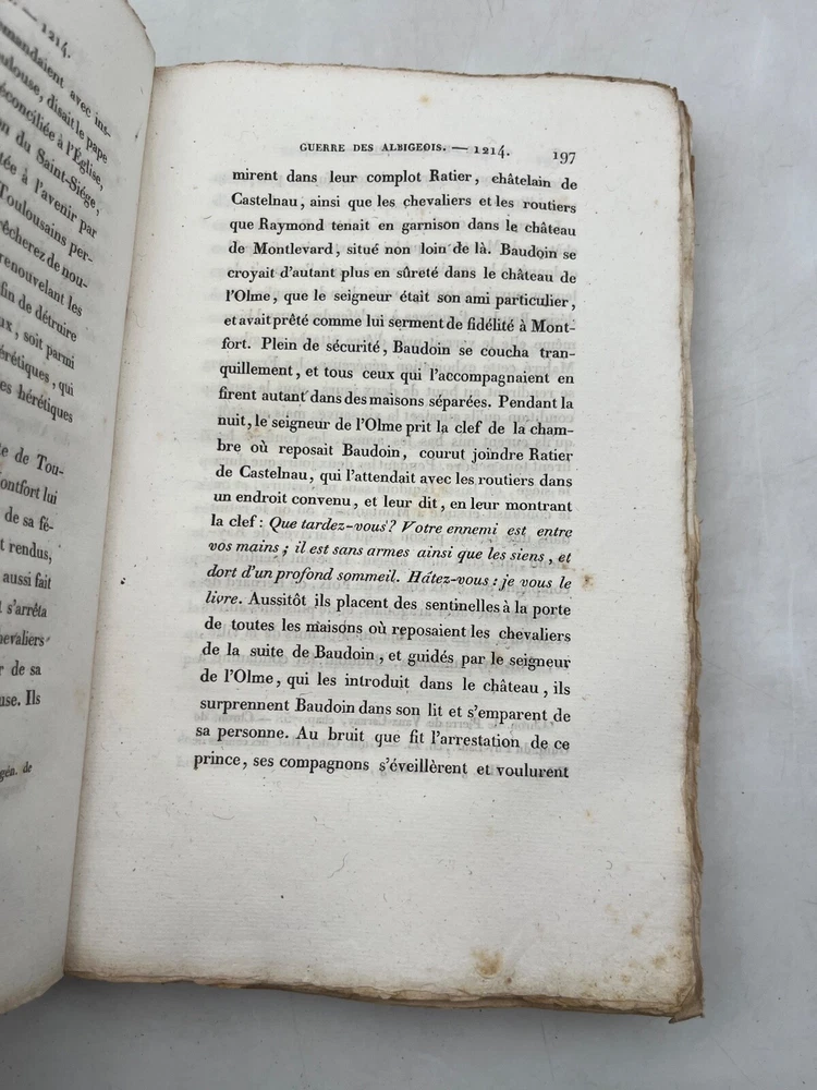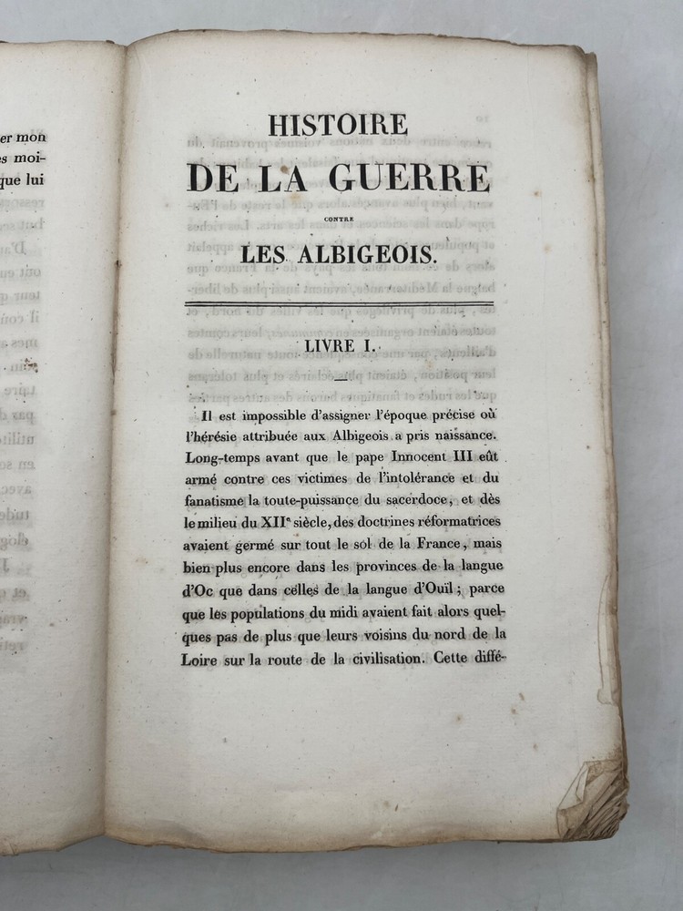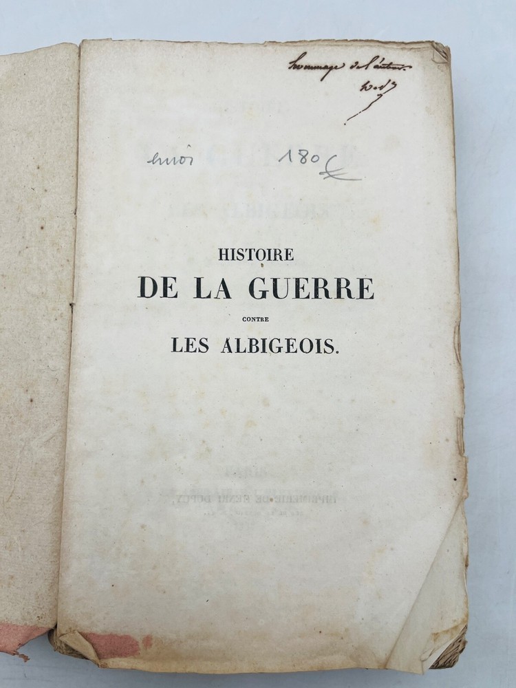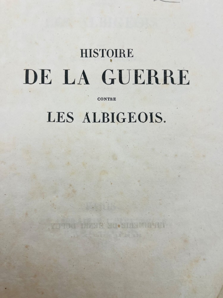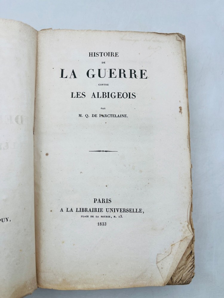 Rare édition de cette chronique historique sur la croisade contre les Albigeois, rédigée par M. Q. de Parcetelaine, figure mineure mais documentée du romantisme historisant. L’ouvrage, paru en 1833, s’inscrit dans la veine des récits patriotiques et moralisateurs, nourris par les sources médiévales et l’historiographie ecclésiastique. L’éditeur, la Librairie Universelle, installée place de la Bourse à Paris, fut active dans la diffusion de textes populaires et historiques à destination d’un lectorat bourgeois. L’exemplaire porte l’ex-libris manuscrit « Bibliothèque de Montredon » sur le premier plat, témoignant d'une provenance méridionale probablement liée au contexte géographique du sujet. J12