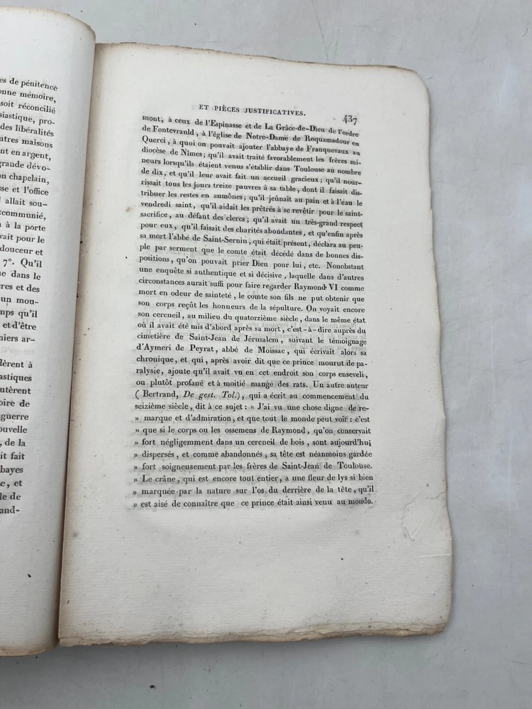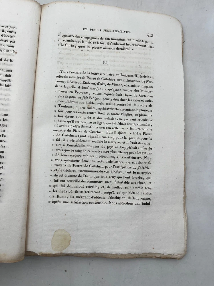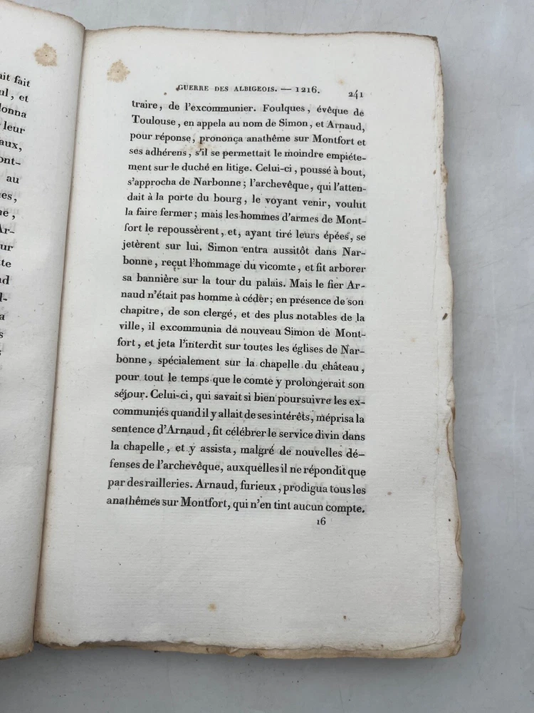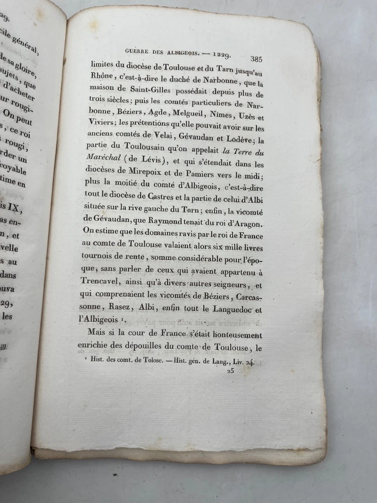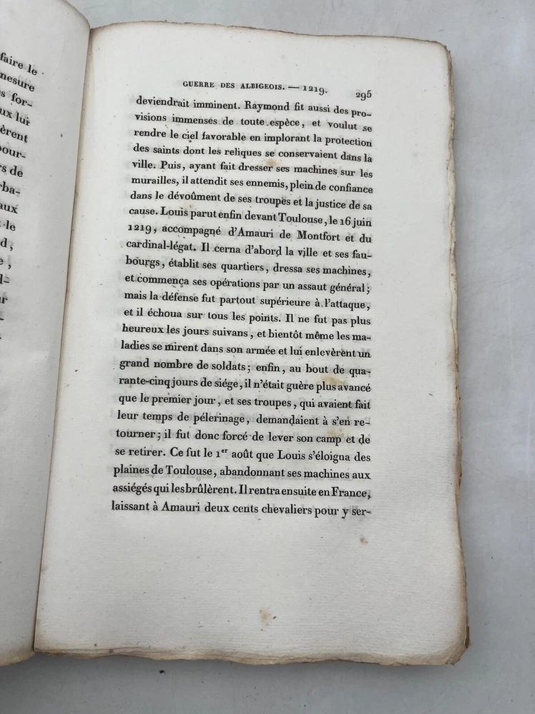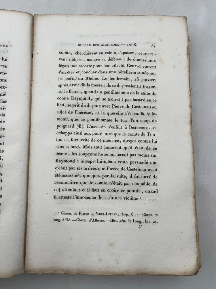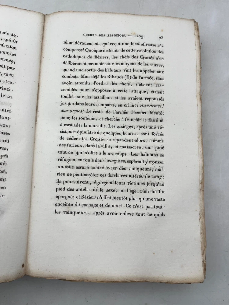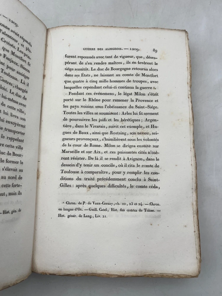 Rare édition de cette chronique historique sur la croisade contre les Albigeois, rédigée par M. Q. de Parcetelaine, figure mineure mais documentée du romantisme historisant. L’ouvrage, paru en 1833, s’inscrit dans la veine des récits patriotiques et moralisateurs, nourris par les sources médiévales et l’historiographie ecclésiastique. L’éditeur, la Librairie Universelle, installée place de la Bourse à Paris, fut active dans la diffusion de textes populaires et historiques à destination d’un lectorat bourgeois. L’exemplaire porte l’ex-libris manuscrit « Bibliothèque de Montredon » sur le premier plat, témoignant d'une provenance méridionale probablement liée au contexte géographique du sujet. J12