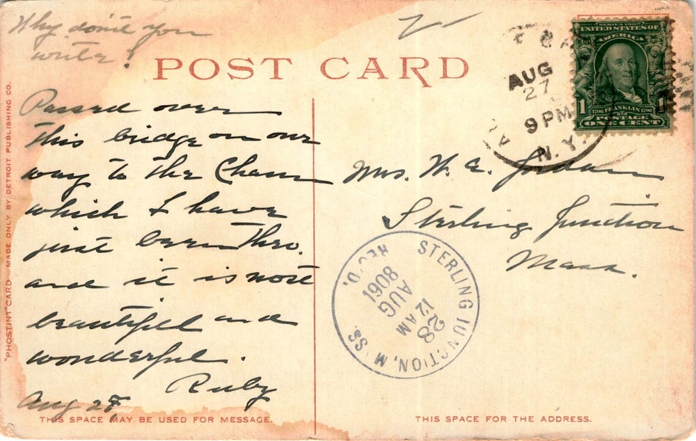 MAKE AN OFFER. THE MORE YOU BUY THE BETTER DEAL I WILL ACCEPT The postcard features an image of the Failroad Bridge and Rainbow Falls at Ausable Chasm, NY, with a copyright date of 1905 by Detroit Photographic Co. It mentions the unique Phostint card made only by Detroit Publishing Co. The postcard also has a United States postage stamp dated 1908 and a handwritten message on the back.