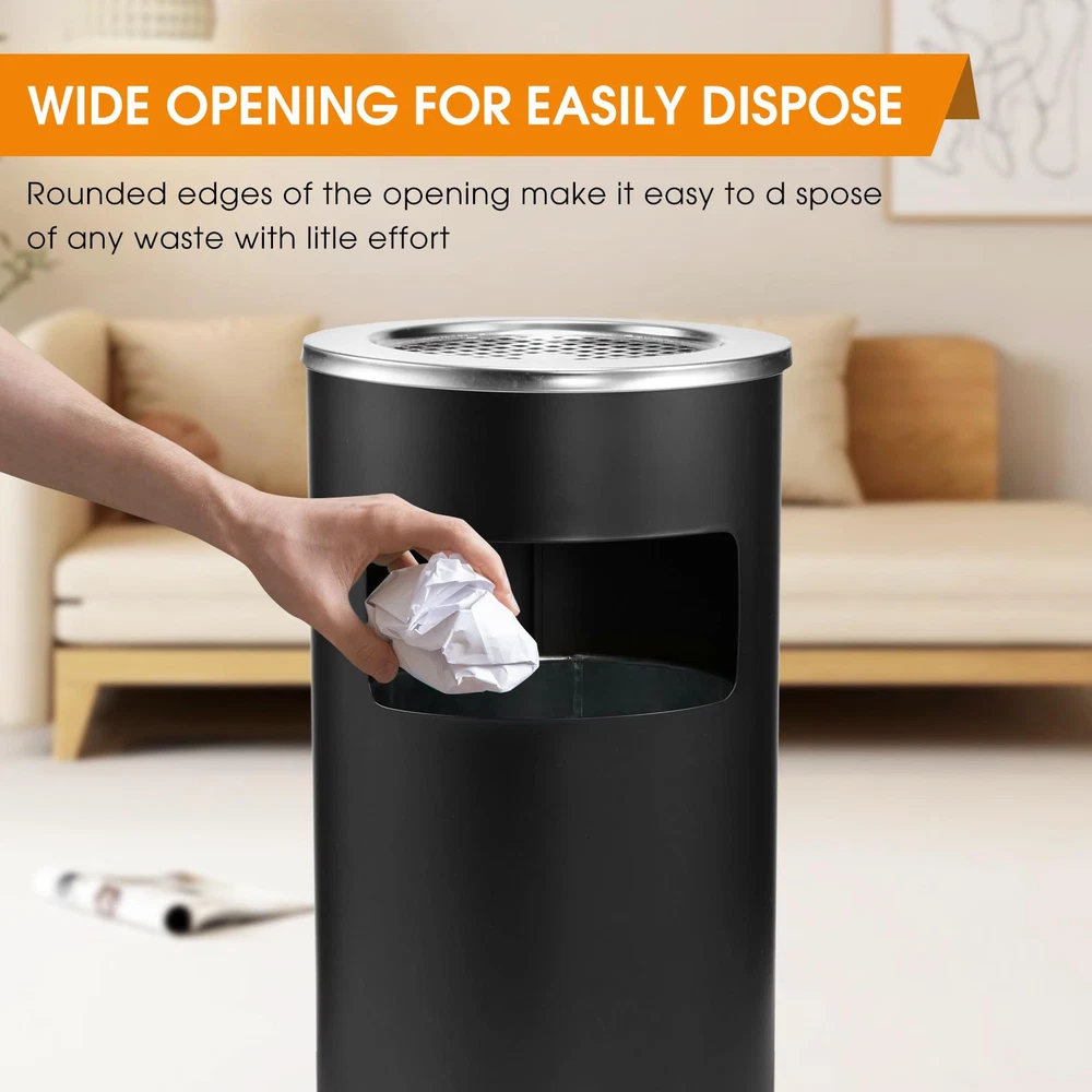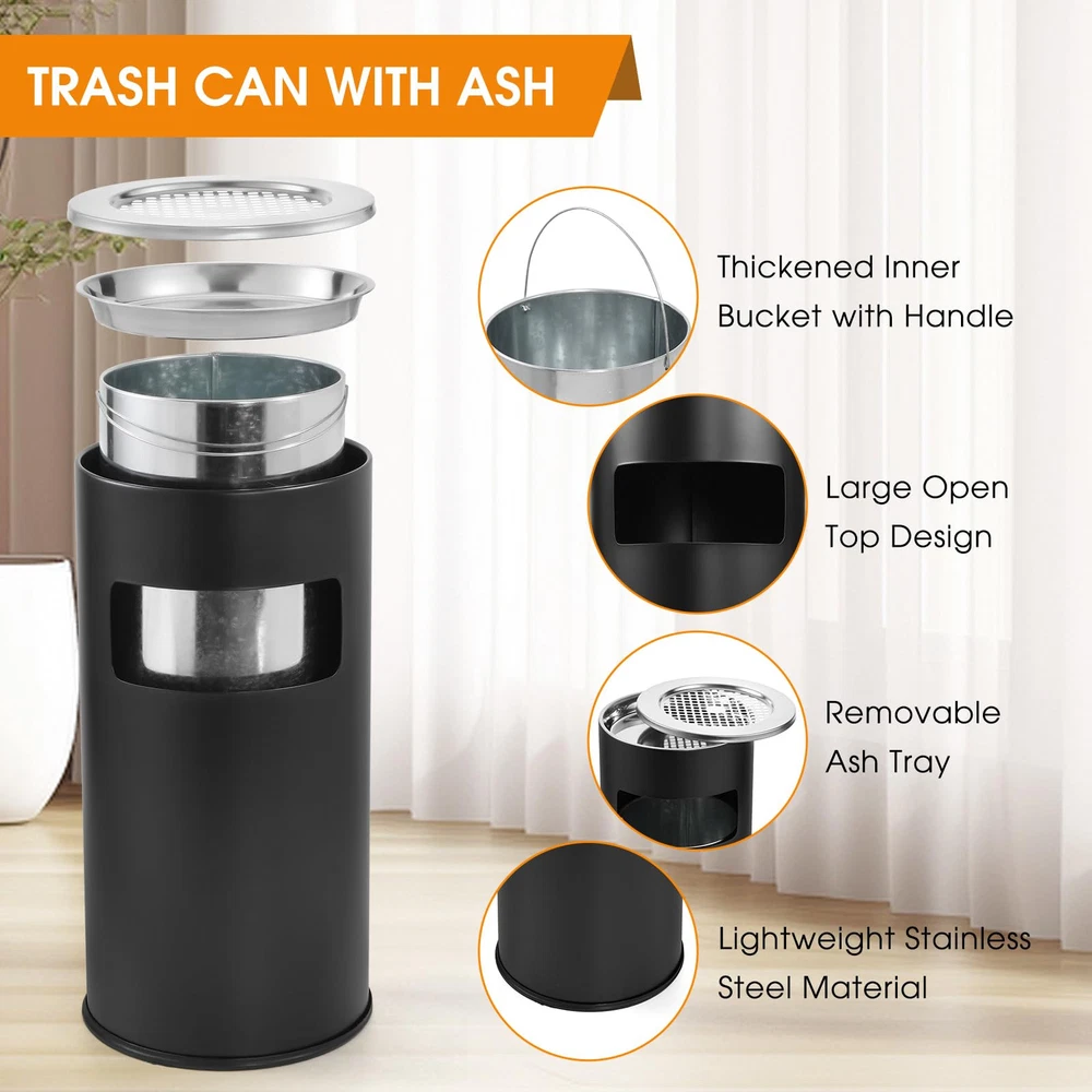 【Large Capacity & Upgraded Inner Bucket Design】: Trash can size: 30*30*61cm/11.8x11.8x 24inch, Inner barrel size: 25*38cm/9.8x15"inch; Larger capacity than other trash cans, effectively extending the time for handling and replacing garbage bags. upgraded inner bucket fits better with the opening, eliminating the worry of garbage falling into the gap. The silver round design is sleek and can blend seamlessly with any home, kitchen, or office, suitable for commercial and outdoor use. 【Stainless Steel Trash Can with Lid】: Made of high-quality stainless steel material, lightweight and durable, not easily deformed. scratch-resistant, rust-proof, wind-proof, and rain-proof. It is also resistant to fingerprints and stains, making it easy to clean. greatly maintain cleanliness in outdoor areas such as gardens, backtyards, outdoor parties, dining areas, as well as indoor environments, does not produce odors 【Removable Inner Bucket and Lid Top Cover】: The top removable mesh tray makes it convenient to clean the tray and allows smokers to easily dispose of cigarette butts, effectively preventing the danger of cigarette butts burning garbage. When replacing the inner bags, simply lift the lid to quickly complete the task. The hidden trash bag design makes the trash can more aesthetically pleasing and tidy. The tray cover can be wiped with a damp cloth or rinsed with water. 【Spacious Opening for Easy Disposal】: Different from other foot pedal or sensor trash cans that may malfunction over time, the simple open lid design allows you to easily and quickly throw garbage or food waste into the trash can without it falling around. The smooth and aesthetically pleasing edge of the opening ensures the safety of your hands during the process of disposing of garbage. 【Suitable for Indoor and Outdoor Use】: Not only suitable for outdoor places with high foot traffic, hotel lobbies, restaurants, banquet halls, conference venues, cafes, entertainment and picnic areas, companies and university campuses, wooden boardwalks, tourist attractions, also perfect for indoor environments such as kitchens,bathrooms, bedrooms, backyards, courtyards in homes.