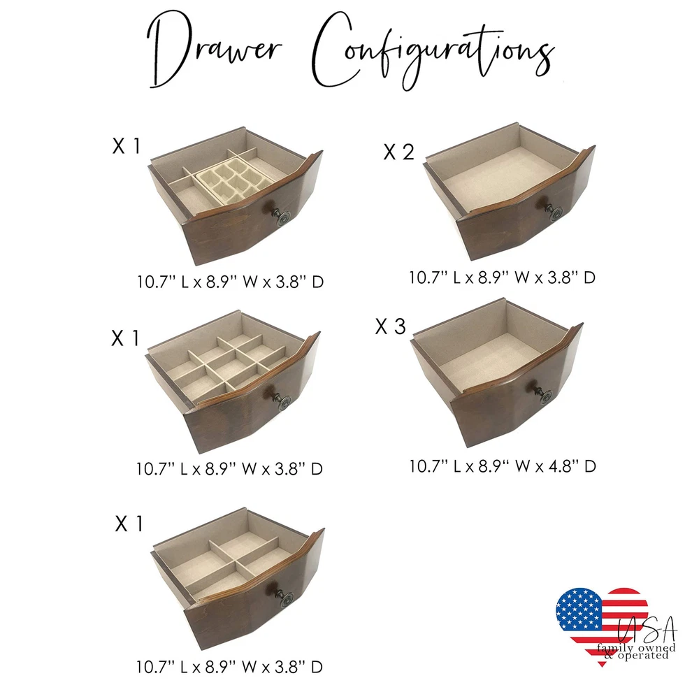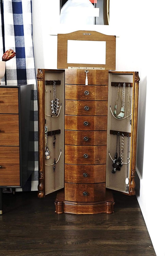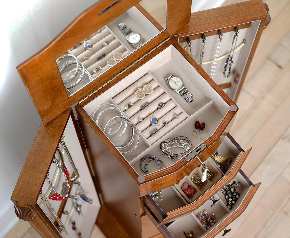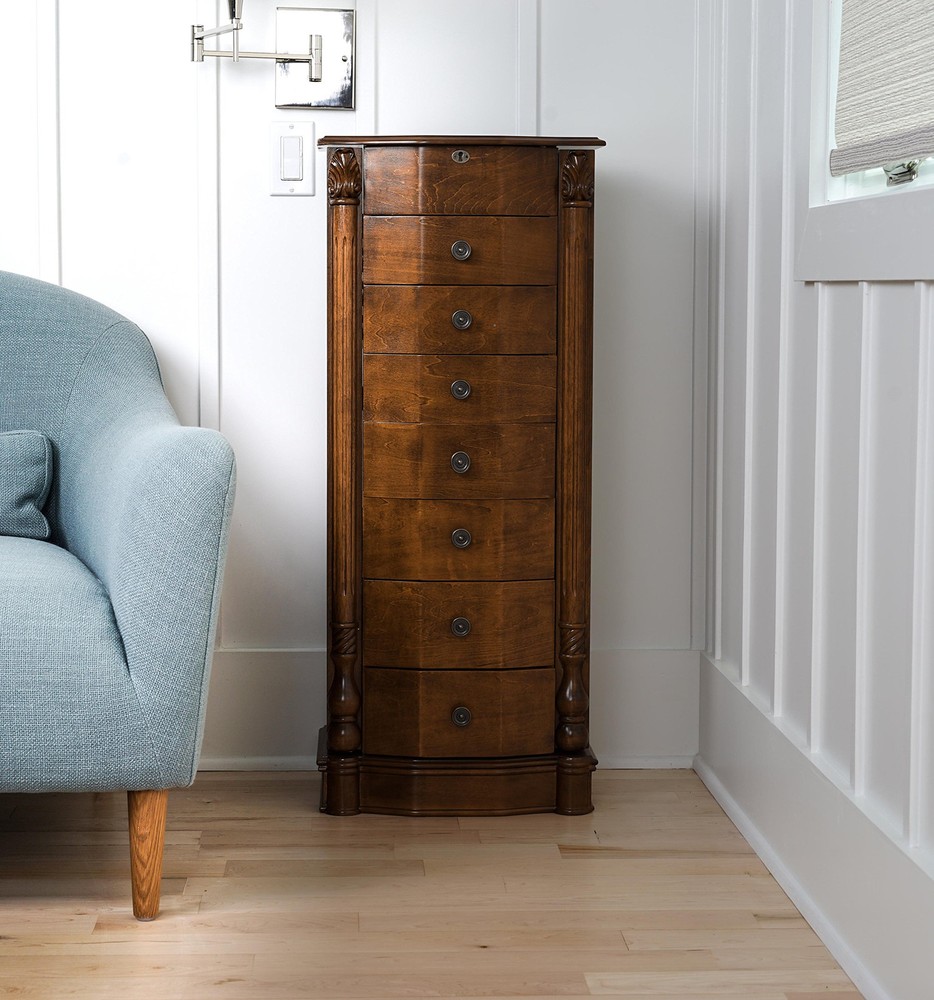 Indulge in the regal charm of the Antoinette Jewelry Armoire. This stately piece exudes elegance with its rich walnut finish, showcasing the natural wood grain in all its glory. The antiqued brass drawer pulls and exquisite decorative trim work add a touch of sophistication to this magnificent armoire. With 7 spacious pull-out drawers, you'll have ample space to organize your extensive jewelry collection. The 2 hidden doors on either side provide a convenient and tangle-free storage solution for your necklaces. And for your go-to pieces, the locking top compartment offers easy access, complete with ring rolls, divided compartments, and a mirror. Prepare to be captivated by the Antoinette Jewelry Armoire, a treasure trove of luxury and style. Handcrafted Antique Walnut Finish: Our expert artisans meticulously apply a rich and luxurious antique walnut finish to each jewelry armoire, ensuring a stunning and unique piece for your collection. 7 Lined and Padded Drawers: Keep your jewelry collection organized and protected with our jewelry armoire's 7 spacious drawers, each lined and padded to prevent scratching or damage. Separated Compartments: Say goodbye to tangled necklaces and misplaced earrings! Our jewelry armoire features separated compartments in each drawer, allowing you to easily organize and find your favorite pieces. Dual-Sided Necklace Doors: Never worry about tangled necklaces again! The doors of our jewelry armoire open on both sides, featuring 8 double-prong necklace hooks in each door, providing ample space to hang your necklaces with ease. Mirror and Divided Compartments: Conveniently store and accessorize with our jewelry armoire's built-in mirror, perfect for checking your look before heading out. Lift the lid to reveal divided compartments for storing smaller items like rings, bracelets, and earrings. Lock and Key Feature: Keep your precious jewelry safe and secure with the lock and key feature of our jewelry armoire. Enjoy peace of mind knowing that your valuables are protected from unwanted access. Product Dimensions: 37.75" H x 16" W x 10.75" D