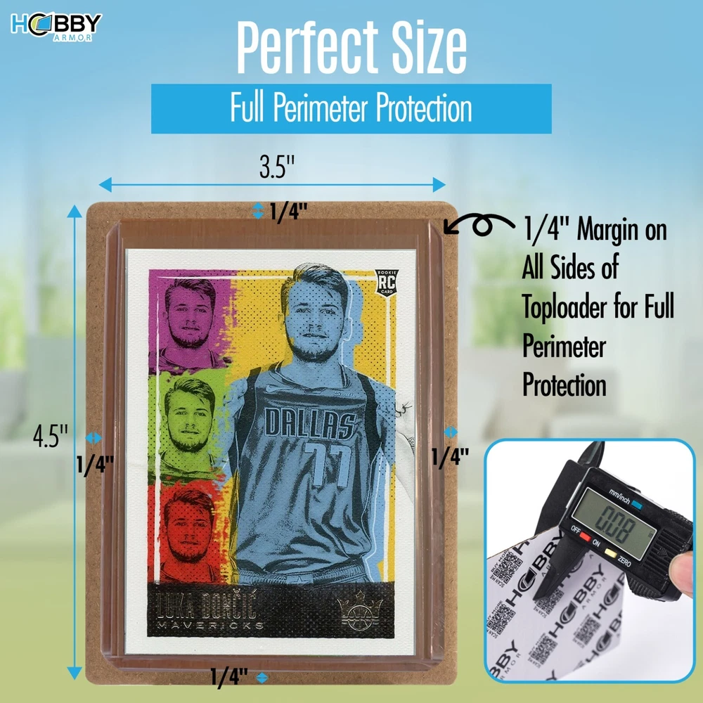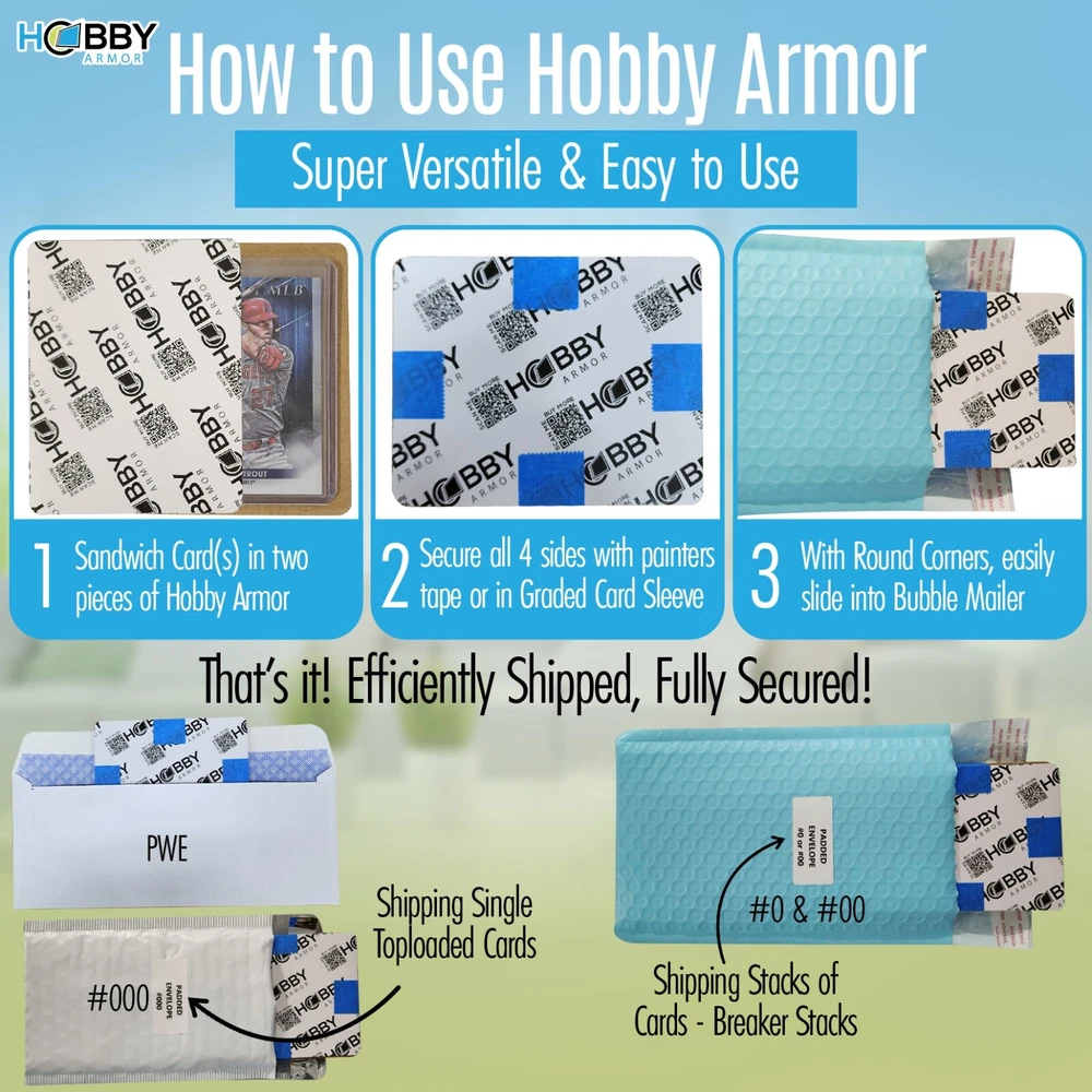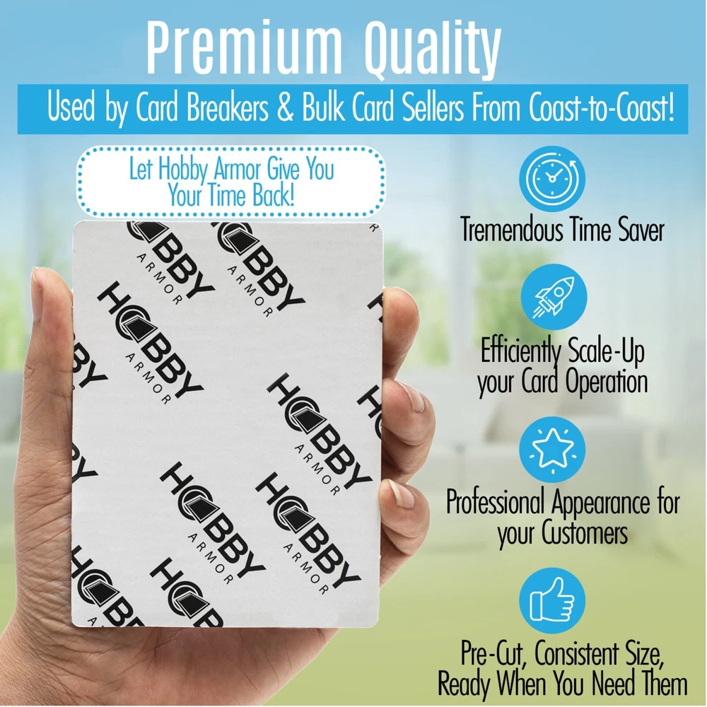 Hobby Armor Card Shipping Protectors 3.5 x 4.5 - Trading Card Shipping Supplies - Trading Card Supplies - Sports Card Shipping Supplies - Cardboard Sleeves for Cards - Trading Card Mailer - Box of 600 & Toploader Storage Box Much lighter than plastic! Hobby Armor trading card envelopes are made from strong thin corrugated cardboard, with an extra glossy layer for strength and a professional look. Much more than just cardboard! Premium card packaging for card collectors. Round Corners! Protectors with sharp corners tend to rip into card bubble mailers and are difficult to load, wasting supplies and time. Our cardboard shields for trading cards have Rounded Corners and are super easy to load into bubble envelopes. Designed to be used with toploaders, penny sleeve cards and raw cards. Our card shipping envelopes for trading cards are perfect to use with a standard envelope pwe or thick padded envelopes. You sell the cards and let us do the busy work for you! Cardboard insert dimensions are 3.5"x4.5" with rounded corners. Designed to offer a 1/4" margin on all sides of the top loader, for maximum protection from a ding in transit. Defend coats! Baseball card supplies, built for collectors by collectors! Premium Bulk pack of 600 of Trading Card Shipping Protectors - Cardboard sleeves for cards. Our card shield for shipping is perfect for card breakers, bulk card shippers, consignment sellers and card collectors of all levels. We support the hobby ALL HOBBY ARMOR PRODUCTS ARE DESIGNED BY CARD COLLECTORS, FOR CARD COLLECTORS. WE CARE ABOUT THE HOBBY AND IT SHOWS IN EVERY PRODUCT WE PRODUCE! HAPPY COLLECTING!