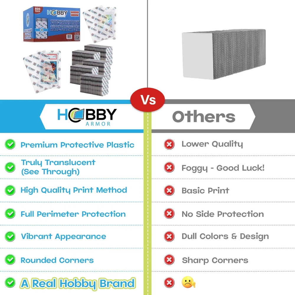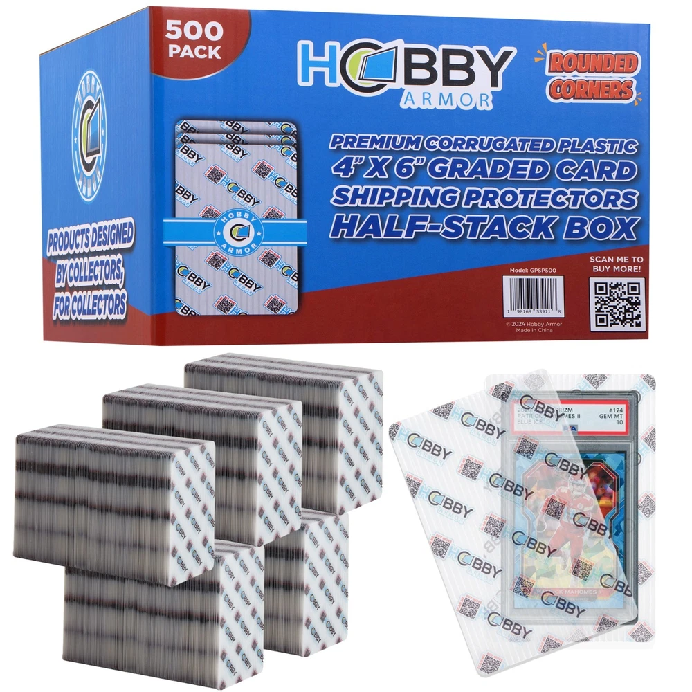 Hobby Armor Premium Plastic Graded Trading Card Shipping Protector 4x6, Bulk 500 Pack, Trading Card Shipping Supplies, Cardboard Sleeves Alt, Trading Card Supplies, Trading Card Packaging Shield Mailers Hobby Armor premium plastic card shipping protectors provide exceptional protection for your trading card shipments. These corrugated plastic shields are specifically designed for shipping graded cards and for submitting cards for grading Each shipping protector is 4x6 inches and only weighs 0.4 ounces! Hobby Armor card protectors also feature rounded edges, making them ideal for loading into bubble envelopes. Plastic inserts are suitable for shipping in #0 or #00 bubble mailers Our material is not only highly protective, but also extremely translucent (See Through). This enables easy visibility of the card inside. Our design features multiple colors and has a vibrant, professional look for your customers. Dress to impress! Premium Box of 500 Sleeves - Trading card packaging you can trust. Card mailers for trading cards are perfect for sports and TCG card breakers. Trading card mailer is great for frequent card shippers. Premium Baseball card mailers All Hobby Armor products are designed by card collectors, for card collectors. We are collectors in the hobby, just like you! Our goal is to bring innovation to the trading card world. We want to sincerely thank you for supporting a Real Hobby Brand! HAPPY COLLECTING!