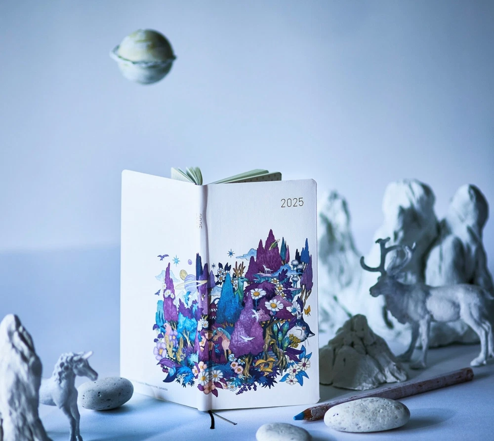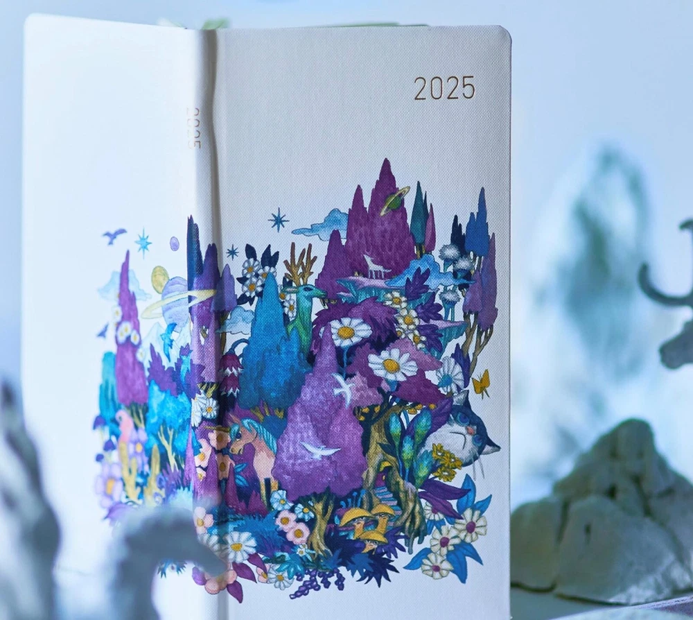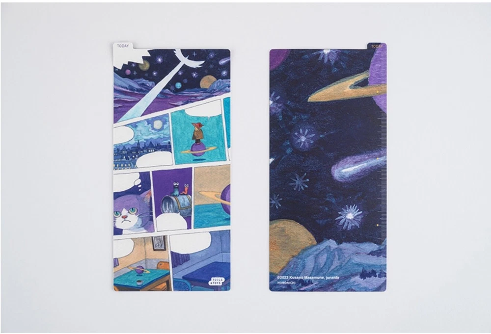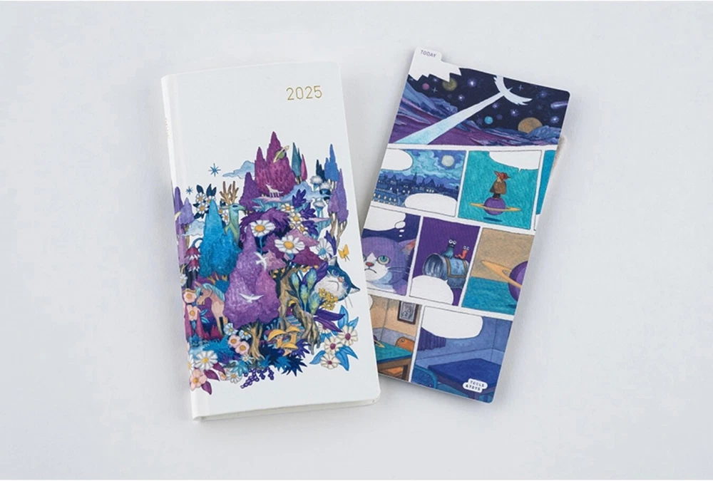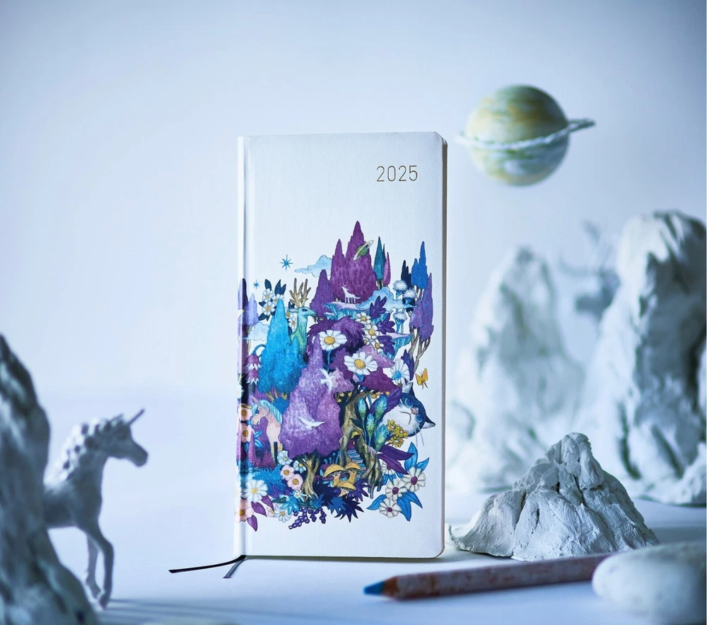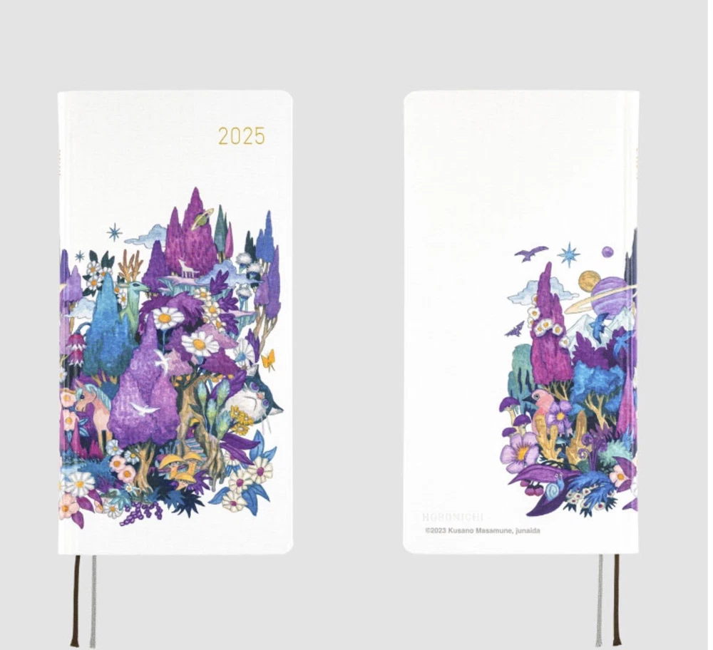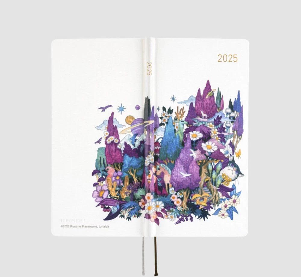 2025 Hobonichi Weeks Hardcover Book /Masamune Kusano x junaida /Through the Purple Night/ Weekly Horizontal / ENG edition / Jan start Masamune Kusano x junaida / Through the Purple Night 2025 Hobonichi Weeks Hardcover Book / Weekly Horizontal / ENG Edition / Jan start / Mon start The song-art book Himitsu Stranger is based on the lyrics from 13 songs recorded by Masamune Kusano for the music album “Himitsu Studio” by his rock band Spitz. Artist junaida illustrated the lyrical stories for each of the songs. Inside the book is an illustration called Through the Purple Night, which was then chosen for this Weeks book cover. Through the Purple Night was actually the first illustration junaida did among everything in the song-art book. It shows a forest enveloped in purple, with birds, cats, and other small animals, as well as trees, flowers, and other cute plants, topped off with some planets and other things. This really completes the look as the all-over print recreates this artwork and its unique floating feeling. The cover material is a rough, textured canvas and the cover is a hardcover with a slight bend to it. The base color is the same white as featured in the original song-art book. The cover and spine have the year 2025 foil-printed in gold for a simple, refreshing look. This techo also includes a pencil board with Through the Purple Night. The front side has a scene that stirs the imagination, while the back shows details that really highlight the texture of junaida’s watercolor paintings. Pair it with the techo to immerse yourself in the world of junaida’s art. The song-art book Himitsu Stranger that this cover is based on is also for sale in the Hobonichi Store so you can experience the rich blend of lyrics with illustrated narratives. When you order this Hobonichi Techo Weeks, you’ll receive a clear, adhesive corner pocket you can stick anywhere you like. The book uses thin and light yet durable Tomoe River paper. This paper that underwent an overhaul with the 2024 edition techo is more resistant to bleed through, lighter despite being the same thickness, and has a smoother surface by adjusting the fibers of the paper. SizeH: 188 x W: 94 x T: 11 mm / H: 7.4" x W: 3.7" x T: 0.4" *Specifications may vary slightly WeightApprox. 140 g Main materialRayon / Paper The Weeks book has space for writing in plans or journal entries, and it also has 69 pages of grid paper memo pages in the back (73 pages in the English edition). The back of the book contains bonus pages, including Sample Symbols and Icons and Oodles of Noodles