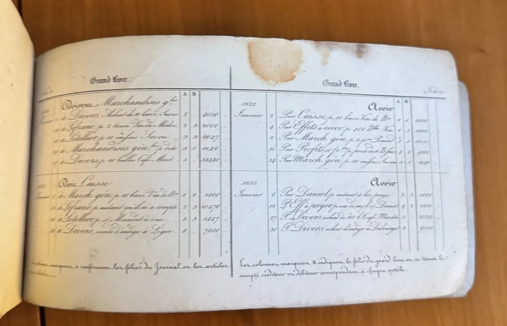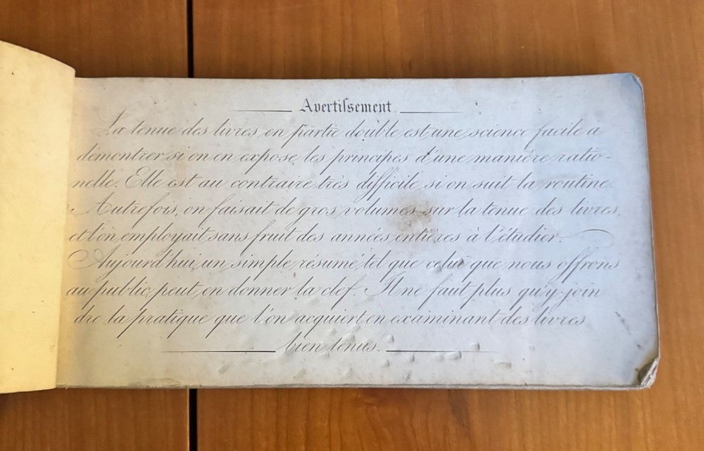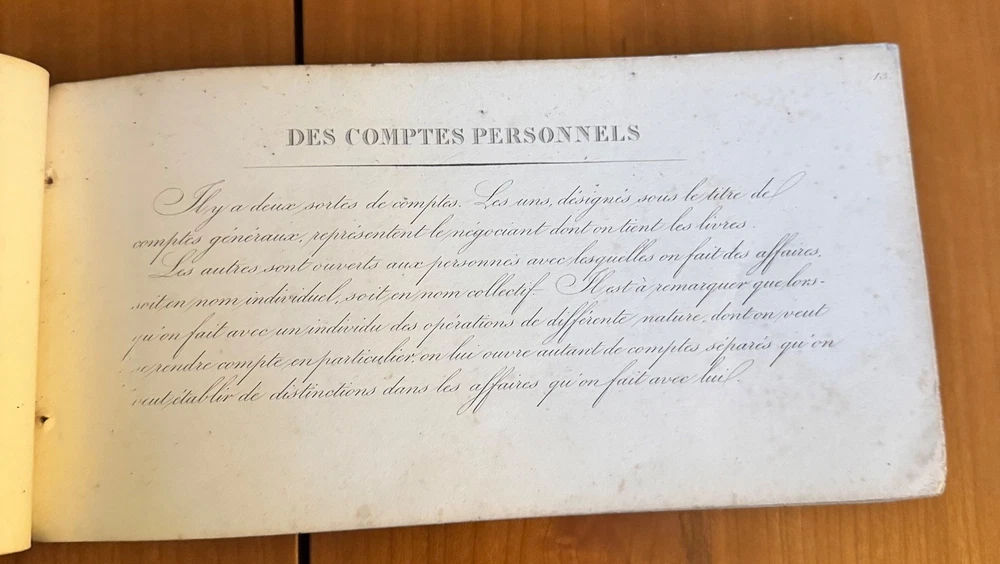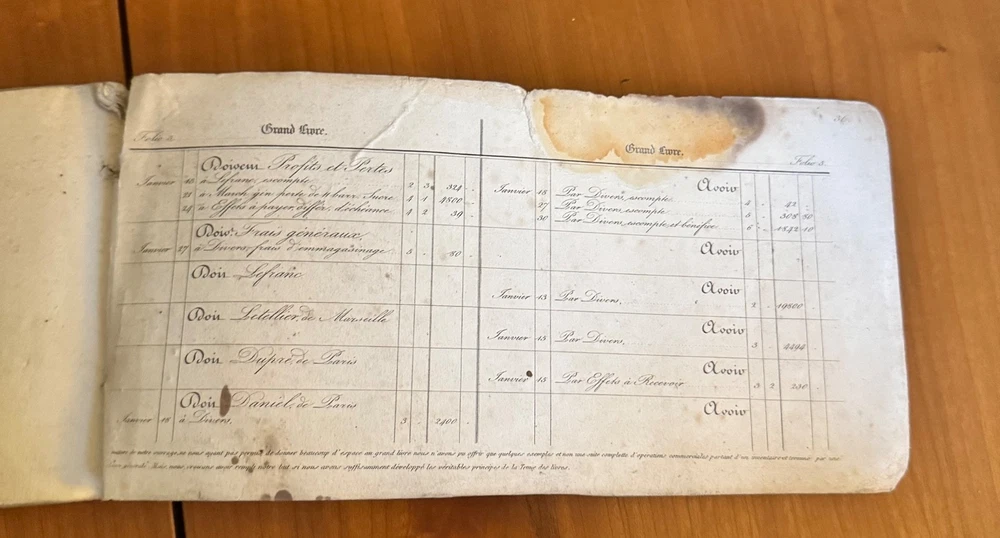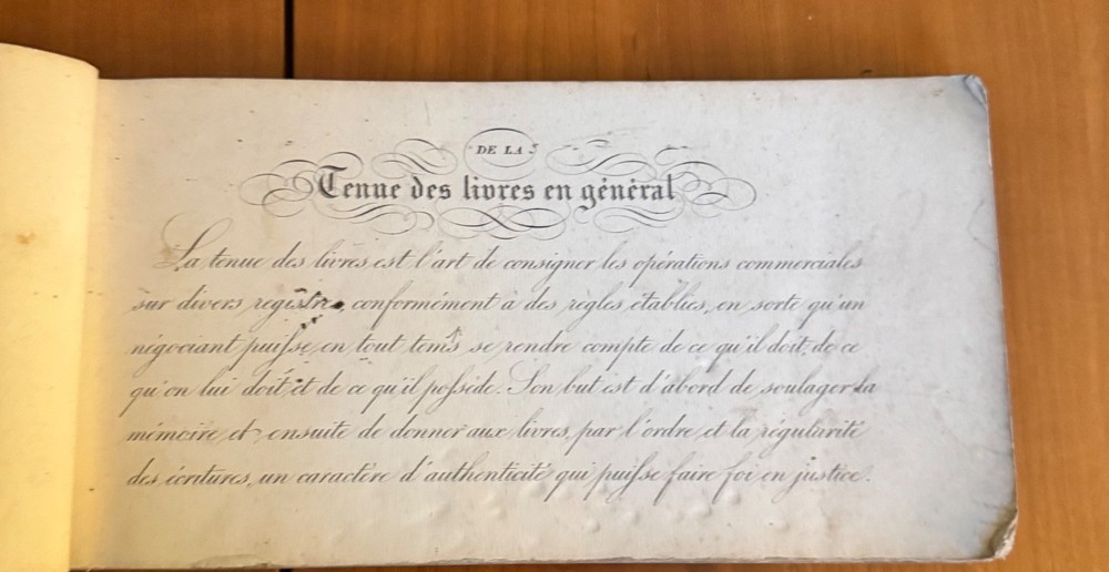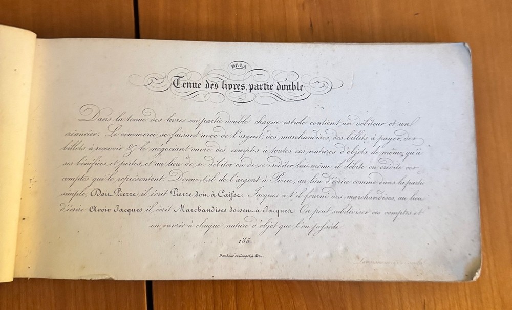 Hocquart, d’après Edmond Degrange père - Tenue Des Livres – Partie Simple & Double. Entièrement gravé. - 1825-1835 Livre Hocquart, d’après Edmond Degrange père. Tenue Des Livres – Partie Simple & Double Paris, c. 1825-1835. in 8 oblong, papier bleu-gris d’époque, usagé ; coins écrasés, taches, une auréole. Exemplaire complet. Rare cahier pédagogique mêlant texte explicatif gravé, modèles calligraphiques, et tableaux de comptabilité (Journal, Grand-Livre, Caisse, Effets, Profits & Pertes). Méthode Degrange appliquée : principes de la partie simple, partie double, comptes personnels, exemples détaillés (Letellier de Marseille, Dupre de Paris, Jacques, Mallet, etc.). Gravure soignée par Hocquart, élève de Degrange, typique des manuels commerciaux de la Restauration. Intérieur propre, gravure nette, quelques rousseurs ; l’usure extérieure n’altère pas la lisibilité. Ouvrages complets de ce type → rare survivance d’enseignement comptable ancien. Informations Nombre de livres 1 Titre du livre Tenue Des Livres – Partie Simple & Double. Entièrement gravé. Condition État raisonnable Année de publication de l’ouvrage le plus ancien 1825 Année de publication de l’ouvrage le plus récent 1835 Sujet Sciences économiques Auteur/ Illustrateur Hocquart, d’après Edmond Degrange père Édition 1ère édition Langue Français Langue originale Oui Reliure Couverture souple Nombre de pages 100