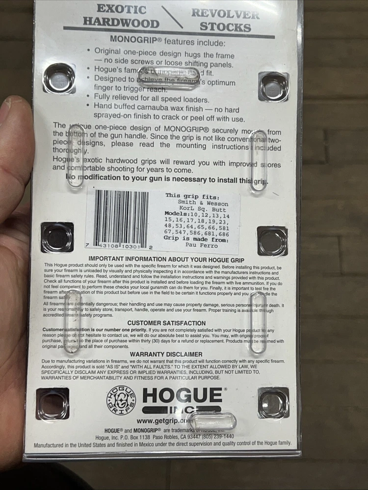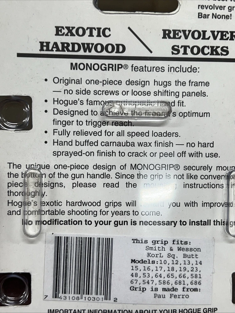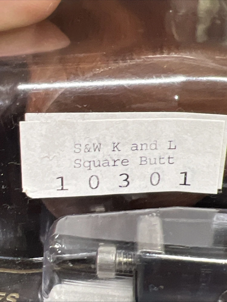 Hogue Checkered Pau Ferro Finger Groove Grip for S&W K/L-FRAME, SQUARE BUTT New unopened package Grip is for Smith & Wesson K and L Frame square butt revolvers. Fits Models: 10, 12, 13, 14, 15, 16, 17, 18, 19, 24, 48, 53, 64, 65, 66, 581, 67, 547, 576, 671, 686 Made from: Pau Derro