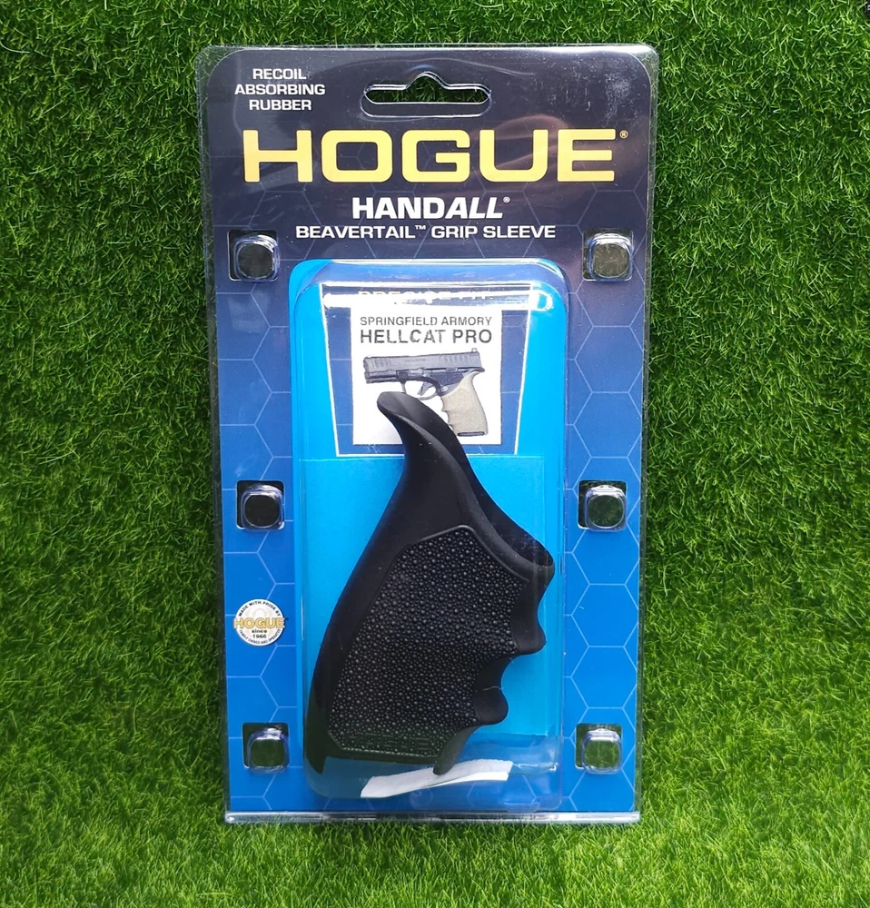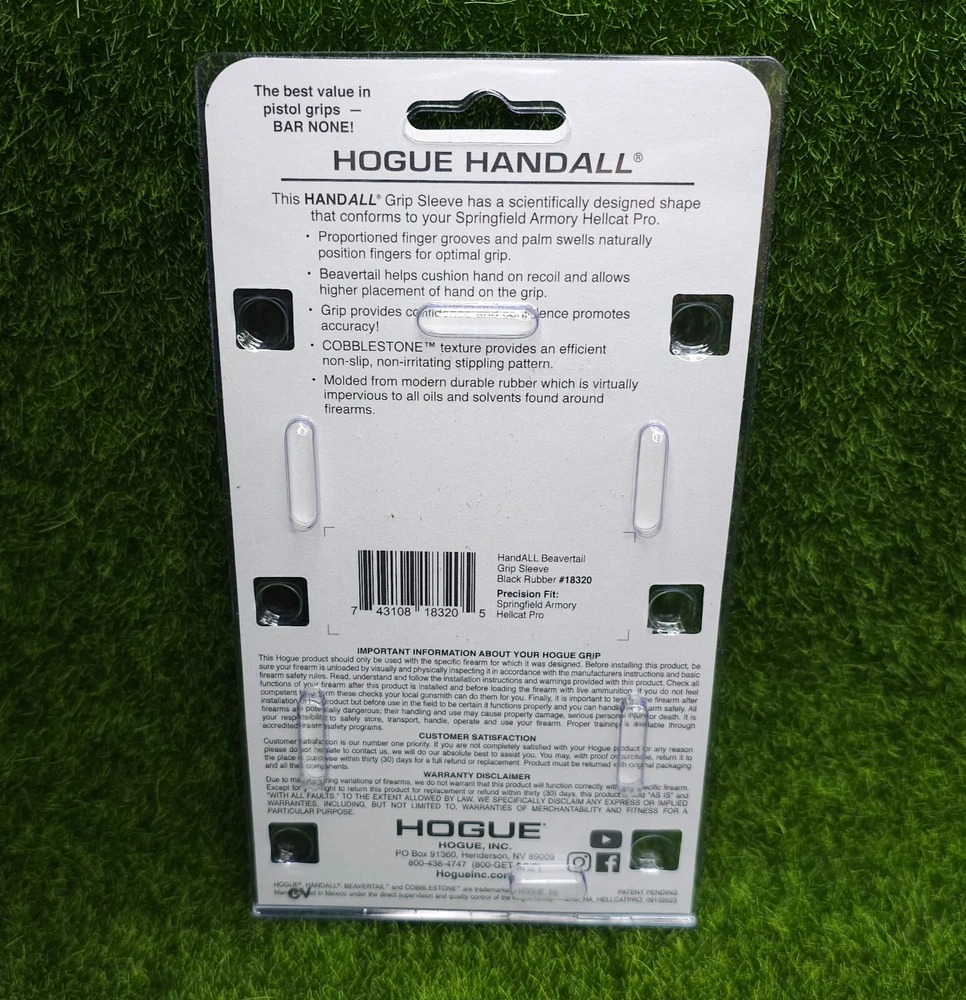 Hogue Handall Beavertail Grip Sleeve for Springfield Hellcat Pro, Black - 18320 Description Hogue's Beavertail Grip Sleeve line has been engineered with models for precision fits on specific firearms. The Beavertail Grip Sleeve is installed by slipping it over the pistol’s polymer frame until it seats perfectly into position. The sleeve is precision manufactured to provide a secure and comfortable fit. Once installed, the HandALL sleeve’s finger grooves offer instinctive handling and control of the firearm. The grooves lead into a gentle palm swell that has been carefully designed to fit naturally in the hand. The beavertail built into the grip sleeve rises high along the backstrap of the frame. This provides hand comfort higher on the grip. In addition, the beavertail also cushions the hand during recoil by providing better distribution of recoil forces. The built-in features of the grip sleeve provide comfort and confidence which in turn promote accuracy. The HandALL is built from a long-lasting durable thermoplastic elastomer compound. This rubber ages very gracefully and keeps a firm, tacky feel throughout the life of the grip. It will not harden, split or crack with age or usage. The surface is covered with Hogue’s familiar Cobblestone texture, a series of small circular bumps that provide an efficient non-slip, non-irritating grip on the rubber. Features Precision fit for Springfield Armory Hellcat Pro Material: Rubber Texture: Cobblestone Color: Black Gentle palm swells fit comfortably in hand Finger grooves naturally position fingers for optimal grip Textured with Hogue's famous Cobblestone pattern for increased comfort and grip Beavertail cushions the hand on recoil and offers increased hand comfort higher on the grip Made from long lasting durable thermoplastic elastomer that ages gracefully for years of service Designed for a tight and secure fit engaging with the texture and contours of the firearm's frame