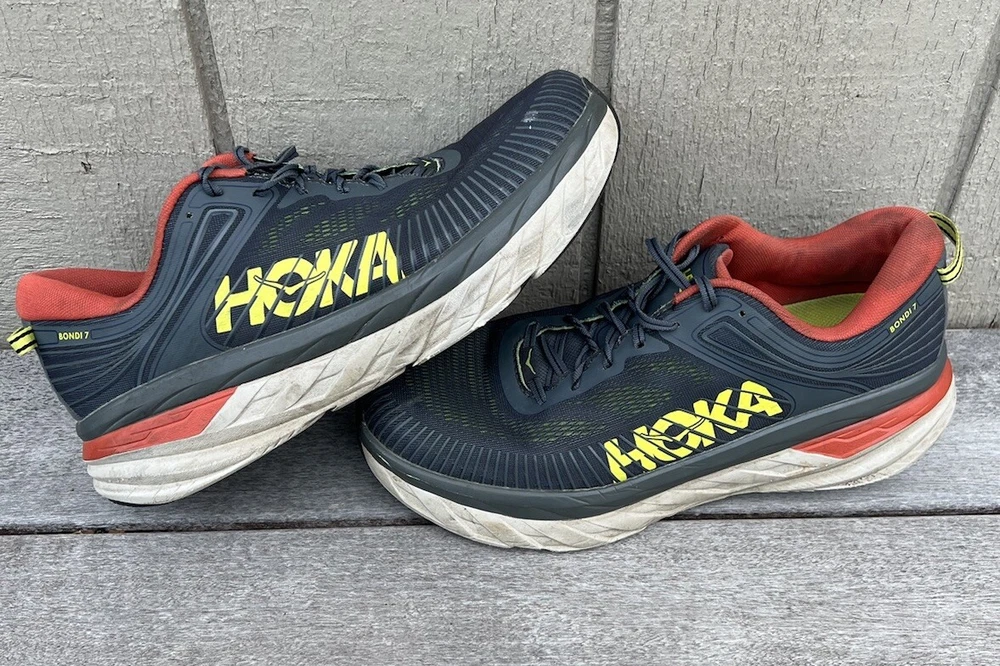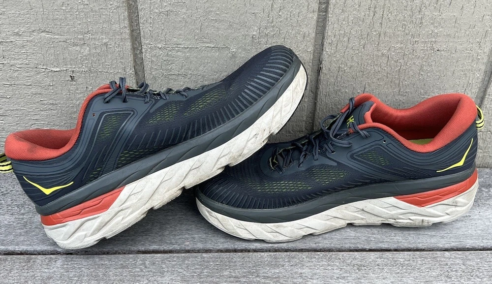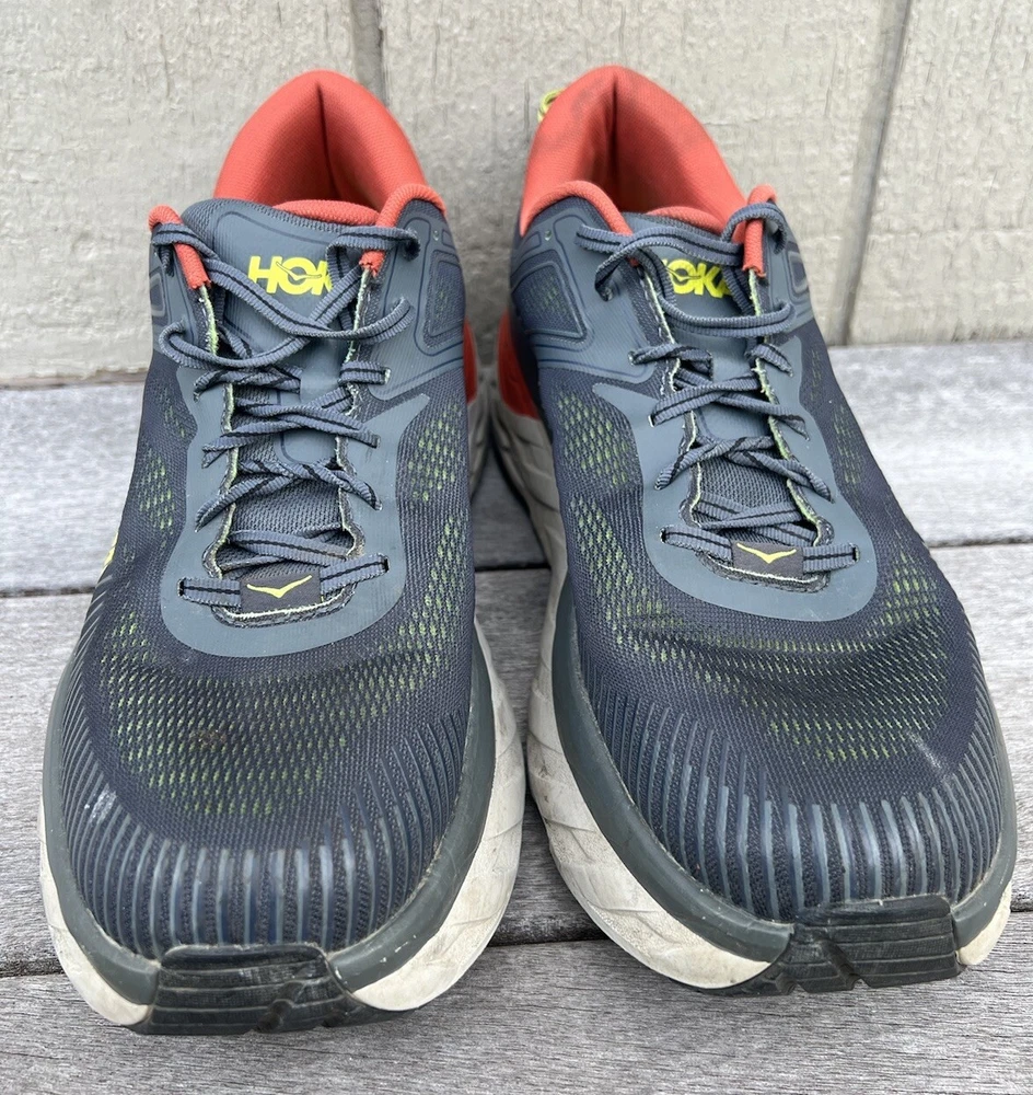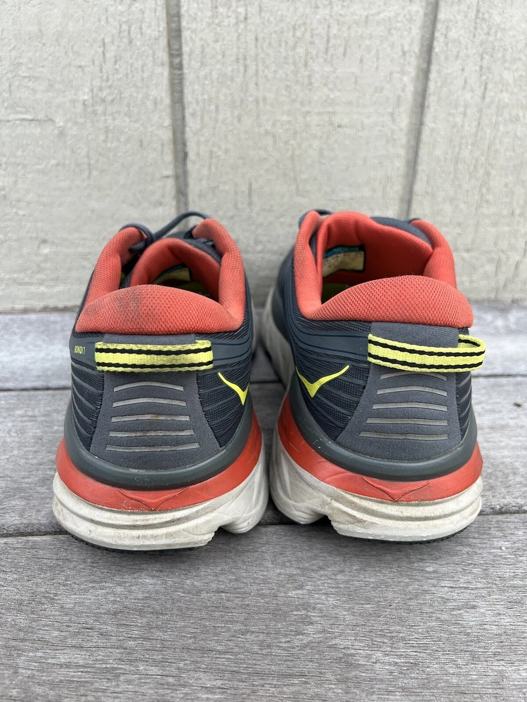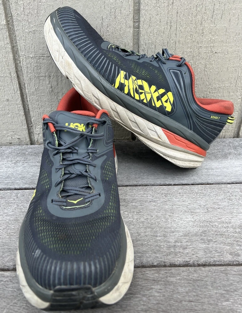 Experience ultimate comfort and quality with these Hoka One One Bondi 7 sneakers. Designed with arch support, cushioning, and breathability, these sneakers are perfect for gym and training, track and field, tennis, walking, and even for school or work. The lace-up closure ensures a snug fit while the low-top shoe shaft style and mesh upper material provide added comfort and flexibility. These sneakers come in a solid gray and orange pattern, perfect for any occasion - whether it's for activewear, casual wear, or workwear. The rubber outsole and cleat type also make these sneakers suitable for winter, summer, fall, or spring. Get yourself a pair of these Hoka One One Bondi sneakers and experience the ultimate comfort and support while you go about your daily activities. Good condition with minor heel drag. Comfortable with no tears or holes.