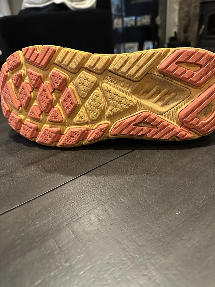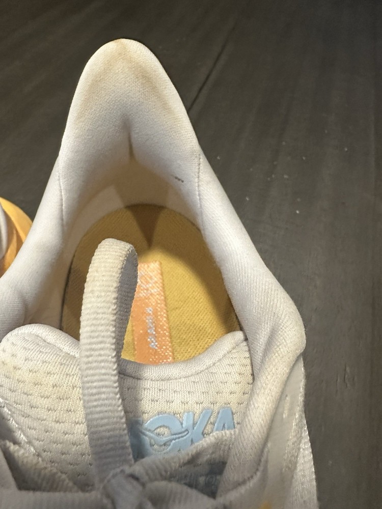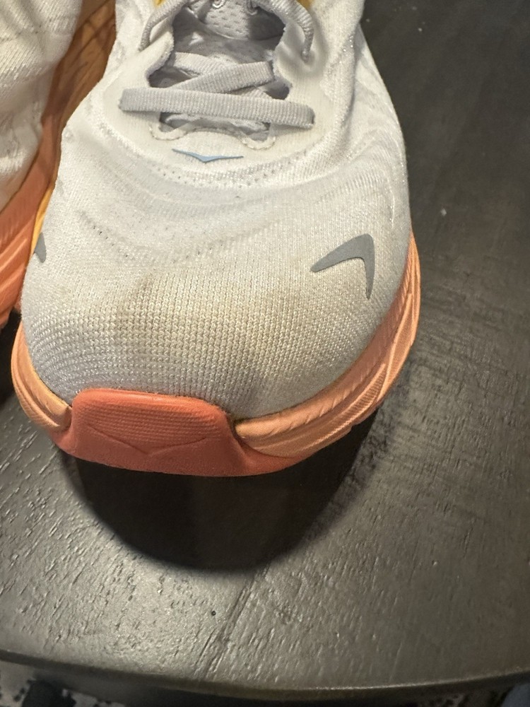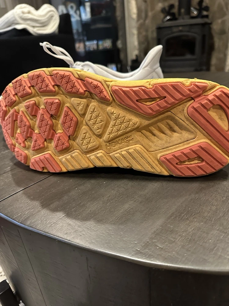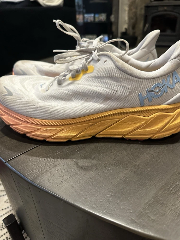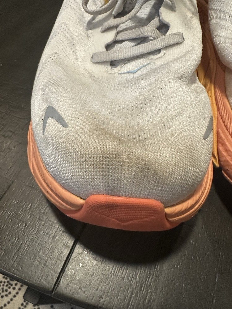 The Hoka One One Women's Arahi 6 Running Shoes in size 12D are a stylish and comfortable choice for female athletes. These sneakers feature a sleek design in white with vibrant orange accents, perfect for adding a pop of color to your workout outfit. With a breathable mesh upper and Hoka One One's signature soft cushioning, these shoes are designed to provide maximum comfort and support during your runs. Whether you're training for a marathon or just hitting the gym, the Hoka One One Arahi 6 shoes are sure to help you perform at your best in style. See pictures, there are stains and some wear and tear.