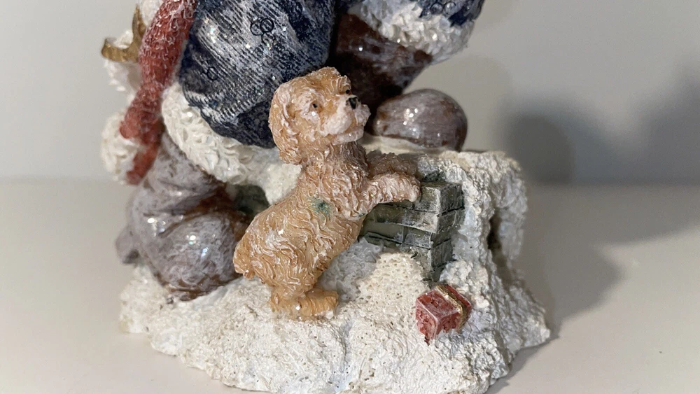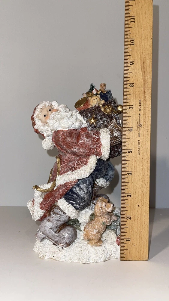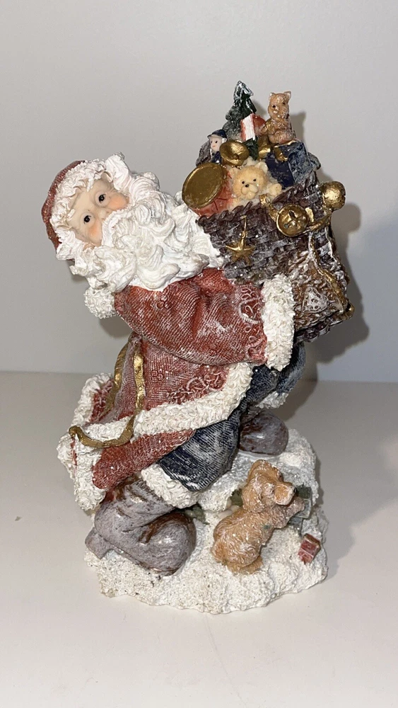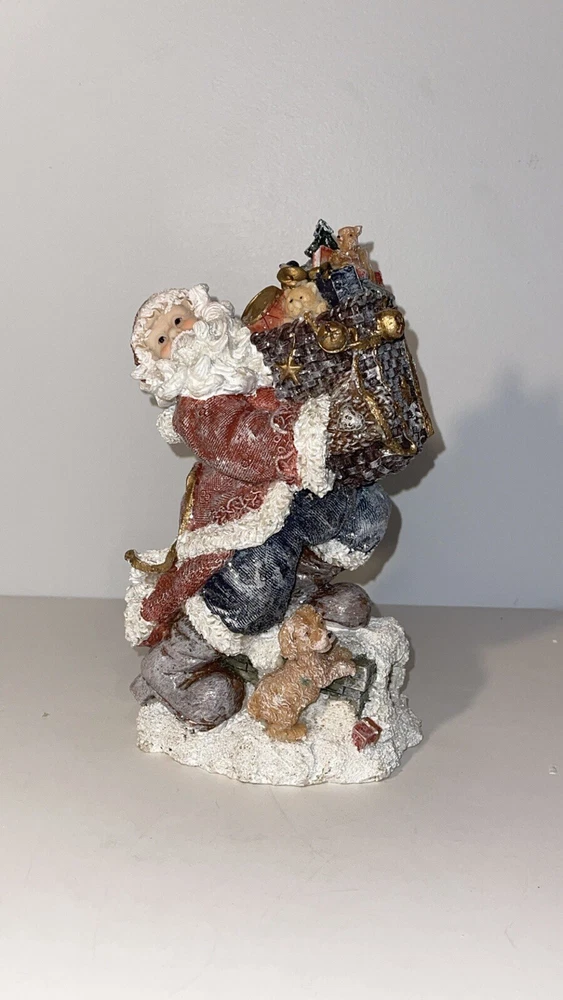 Holiday By Kirklands Santa With Gift Bag Figure Santa Figurine carrying gift bag with dog Note item does have a glitter finish, there is some slight glitter transfer when handling the product A preowned decoration, there is a noticeable green discoloring on the dog other than that its in great shape Comes in the original box, I have the figure wrapped in bubble wrap, not the original wrapping, however is it wrapped well Please ask for any extra pictures, thank you!