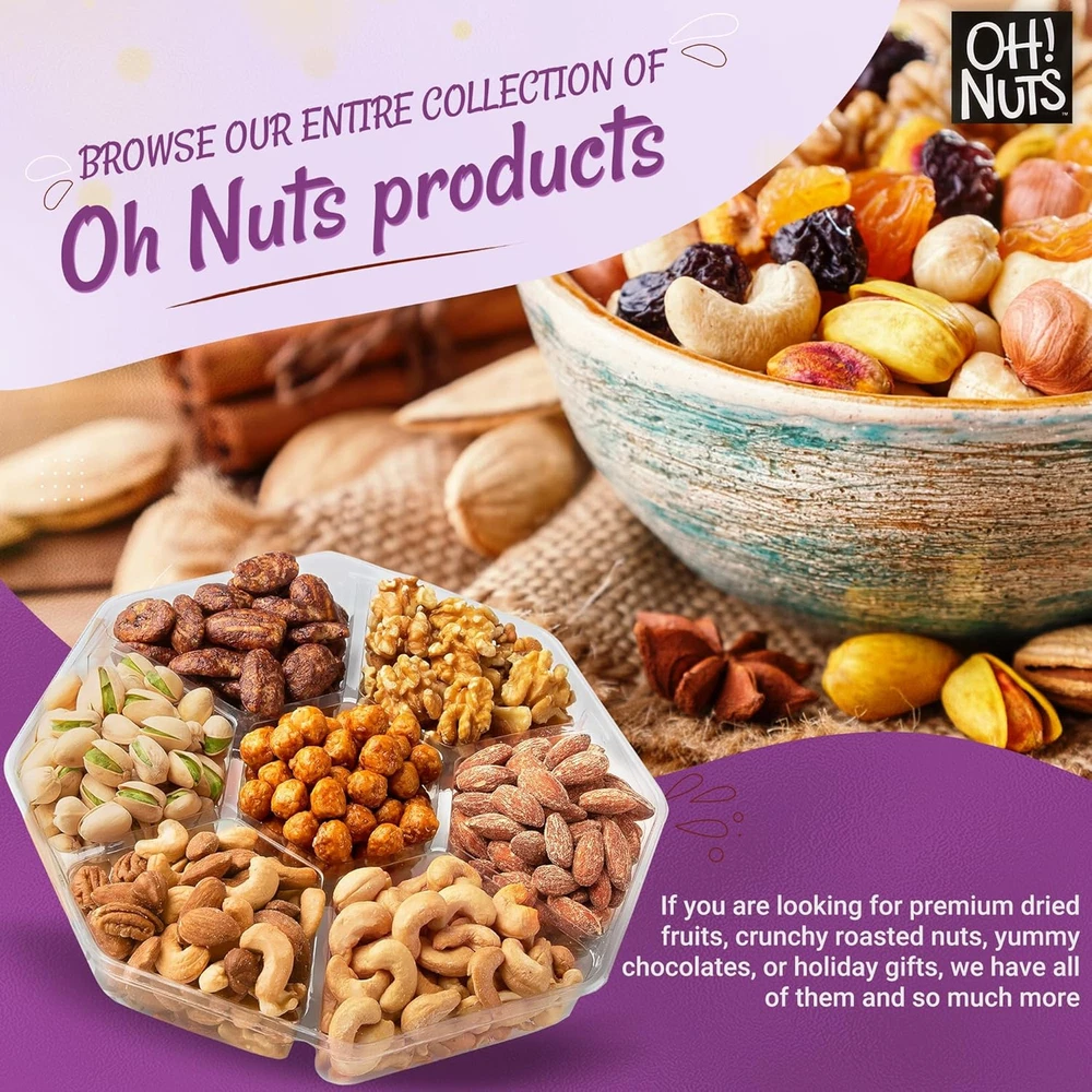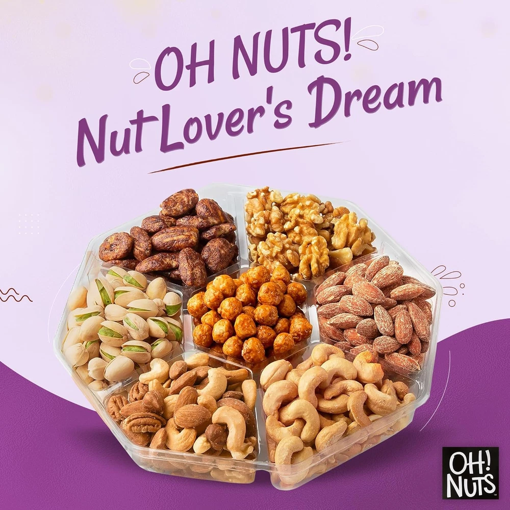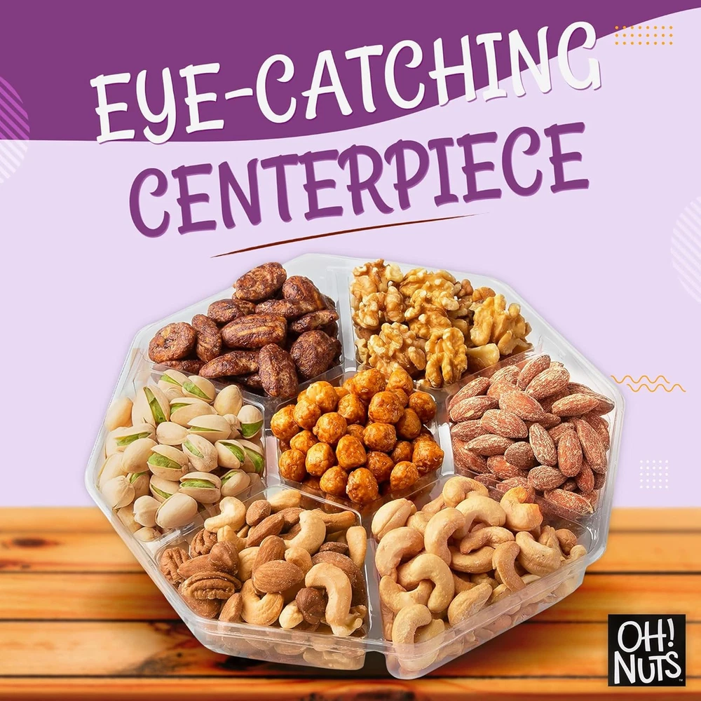 GIFT BASKET: Assorted Nuts - A perfectly balanced blend of premium roasted and crunchy nuts, offering a delicious and nutritious treat for everyone to enjoy this New Year’s holiday. 🎁 A HEALTHY GIFT THAT WILL WOW: This Oh! Nuts sectional party tray is packed full of healthy treats. Featuring an assortment of high-quality GRADE A fresh nuts, the lidded box has been neatly divided into 7 compartments. The unique blend of flavors creates a gift presentation that is both beautiful and flavorful. 🥜 DELICIOUS NUTS PACKED WITH A VARIETY OF FLAVORS: This tasty collection of sweet, salty, and savory flavors is perfect for any celebration. The raw walnuts bring a rich, savory taste, the jumbo cashews are roasted to perfection, and the pistachios are nutty with earthy undertones. Great for Thanksgiving, birthdays, or as a thoughtful get-well gift, this gourmet food basket is suitable for everyone, from aduls to kids, making gatherings special for all. ♨ FRESHLY ROASTED IN SMALL BATCHES FOR EXQUISITE FLAVOR: Each type of nut—jumbo cashews, honey pecans, and smoky almonds—is carefully roasted to enhance its taste. This gluten-free, diabetic-friendly, and Kosher gift basket is an inclusive treat that everyone—men, women, teens, and kids—can enjoy. Ideal for holiday gifting, hosting events, or as a surprise for parents or couples, it’s a delicious way to share a healthy snack. ✅ 🛒 🎁 REMEMBER TO CHECK THIS BOX "This is a gift": Adding a personal message makes any gift memorable. Perfect for Black Friday, Mother’s Day, or corporate gifting, checking "This is a gift" shows you care. Thoughtfully packaged, this elegant nut platter is a great way to share joy with colleagues, family, and friends on any special occasion. Product Description Holiday nuts, all wrapped up and pretty with a bow. Premium nuts, superior taste, great nut gift tray to great the Season in a merry and healthy way. Wonderfully healthy corporate gift giving.