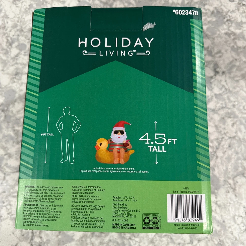 UPC:0191245839491Color:MulticolorArea of Use:Lawn, Porch, Balcony, Flower BedFeatures:Airblown, Inflatable, LEDCountry of Origin:Cambodiagtin13:0191245839491Indoor/Outdoor:Indoor & OutdoorOccasion:ChristmasMPN:6023478Year Manufactured:2025Type:InflatableTime Period Manufactured:2020-NowSubject:SantaBrand:Holiday Living