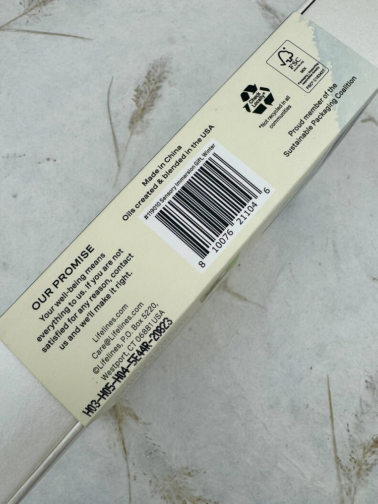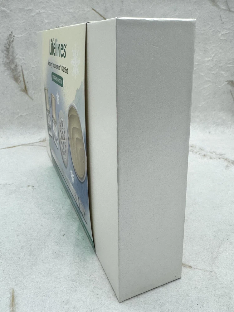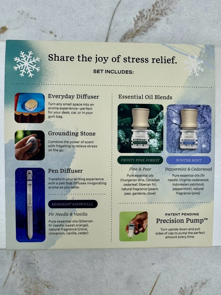 ð¿ Lifelines Gift Set Holiday Sensory Immersion NEW. ð¿ Product Details â¢The perfect gift for the person who has everything â¢Comes in a beautiful gift box â¢Everyday Diffuser for small, enclosed places; perfect for a car, closet, or gym bag â¢Grounding Stone combines power of fidgeting with scent to create multi-sensory experience â¢Pen diffuses âMidnight Snowfallâ Essential Oil Blend with notes of Fir Needle & Vanilla â¢Includes two bottles of Lifelines Essential Oil Blends â Frosty Pine Forest (with notes of Pine & Pear) and Winter Mint (with notes of Peppermint & Cedarwood) â¢Innovative Precision Pump dispenses the perfect amount of oil every time â¢Blends are free from parabens, phthalates, dyes, and formaldehyde ð¿ Description ð¿ð¿ Share the joy of stress relief with our Winter Edition Sensory Immersion Gift Set. The beautiful box features some of Melissaâs favorite diffusers and Essential Oil Blends designed to switch on your bodyâs most effective stress relieversâyour senses. Includes Everyday Diffuser, Grounding Stone, Pen Diffuser, and 2 bottles of Lifelines Essential Oil Blends from our Frosty Pine Forest and Winter Mint scent. ð¿ð¿ This is a great gift idea and oils are very nice. I own one of these sets and love it! ð¿ Please view photos for closer inspection and more details. Thanks for shopping ð¿